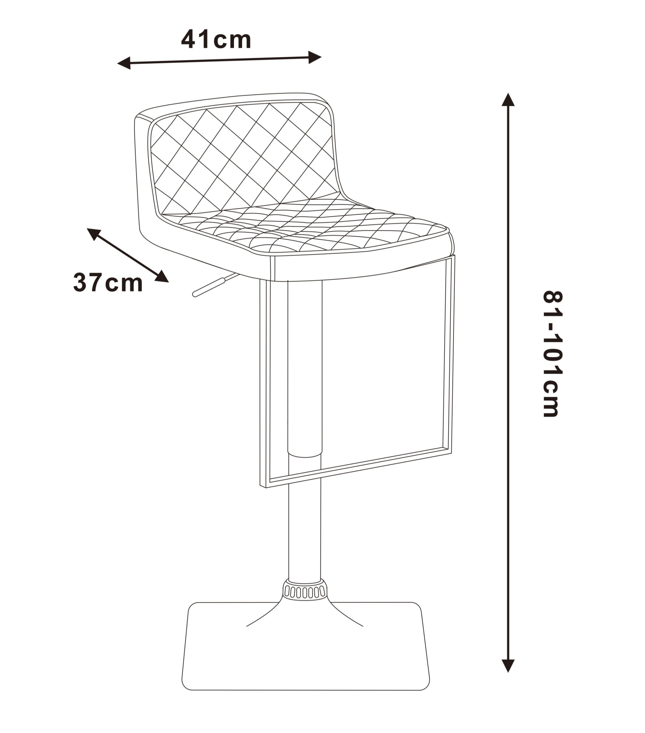 Praktičen barski stol z nastavljivo višino in vrtilno funkcijo, na voljo v povsem črni barvi s kromiranim podnožjem. Sedež ima oblazinjenje iz umetnega PU usnja, prešito z okrasnimi šivi v obliki diamantov. Stol ima za dodatno udobje tudi nizek naslon za hrbet. Podnožje stola je izdelano iz kovine. Stol je opremljen tudi z naslonjalom za noge, za bolj udobno sedenje. Maksimalna nosilnost barskega stola je 120 kg.