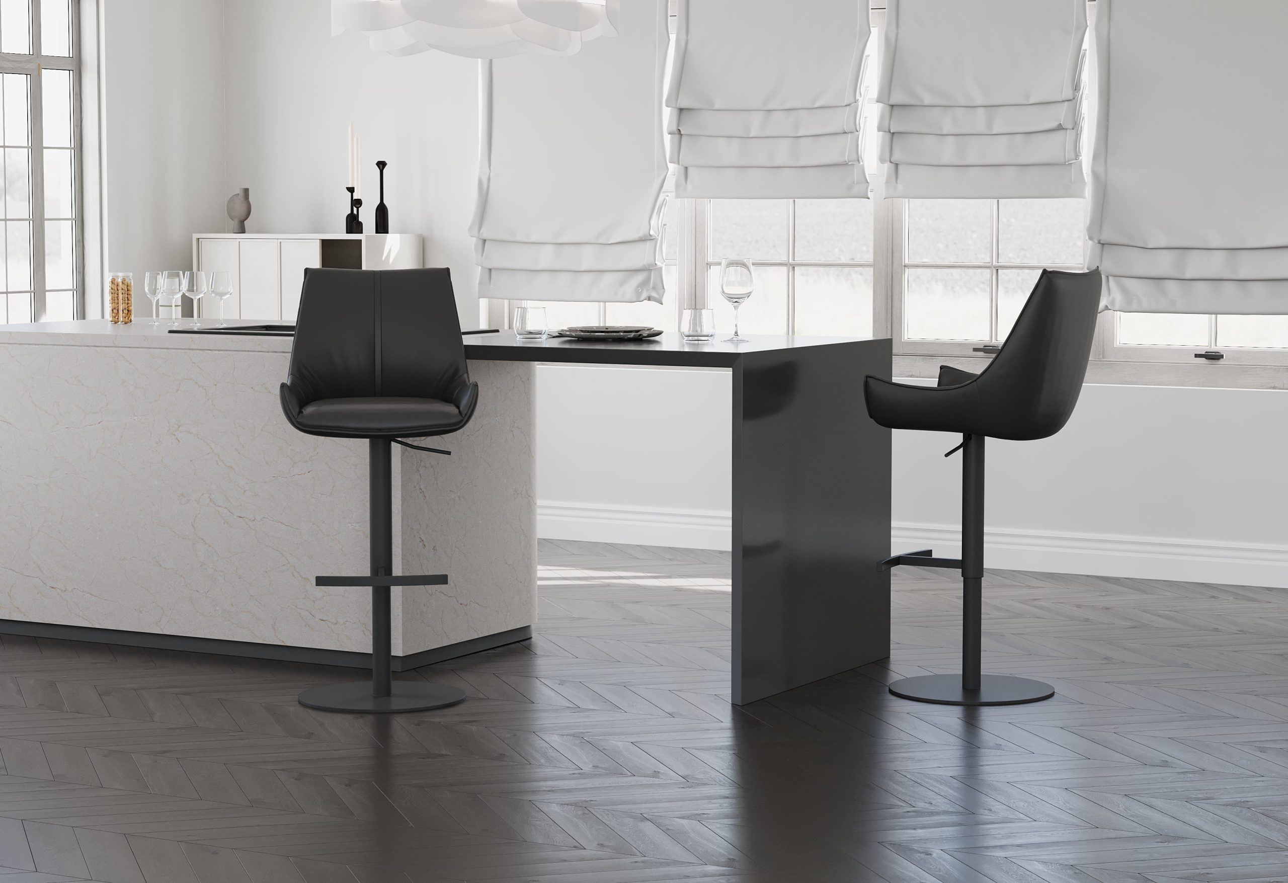 Praktičen barski stol, na voljo v rjavi ali črni barvi. Stol je poljubno vrtljiv in nastavljiv po višini, s plinskim dvigalom v glavnem stebričku. Sedišče in hrbtišče stola sta oblazinjena z kravjim usnjem ki nudi visoko odpornost na madeže ter enostavno vzdrževanje.