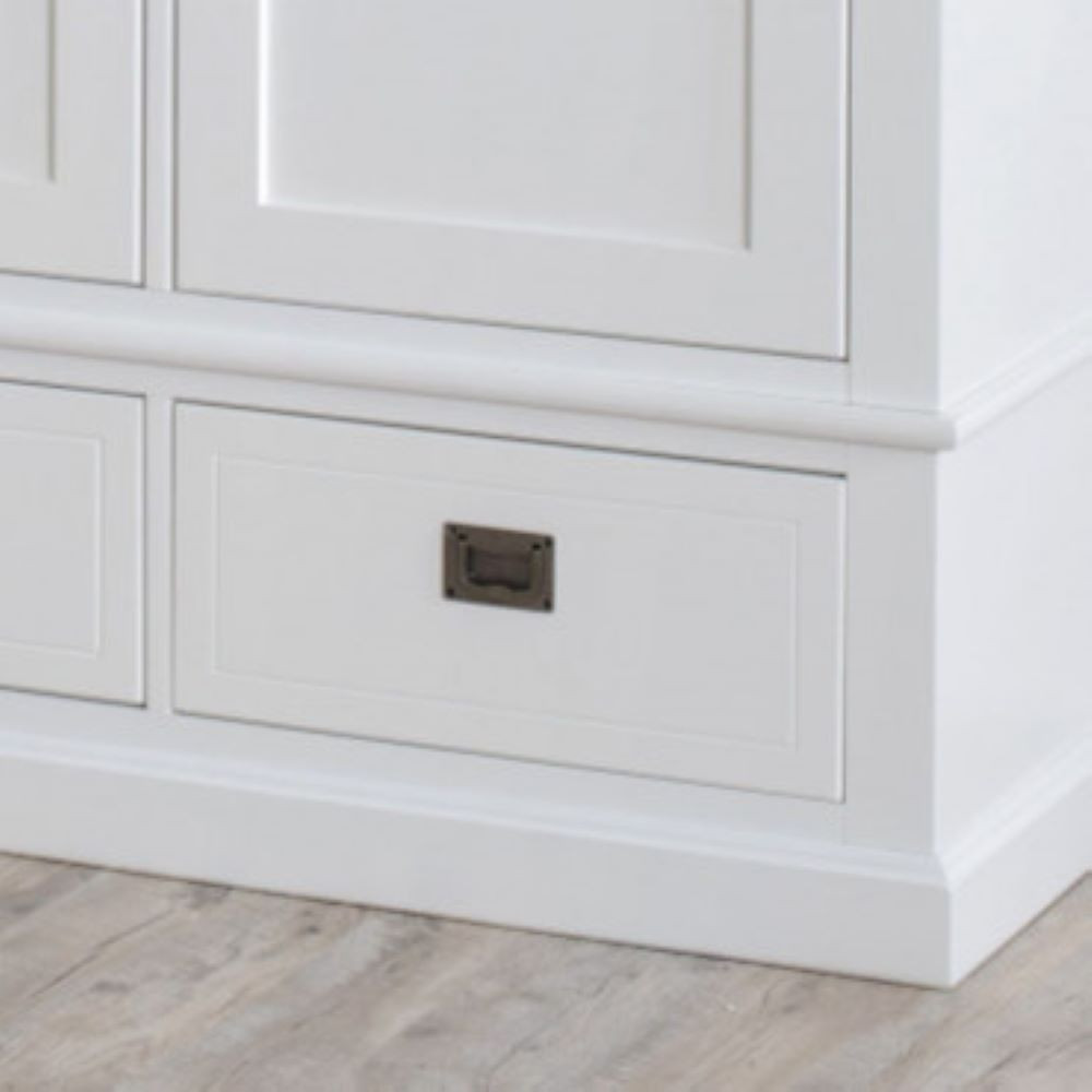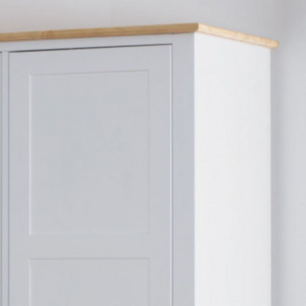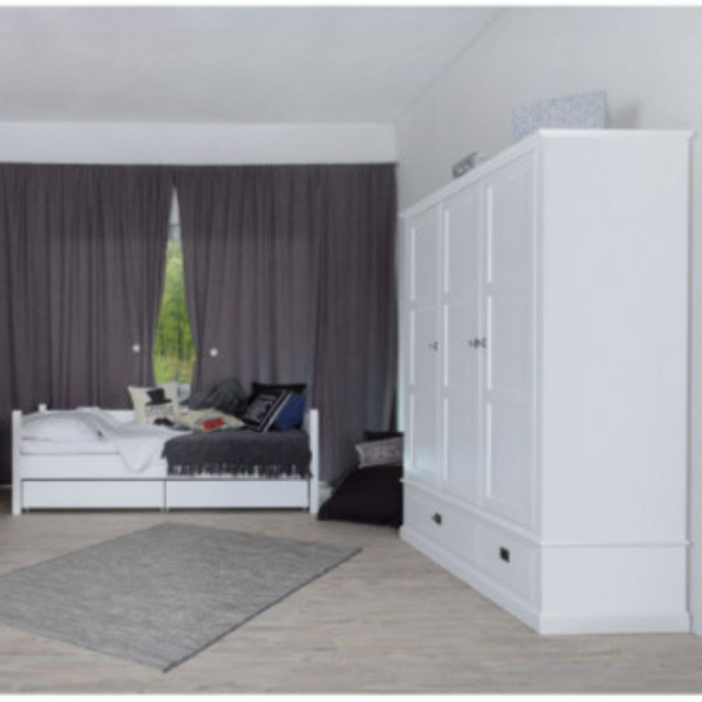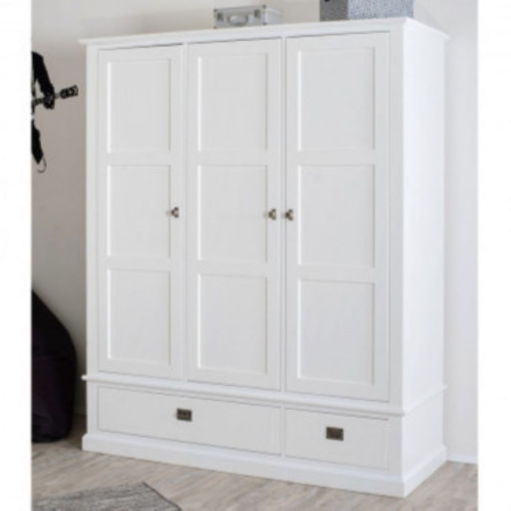 Velika in prostorna omara, ki zagotavlja pregledno in dobro orgnaizirano shranjevanje. Garderobna omara v klasičnemu stilu s poudarjenimi robovi in profiliranimi vratci, je narejena iz masivnega lesa bukve in mediapana. Barvana je v belo barvo. Spodaj ima dva predala, enega večjega in enega manjšega. Predala imata ročaja v obliki držala v srebrni kovinski barvi. Zgoraj se nahajajo tri krilna vrata z ročaji v obliki gumba. V notranjosti je 6 polic in tri obešalne letve. Vrata in predalniki imajo počasno (tiho) zapiranje.