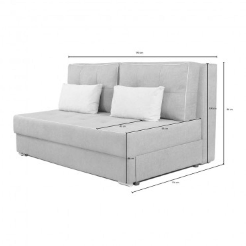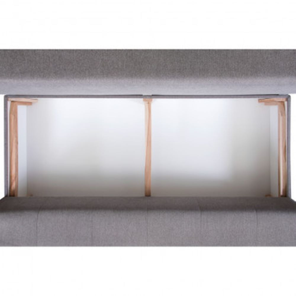 Kompakten trosed, opremljen s pokritim zabojem za shranjevanje in pomožno posteljo. V celoti je oblazinjen v mehko tkanino v sivi barvi, sedišče je napolnjeno z bonell vzmetenjem za večje udobje. Tkanina je popolnoma vodoodporna, skladna z evropsko direktivo REACH glede kemikalij, izdelana iz 100% poliestra, s povprečno gostoto 370g/m².