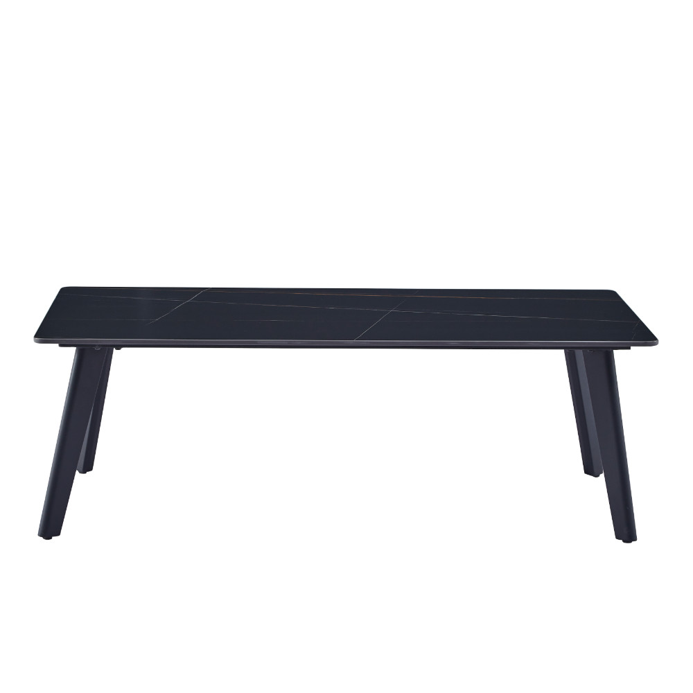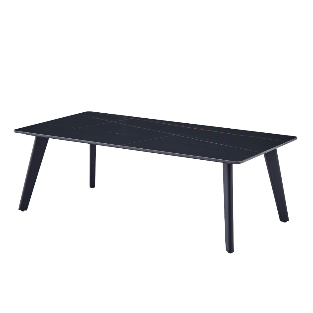 Klubska miza s ploščo iz sintranega kamna, z vzorcem mat črnega marmorja na črnem kovinskem podstavku.