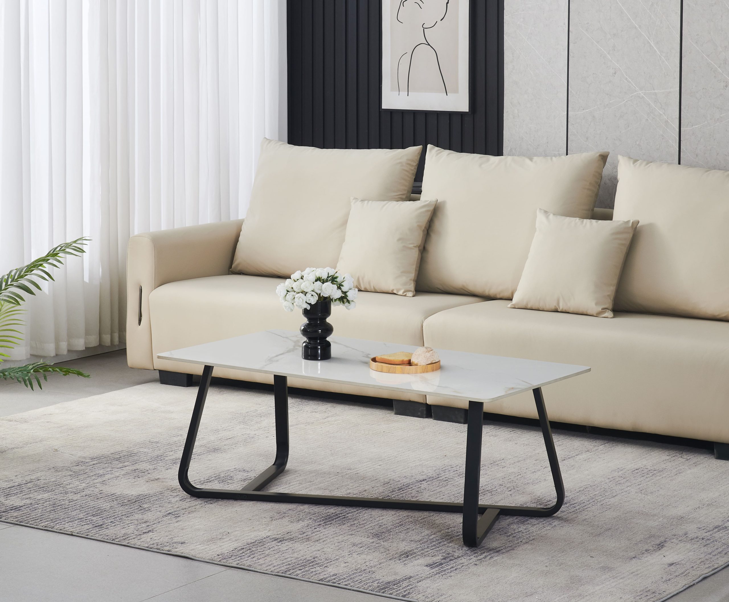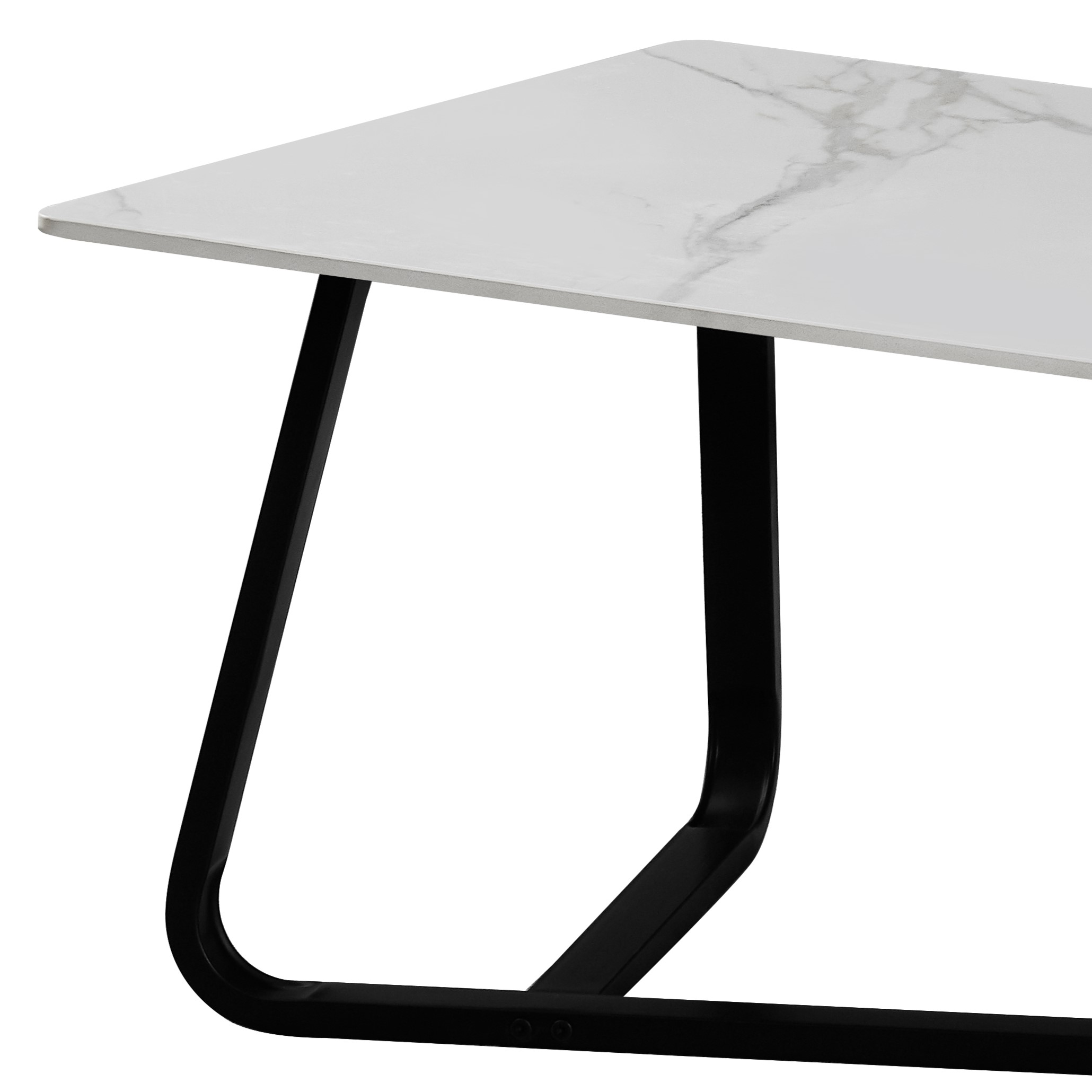 Klubska miza s keramično mizno ploščo pravokotne oblike. Mizna plošča je na voljov v povsem sivi barvi ali v prelepi beli barvi marmorja z zlatimi žilami ter z zaobljenimi robovi za bolj prijeten, mehkejši videz. Plošča je debela 11 mm in je narejena iz sintranega kamna.