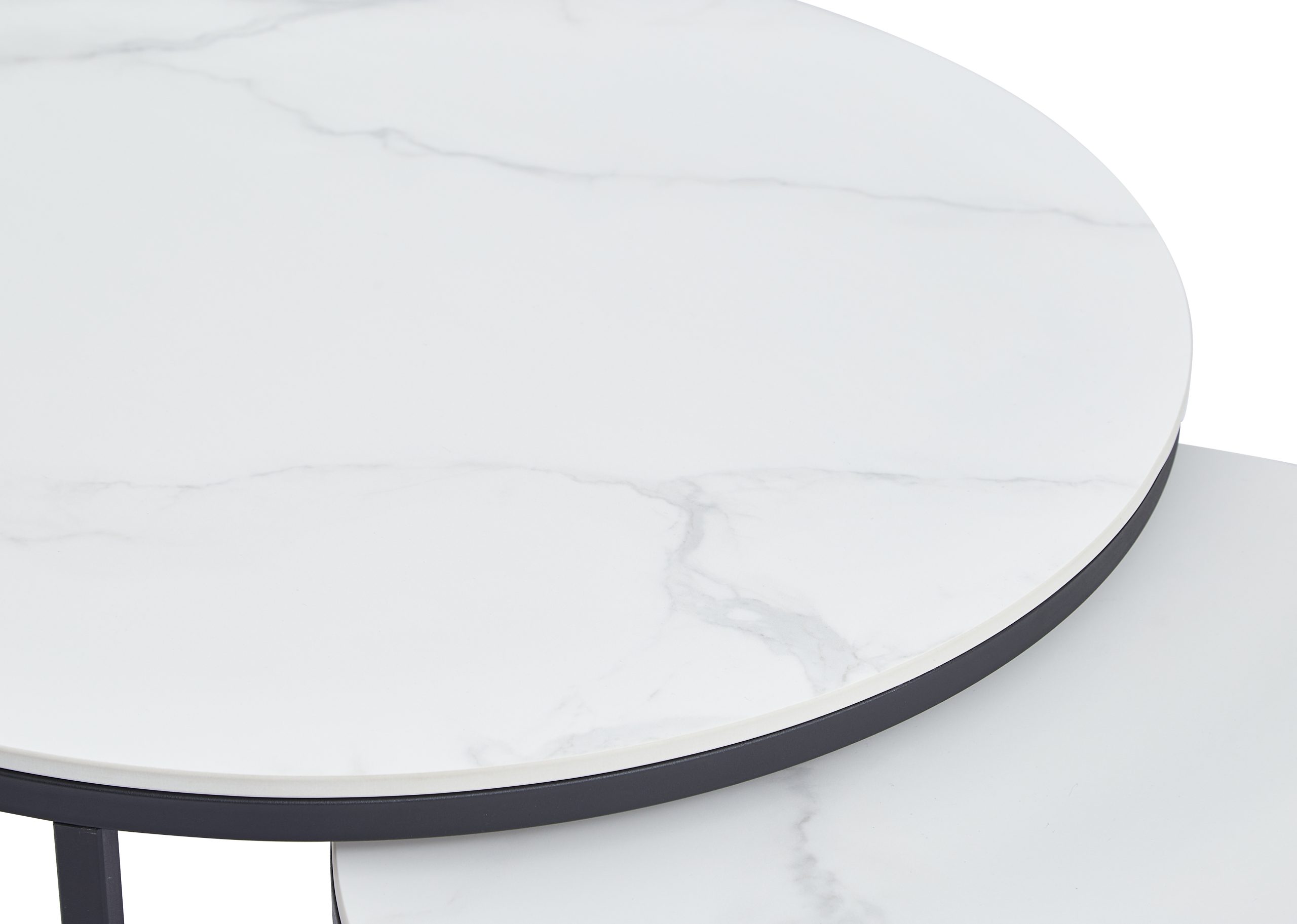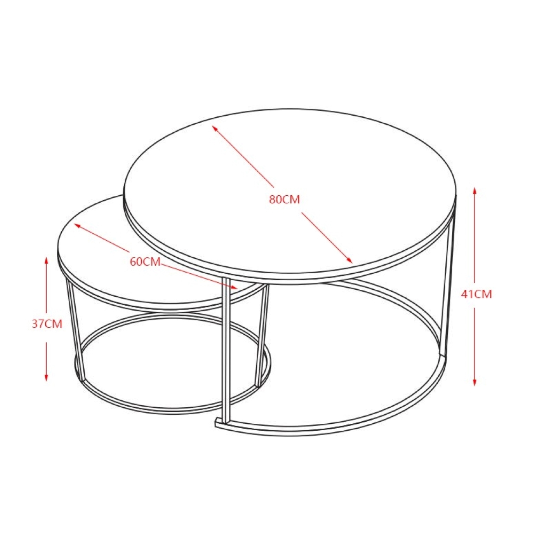 Set sestavljata dve mizici različnih velikosti. Večja miza je visoka 41 cm in ima premer 80 cm, kar zagotavlja dovolj prostora za okrasne predmete, pijače ali druge vsakdanje predmete. Manjša miza višine 37 cm in premera 60 cm je oblikovana tako, da brezhibno zdrsne pod večjo mizo in tako zavzame manj prostora, ko ni v uporabi. Ne glede na to, ali se uporabljajo skupaj kot večdleno središče dnevne sobe ali posamično v duge namene, te mize ponujajo tako prilagodljivost, slog in funkcionalnost.