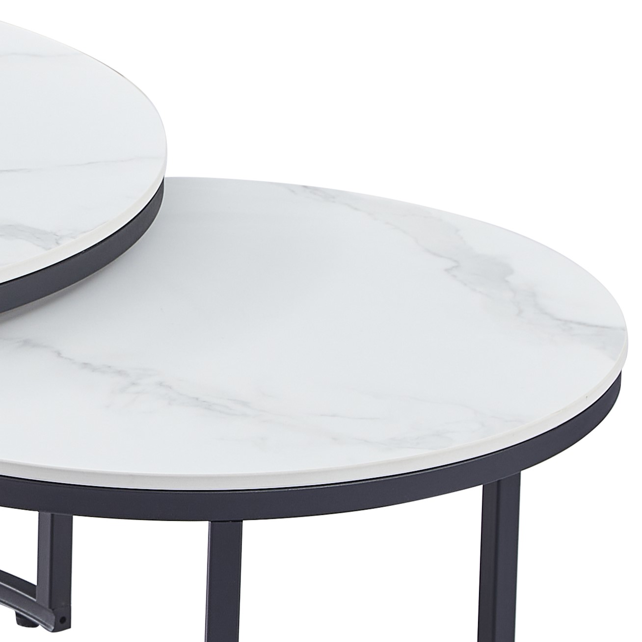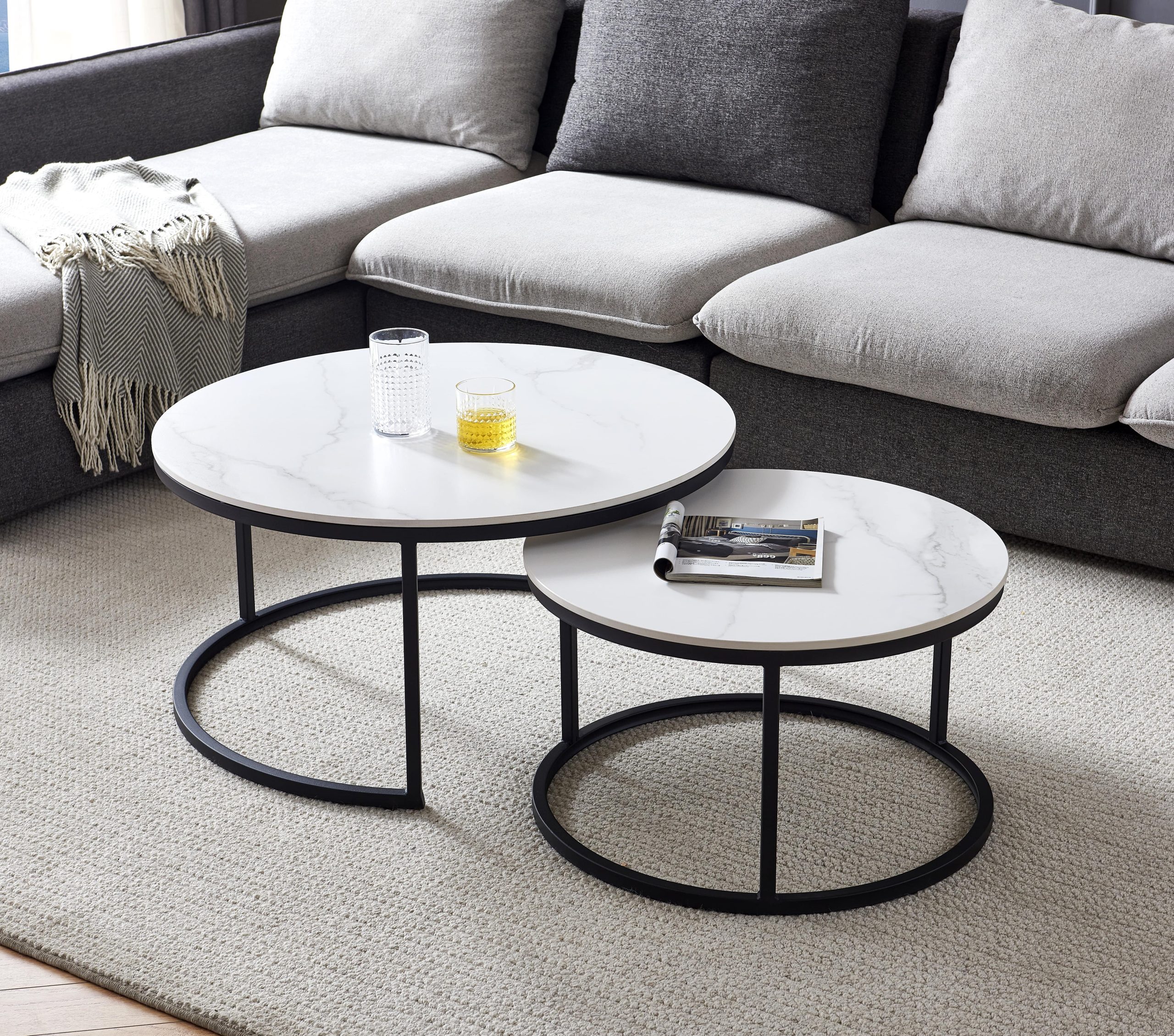 Set dveh klubskih miz okrogle oblike, z miznimi ploščami v imitaciji marmorja, ki združujejo sodobne materiale in funkcionalnost s pridihom stare klasike.