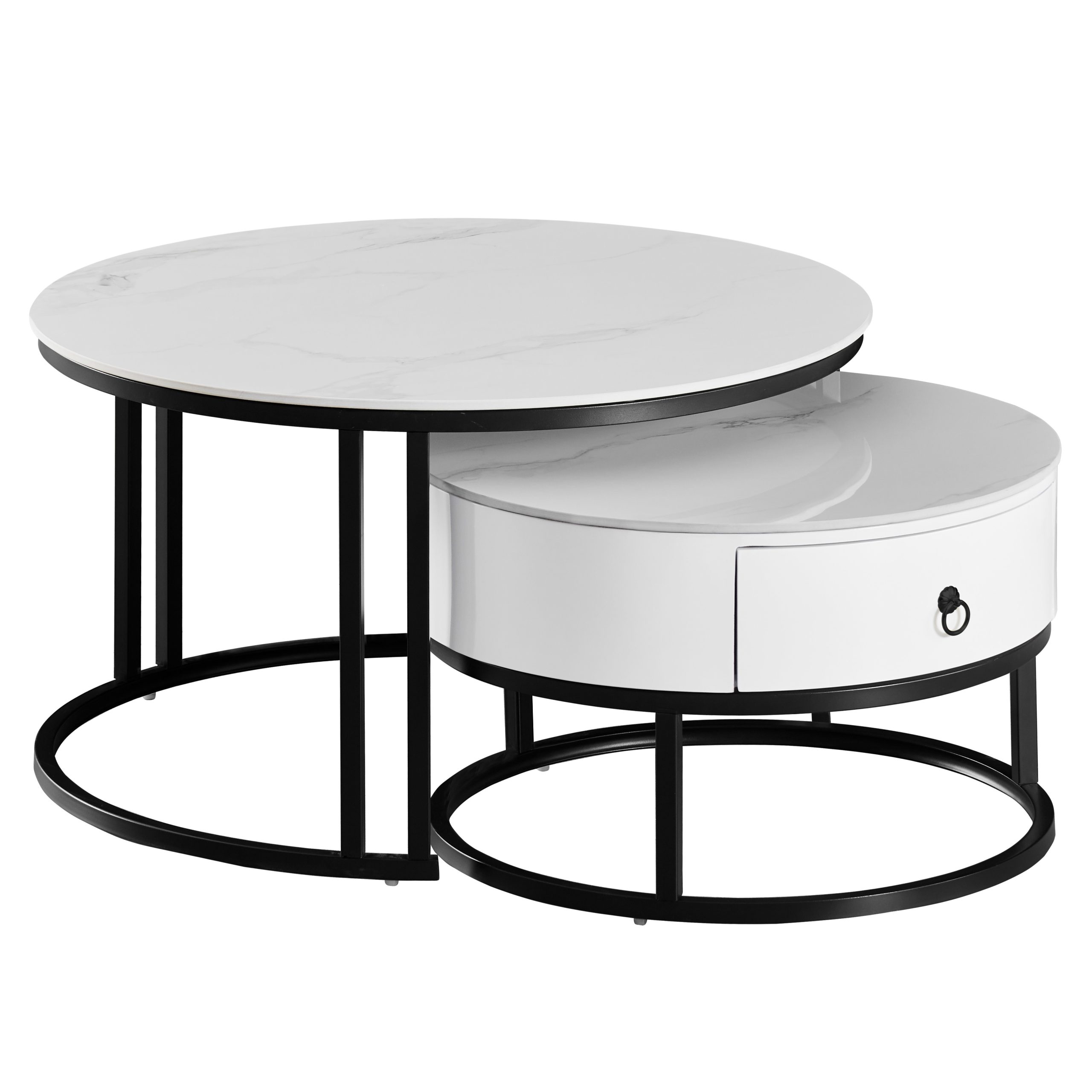 Set dveh keramičnih klubskih miz ki se brezhibno prilegata ena pod drugo in tako omogočata različne možnosti postavitve, obe v beli barvi s prelepim vzorcem marmorja.