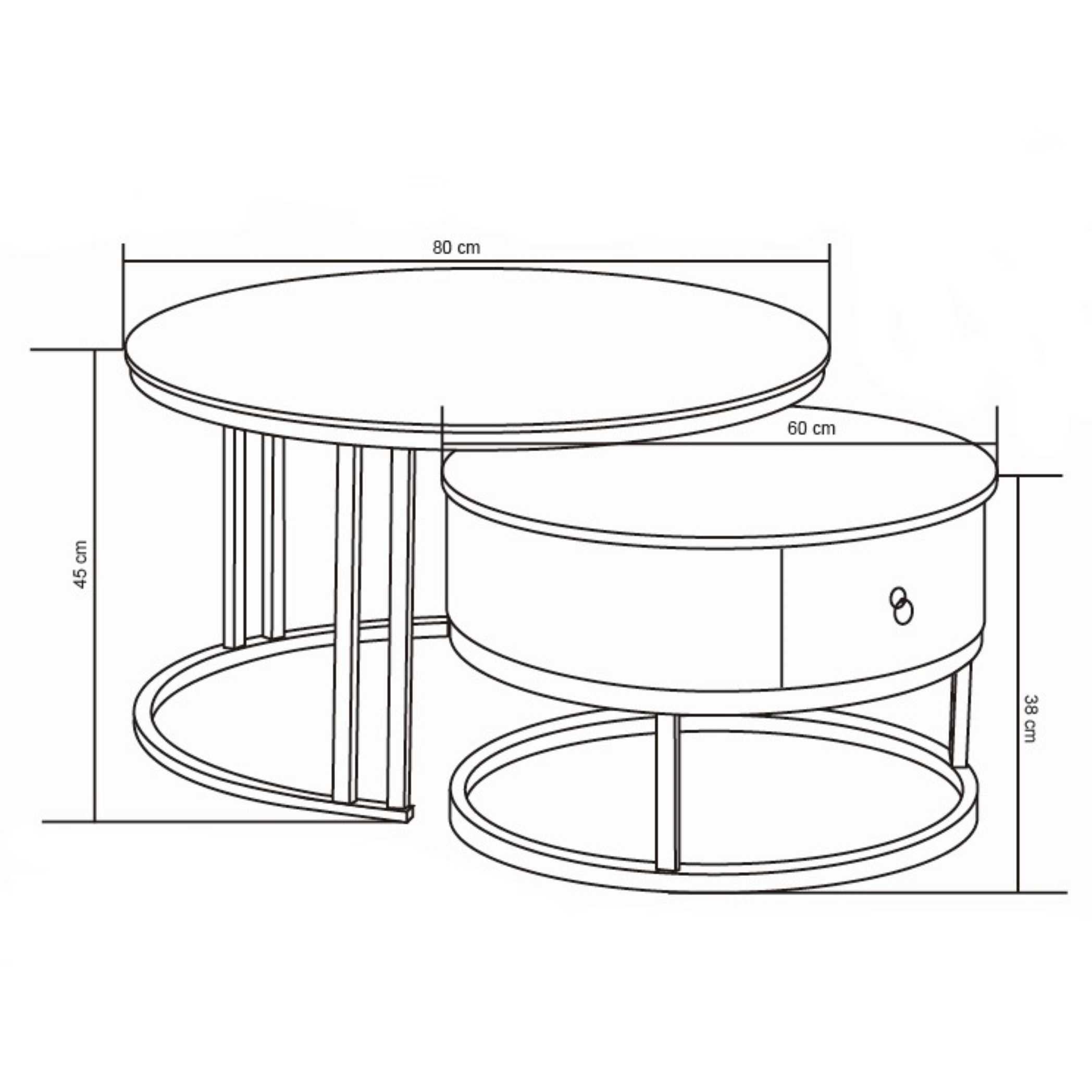 Večja miza ima premer 80 cm in je visoka 45 cm, manjša miza pa ima premer 60 cm in je visoka 38 cm. Manjša miza, zasnovana tako da lahko zdrsne pod večjo, vključuje še vgrajen predal za shranjevanje ki omogoča diskretno shranjevanje osnovnih stvari, kot so daljinski upravljalniki, podstavki za kozarce ali revije, tako da je vaš dnevni prostor čist in organiziran.
