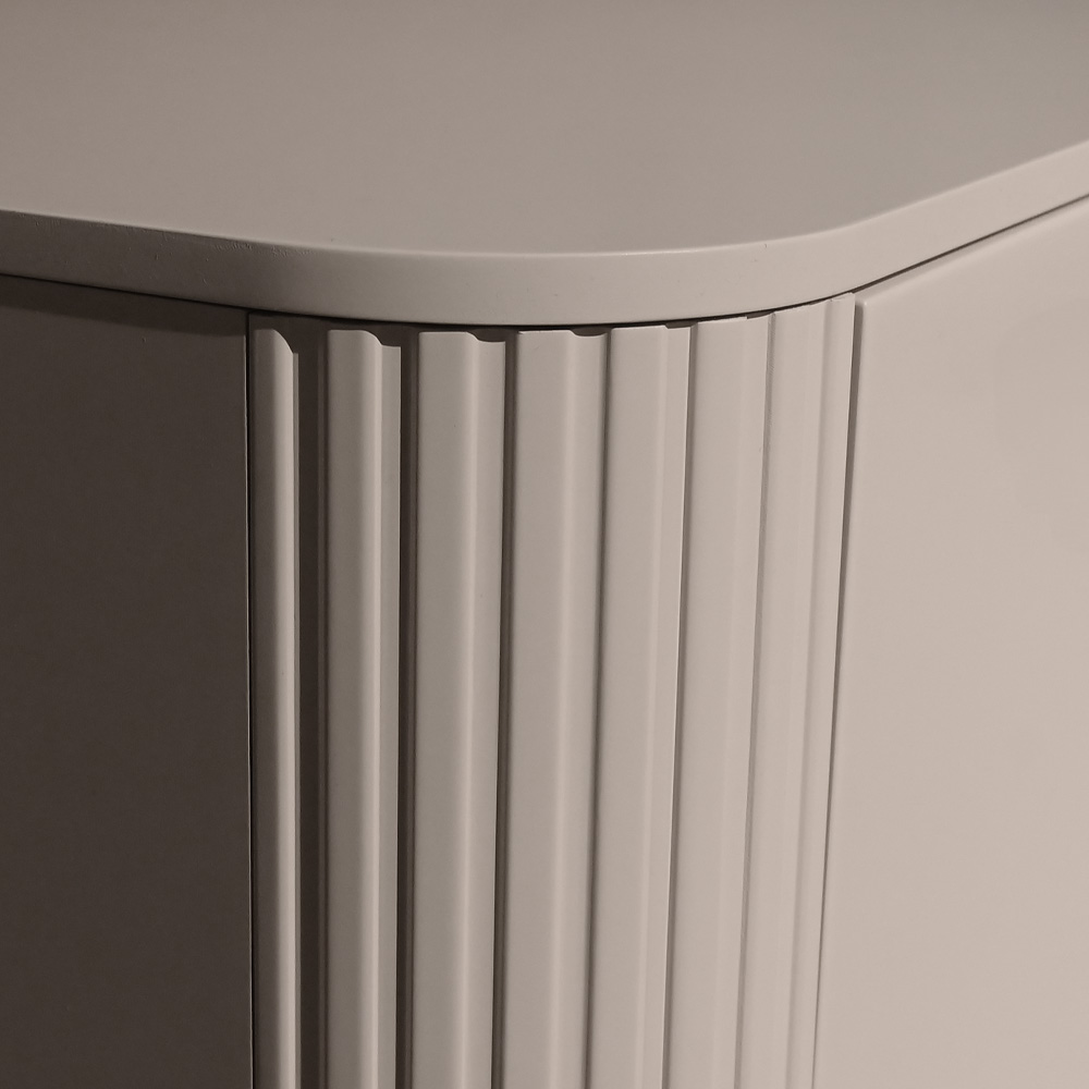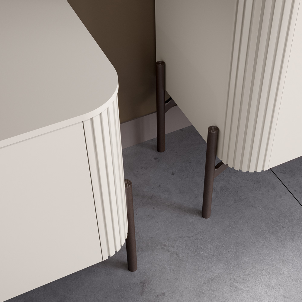Teksturirane, navpično rebraste frontne plošče dodajo vizualno globino in dinamičnost, medtem ko vitki temni kovinski okvirji in noge zagotavljajo stabilnost in sodoben kontrast.