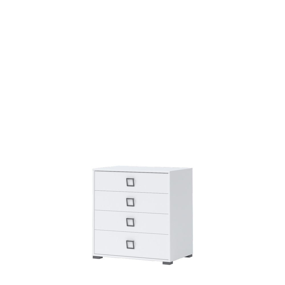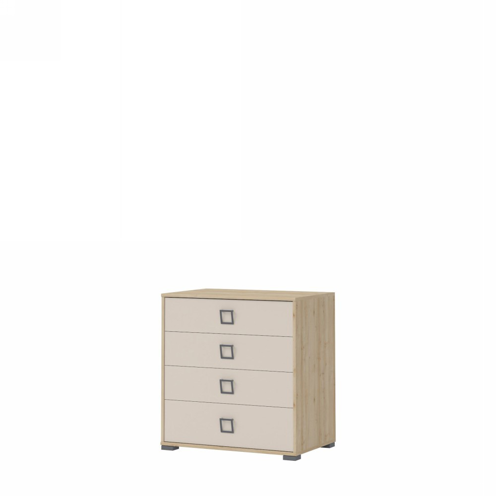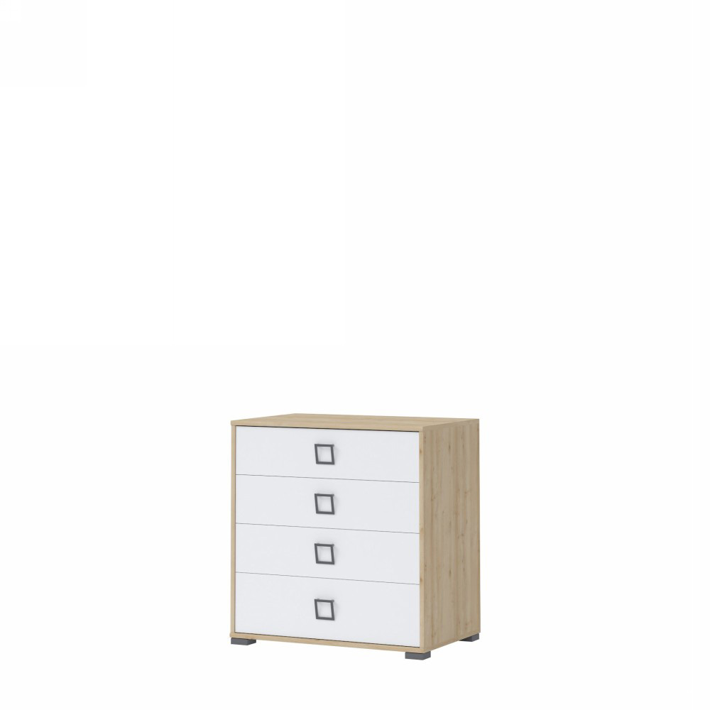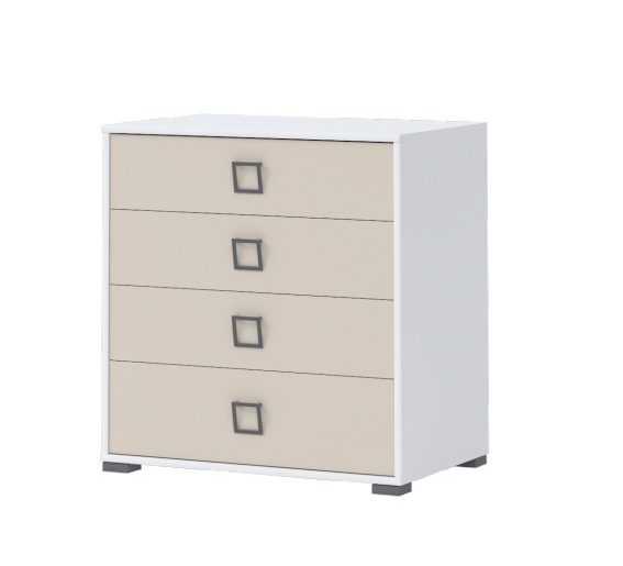 Komoda z izrazito zasnovo prinaša urejen in skladen videz v prostor. Njena preprosta oblika z ravnimi linijami poudarja sodoben značaj pohištva, medtem ko rahlo poudarjen okvir vrat ustvari subtilen vizualni kontrast. Sprednjo stran dopolnjuje kvadratni ročaj, ki s svojo obliko izstopa kot zanimiv oblikovni detajl.