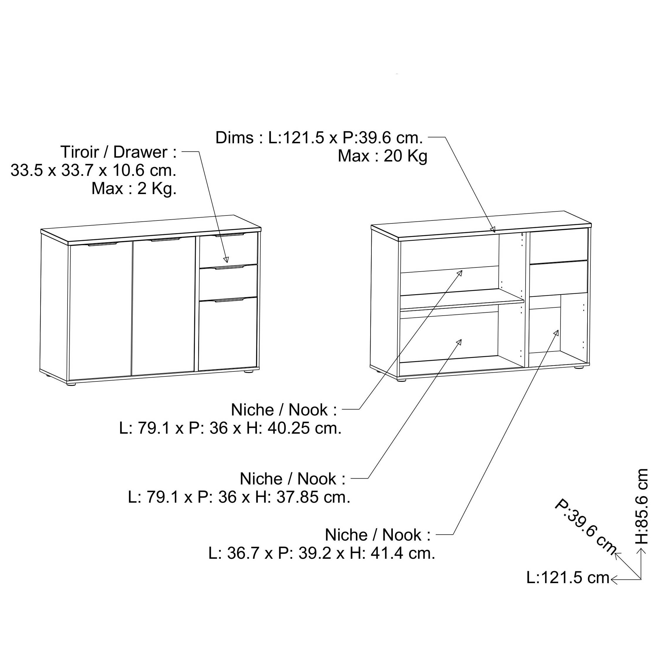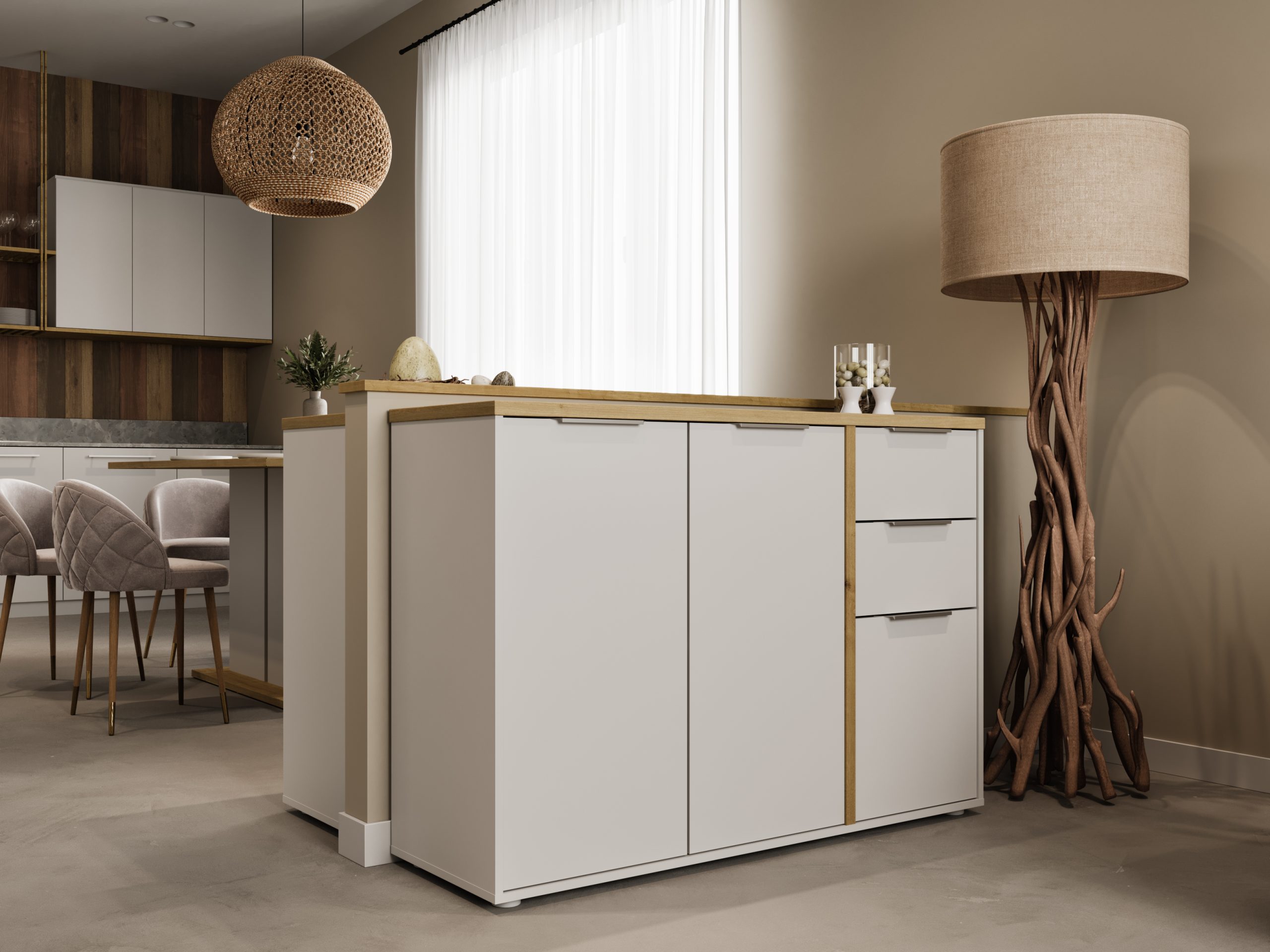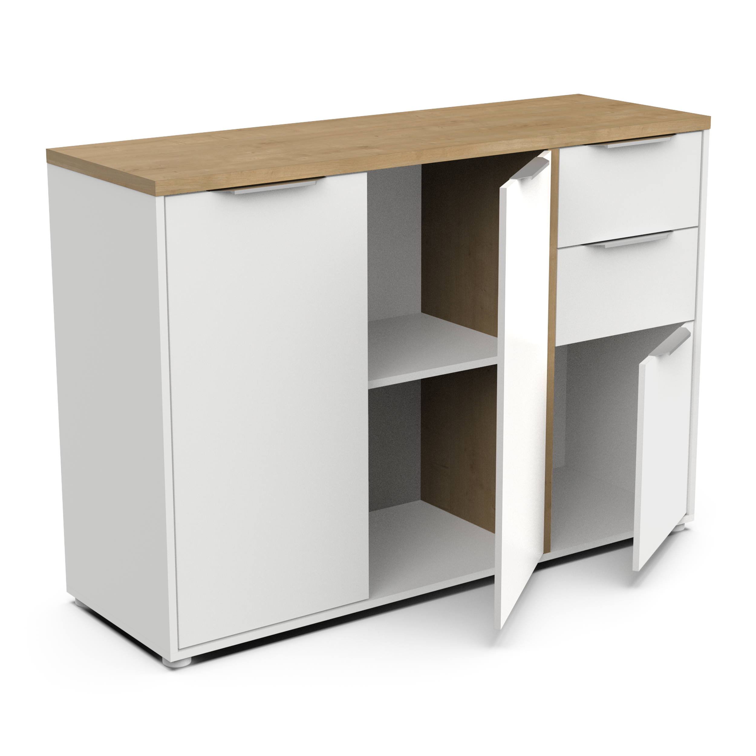 Sodobna komoda, v kombinaciji bele in rjave barve. Izdelana je v Franciji, iz kakovostnega iverala, oblečenega v melamin. Komoda ima dva predala na desni strani, en velik kabinet za shranjevanje z eno notranjo polico ter dvojnimi vrati ter en manjši kabinet.