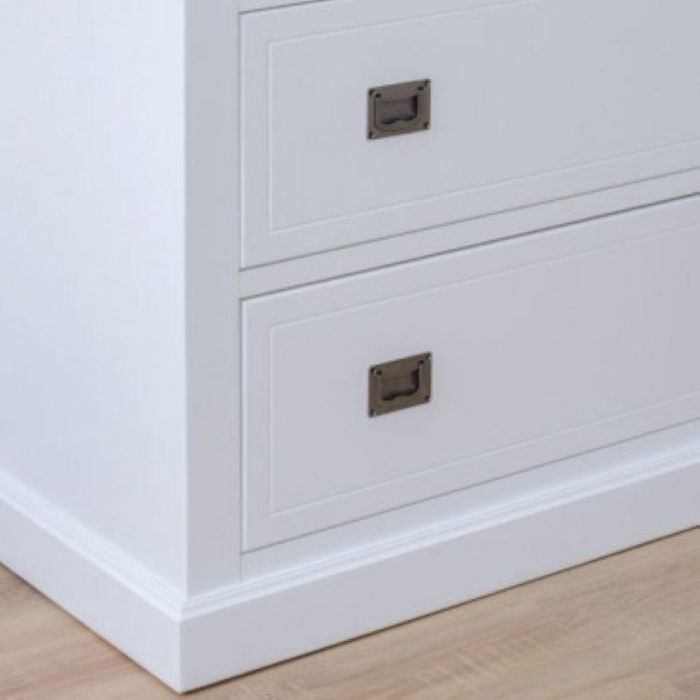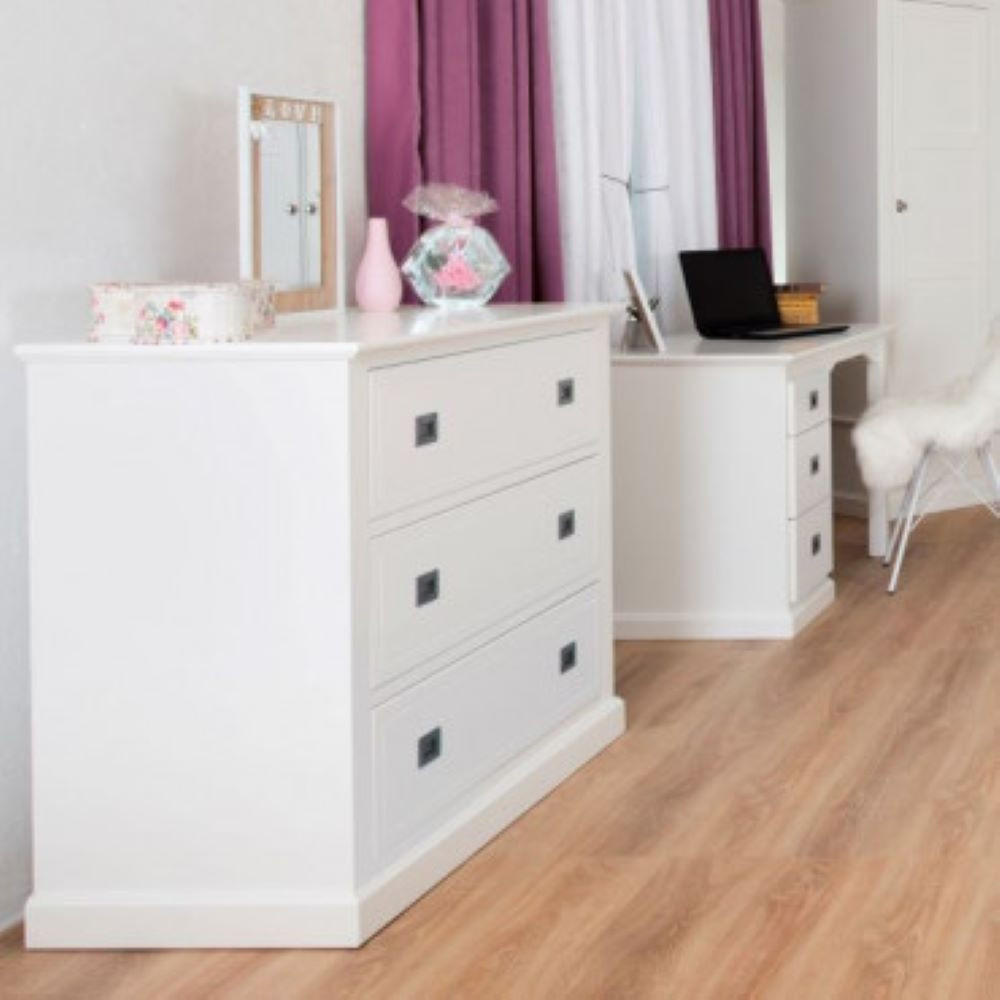 Komoda s tremi predali je narejena iz masivnega lesa bukve, ki ga dopolnjujejo MDF plošče. barvan je v belo barvo. Predali imajo dvojen ročaj v obliki držala v sivii kovinski barvi. Opremljeni so s počasnim (tihim) zapiranjem. Robovi komode so dodatno poudarjeni. Izbirate lahko med popolnoma belo komodo ali z vratci predalov v rustikalni smreki, barvani v barvo hrasta.