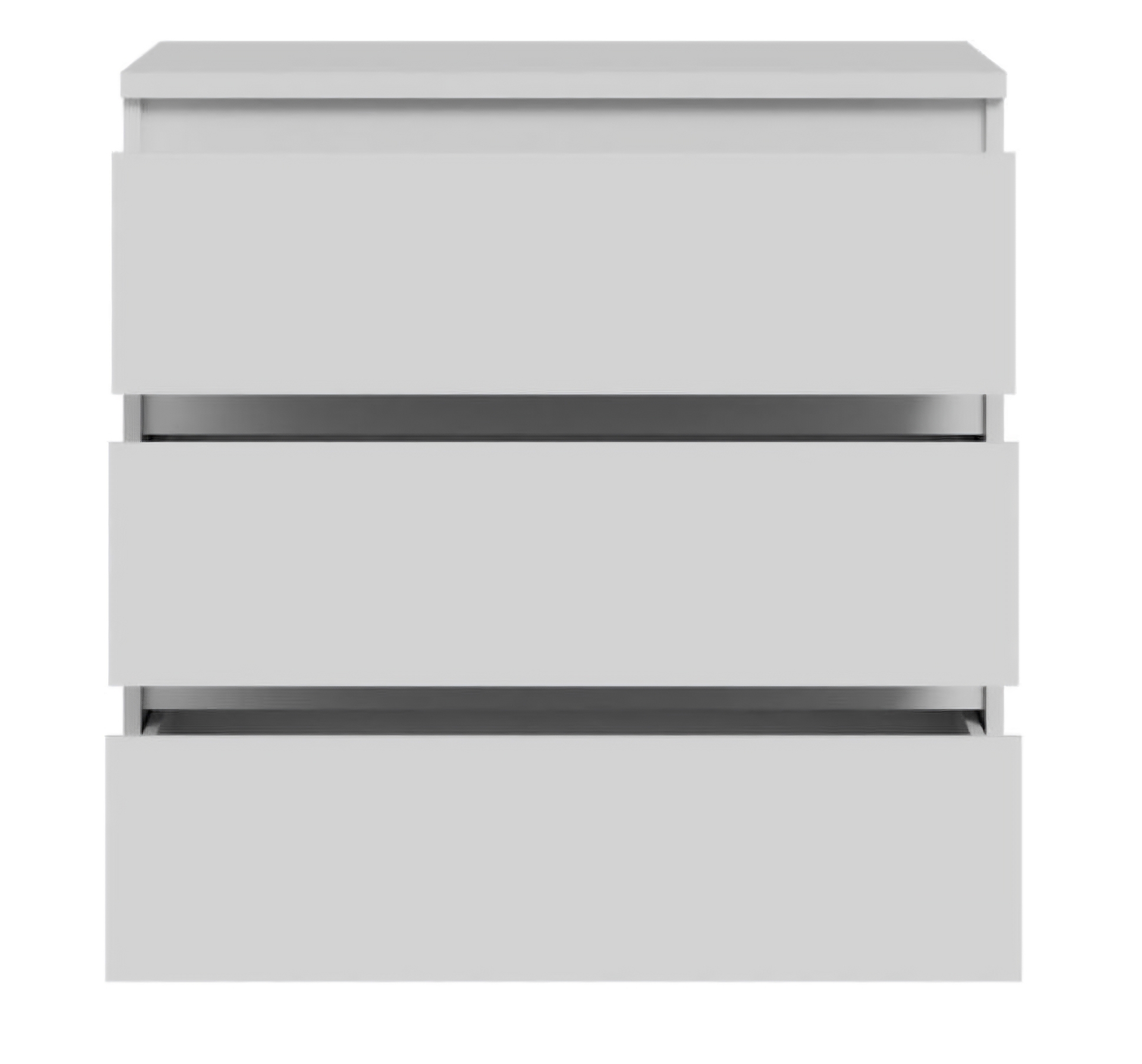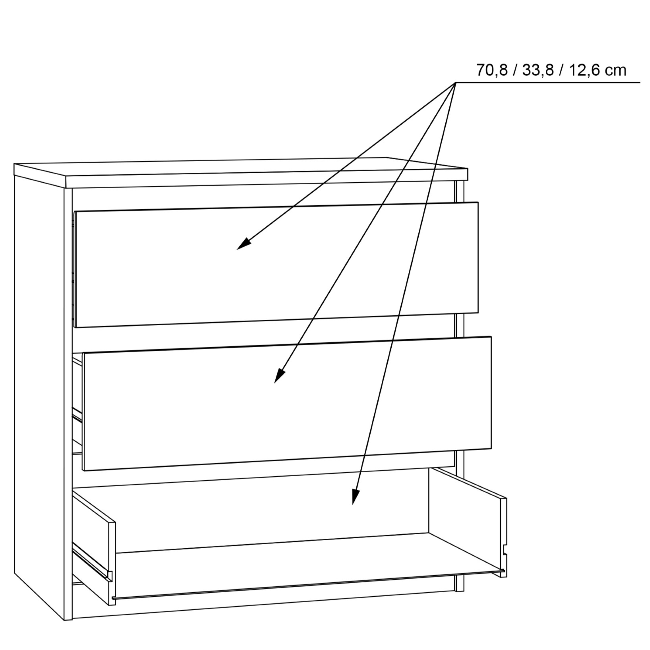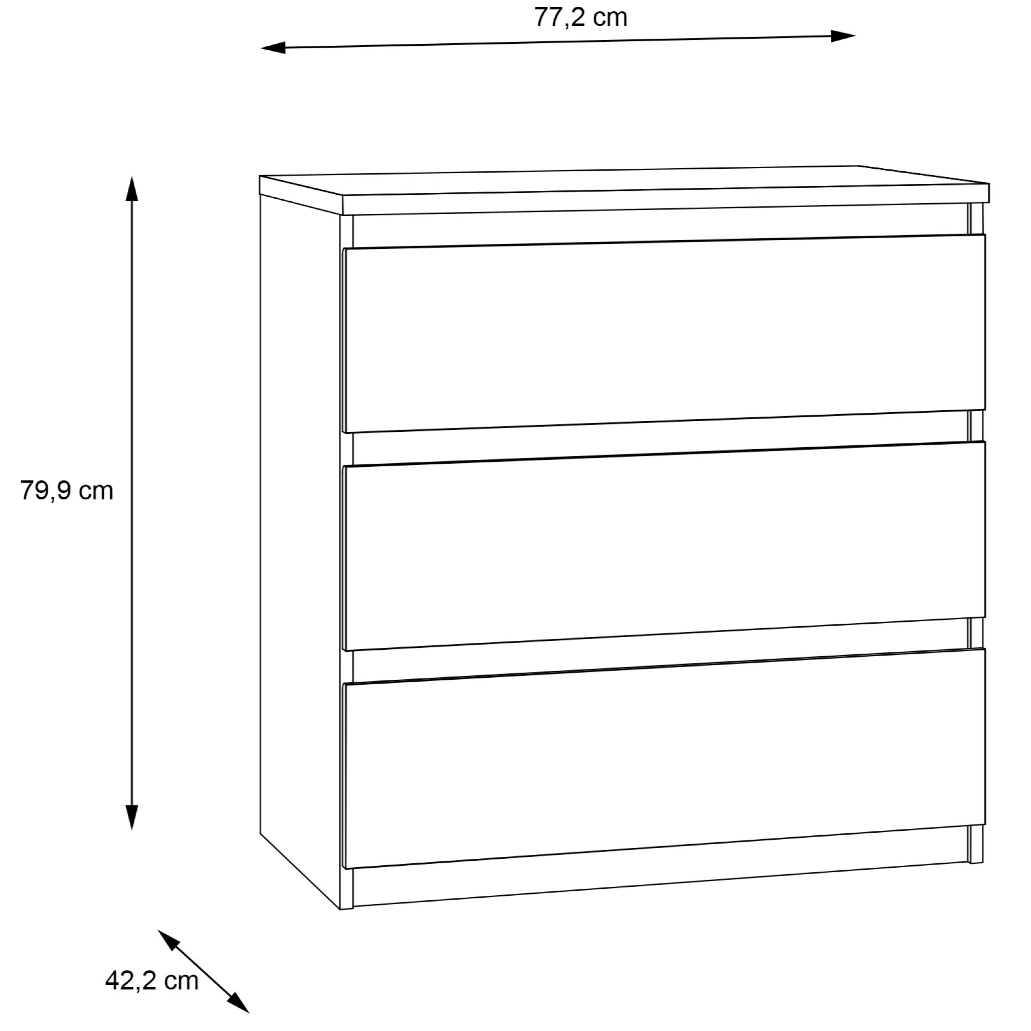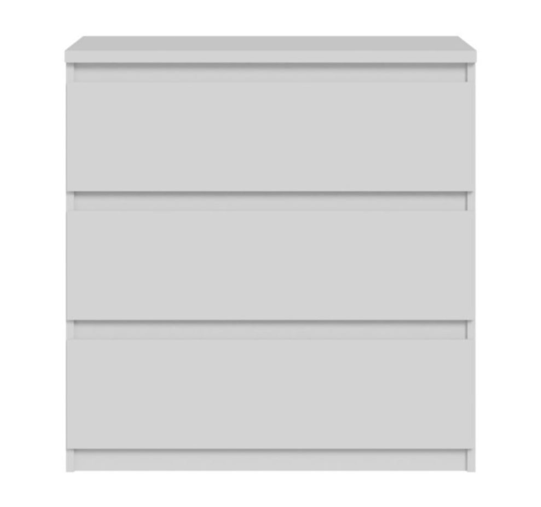 Funkcionalna komoda s tremi predali brez ročajev, na voljo v mat beli barvi ali v imitaciji hrasta, ki se bo lepo podala v vsak prostor v hiši ali stanovanju. Opremljena je s tremi identičnimi predali na vodilih s krogličnimi ležaji, ki zagotovijo dovolj prostora za shranjevanje oblačil, dodatkov ali gospodinjskih potrebščin.