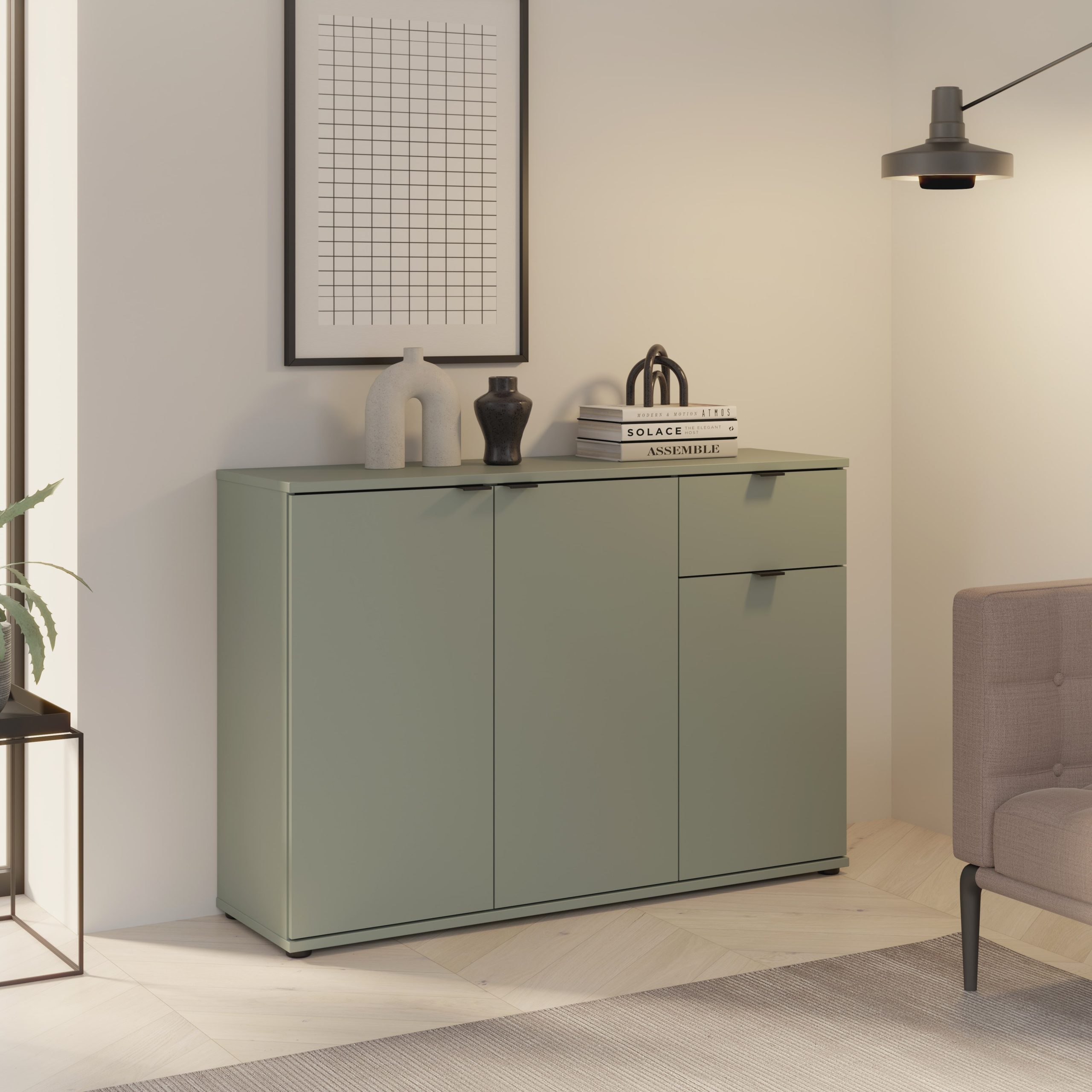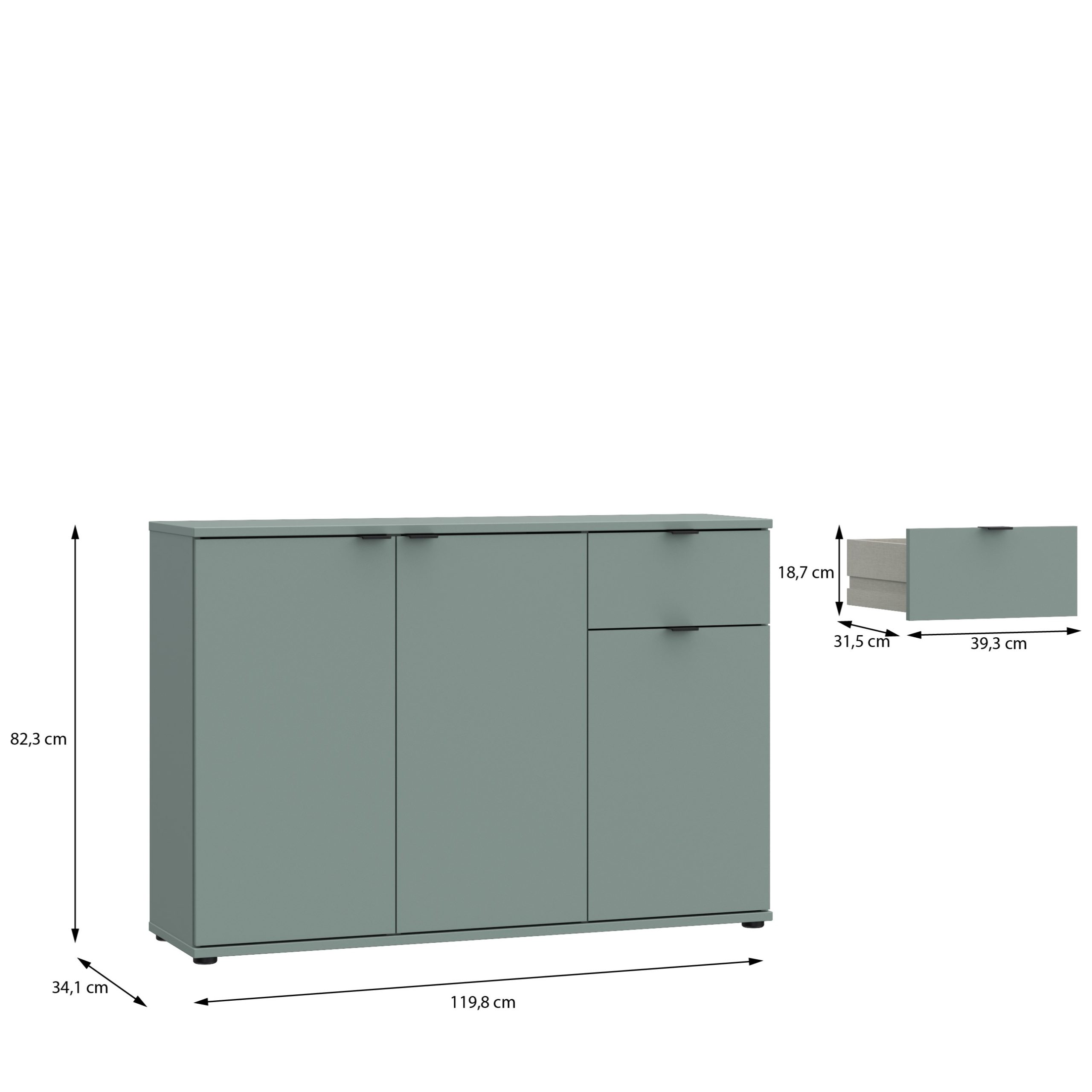 Sodobna komoda, na voljo v Sage zelenkasti ali rdečkasti terakota barvi, da se dobro prilegata širokemu izboru različnih notranjih dekorjev. Izdelana je iz kakovostnega iverala, oblečenega v melamin za enostavno čiščenje in vzdrževanje. Zgornja plošča komode lahko nosi do 40 kg.