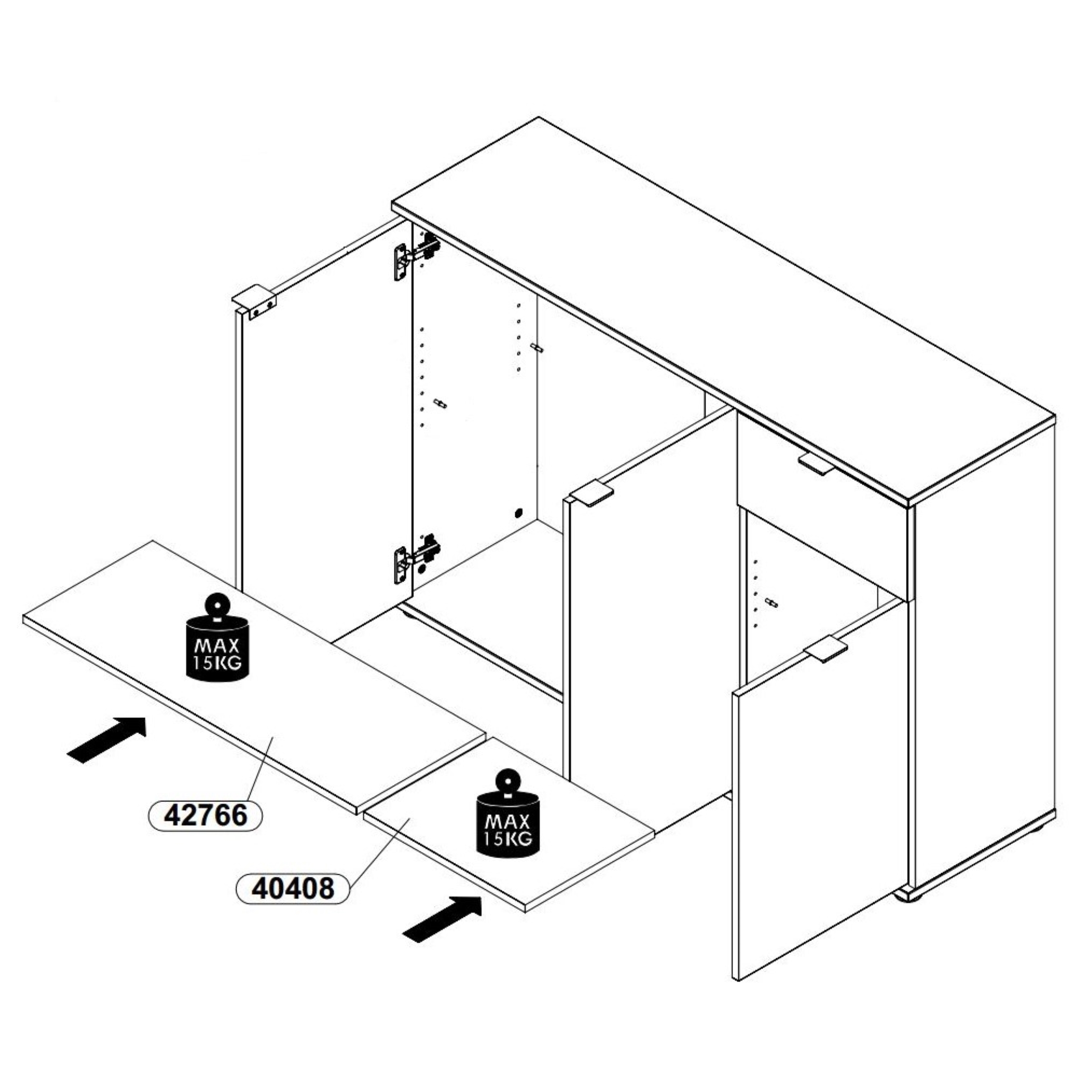 Komoda ima en velik kabinet za shranjevanje stvari ki se odpira z dvojnimi vrati, ob njem pa je še en manjši kabinet z enimi vrati, vsa na tečajih. Oba kabineta imata v notranjosti po eno polico, za dober izkoristek prostora pri hranjenju različnih predmetov, z nosilnostjo do 15 kg. Nad manšim kabitom je še en predal z nosilnostjo do 5 kg, kamor lahko shranite manjše predmete ki morajo biti lepo pospravljeni, a hkrati tudi zlahka dostopni.