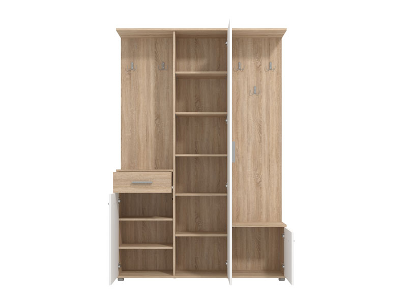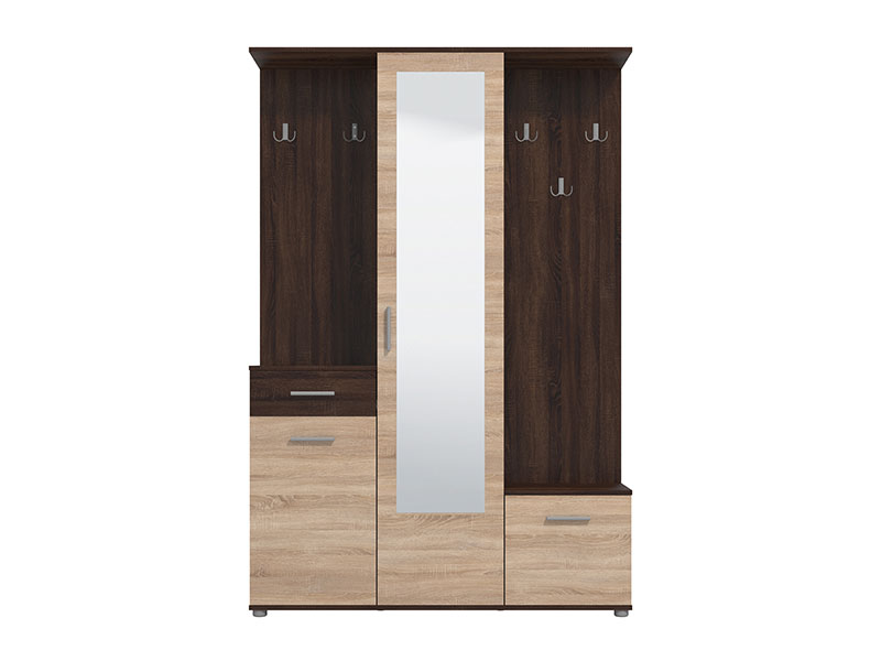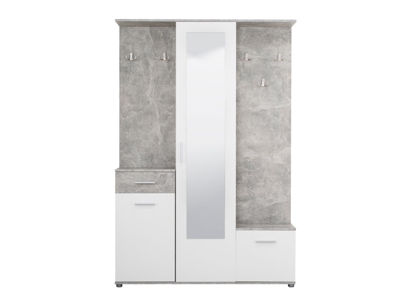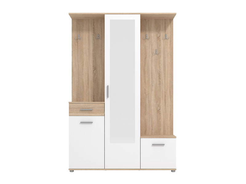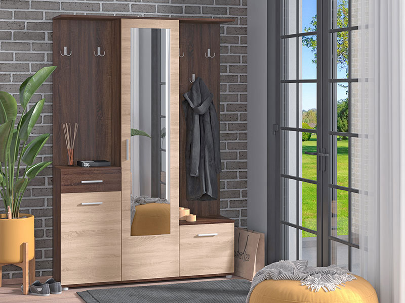Sestav vključuje zaprte in odprte shranjevalne površine, ki omogočajo pregledno razporeditev jaken, torb ter obutve. Ogledalo ni le praktičen dodatek za zadnji pogled pred odhodom od doma, temveč tudi estetski element, ki prostoru doda globino in svetlobo.