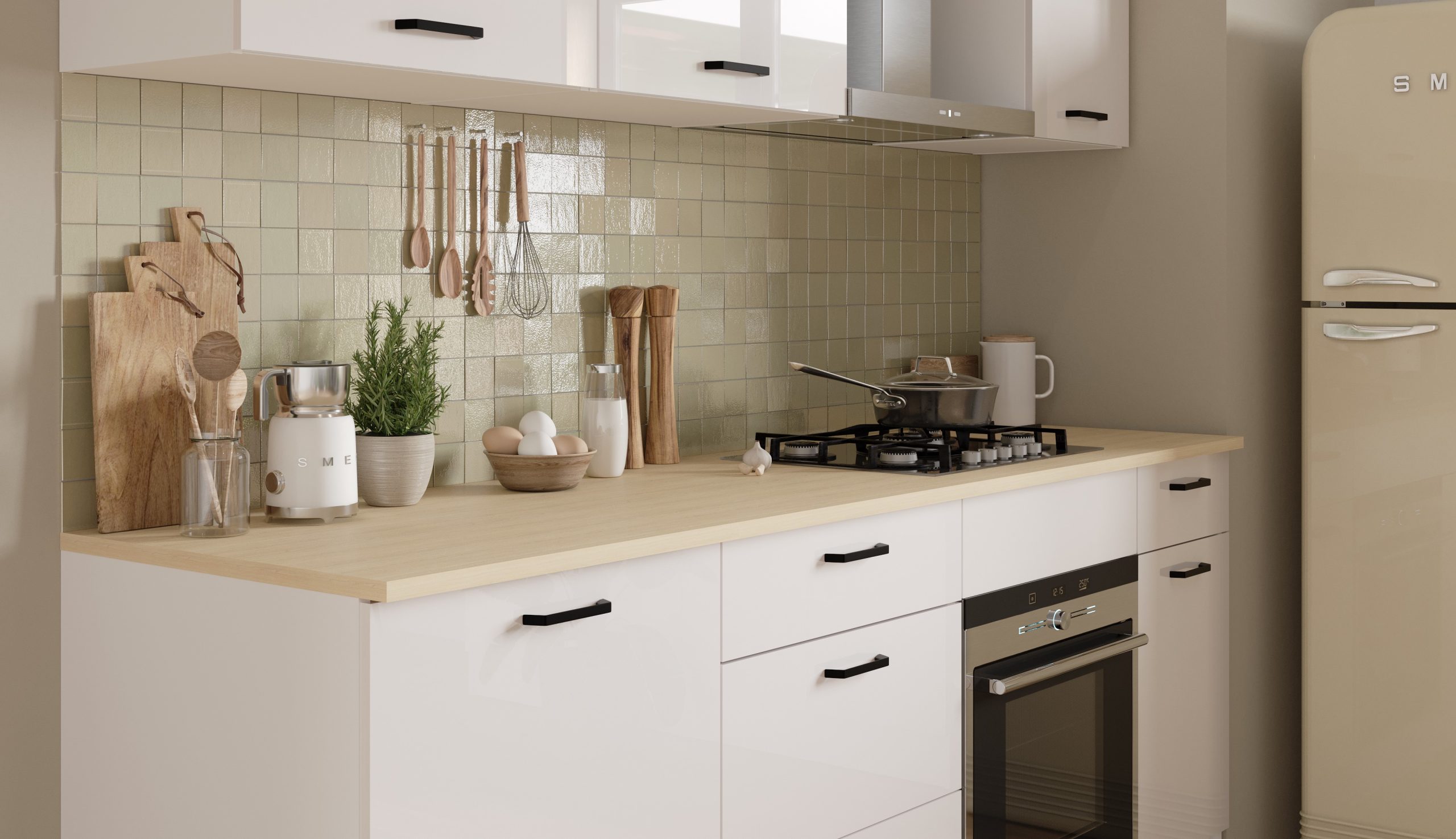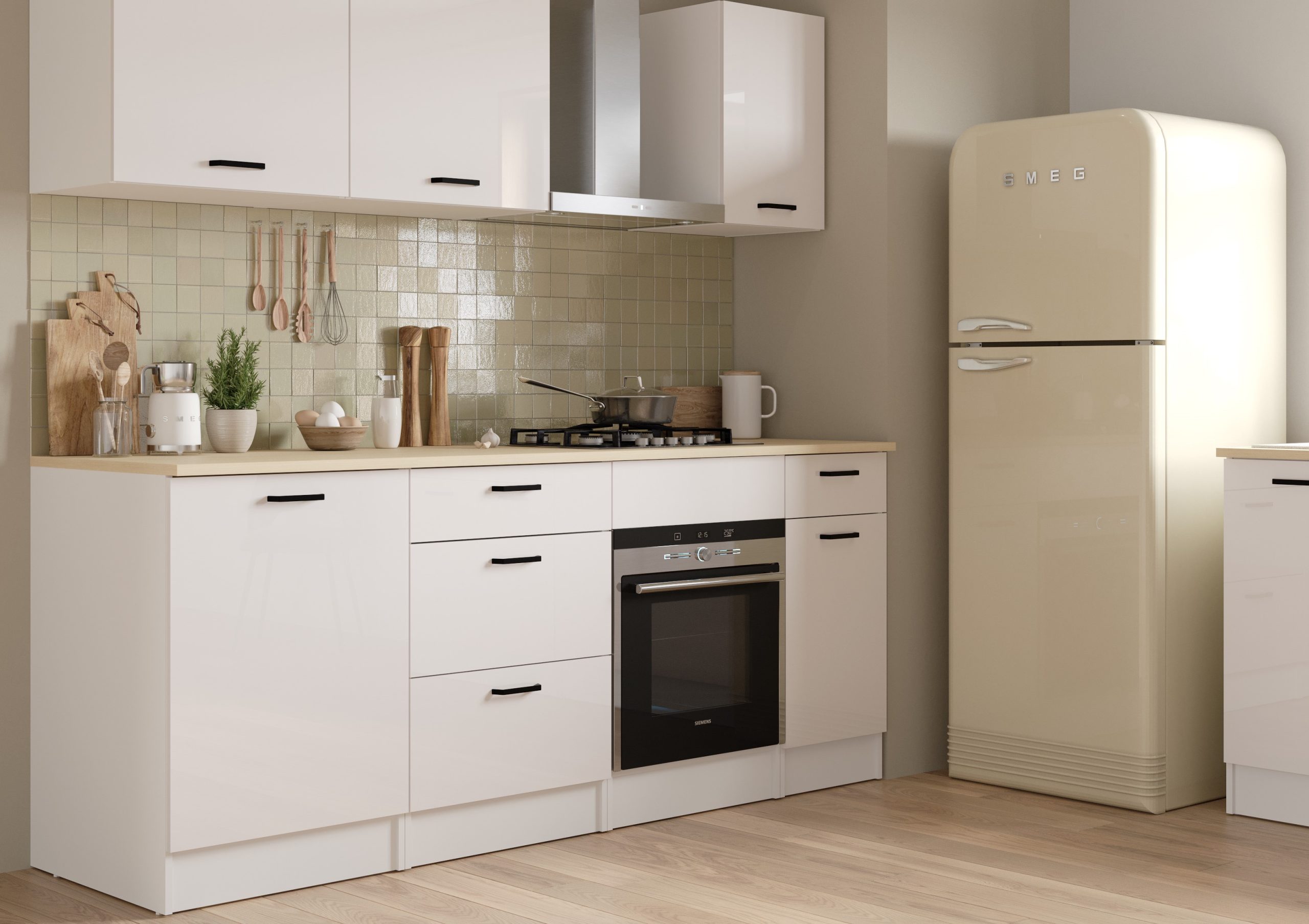 Vrata so opremljena s črnim aluminijastim ročajem ki združuje dober oprijem z barvnim kontrastom v primerjavi s sijajno belo sprednjo stranjo.