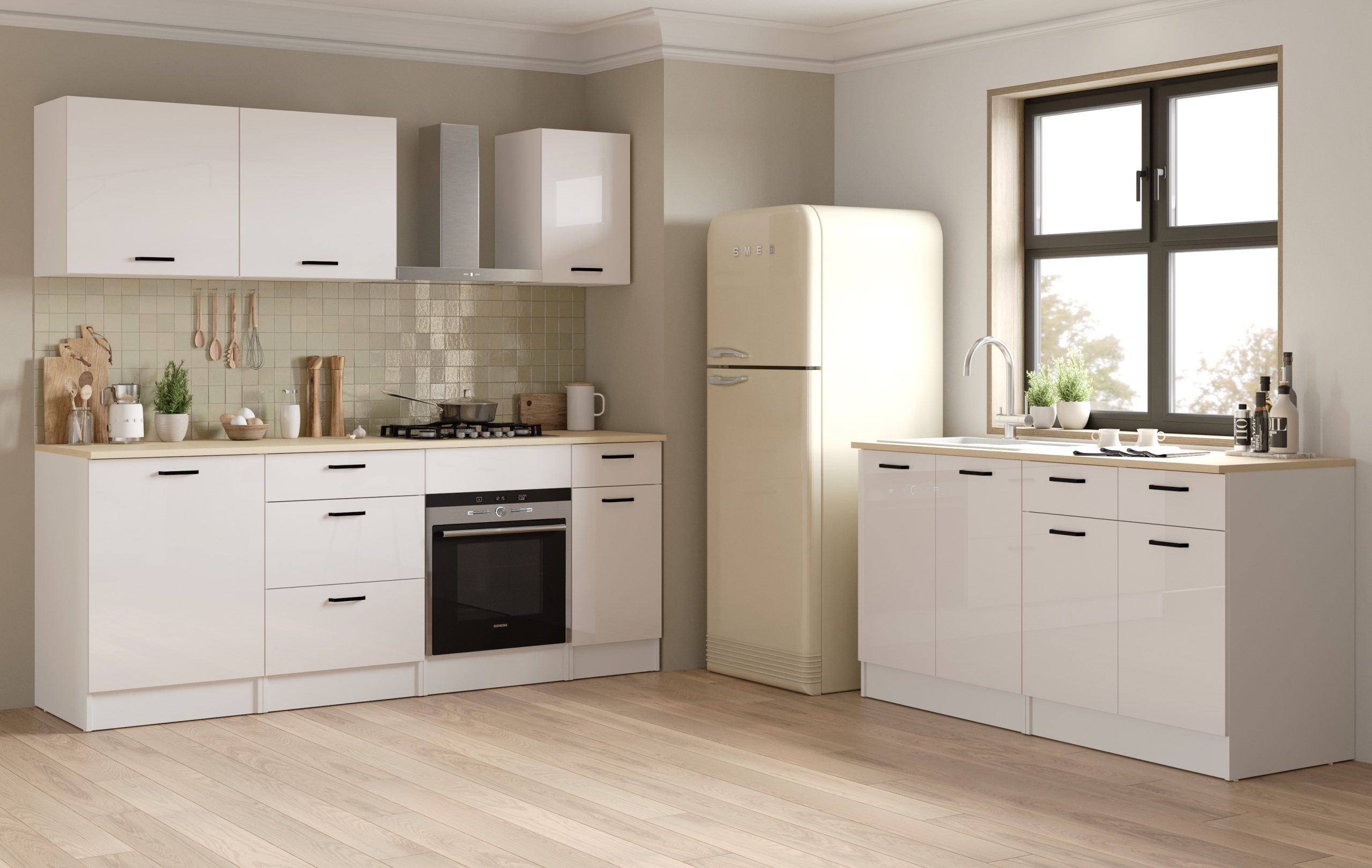 Ogrodje omarice je izdelano iz 16 mm debele iverne plošče, prevlečene z melaminom za zaščito pred vsakodnevno obrabo, vlago in vročino. Sprednja stran je obdelana z visokosijajnim polarno belim lakom, ki ustvarja svetlo, odsevno površino in poudari čist in sodoben videz kuhinje.