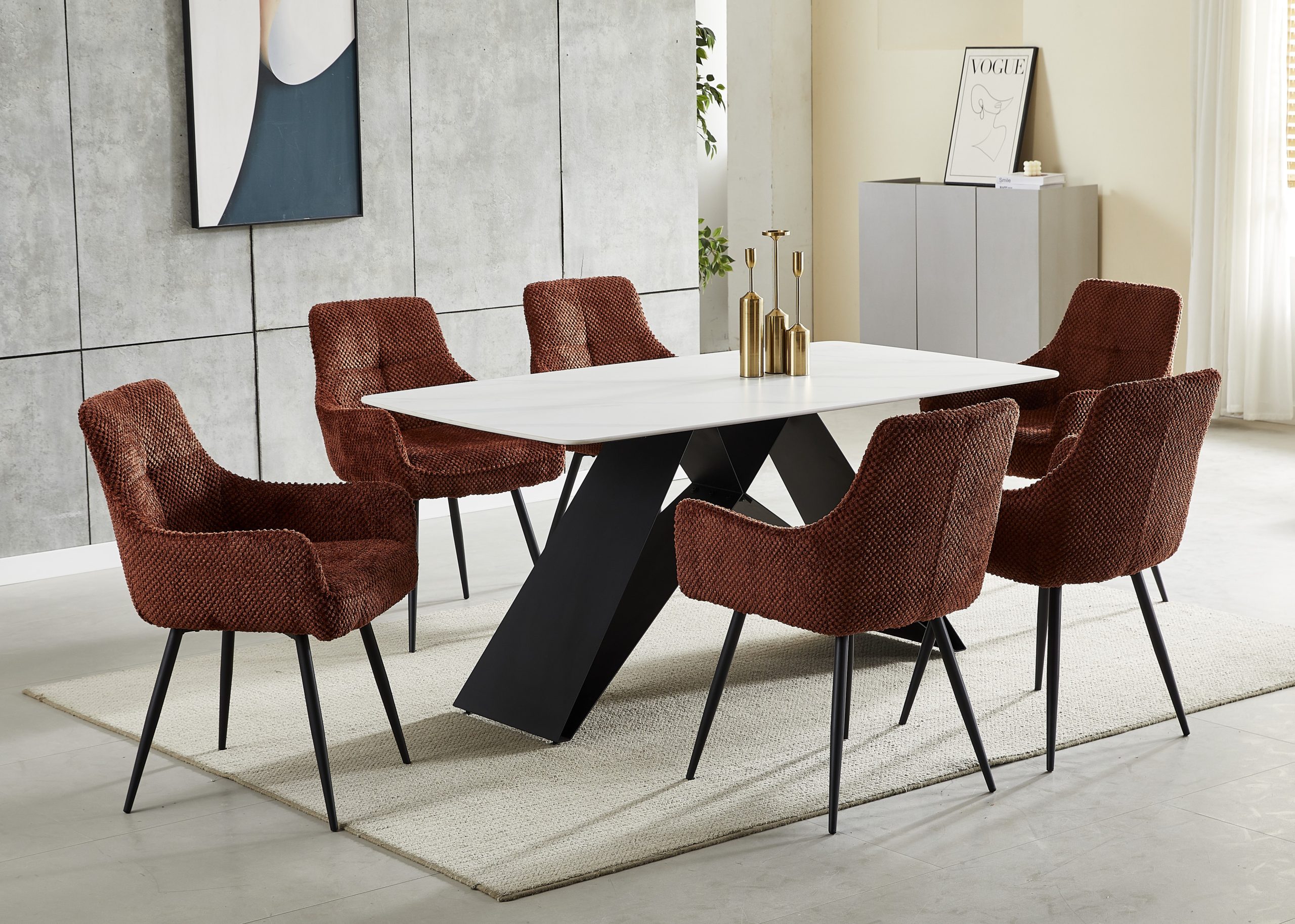 Jedilna miza, ki vas bo navdušila s svojim modernim dizajnom. Plošča mize debeline 1,2 cm, je izdelana iz keramike s čudovitim belim marmornatim vzorcem. Podnožje mize stilskega dizajna, ki daja mizi modern pridih, je narejeno iz kovine in je prašno lakirano v črno barvo. Miza je na voljo v dveh velikostih. Maksimalna nosilnost mize je 120 kg.