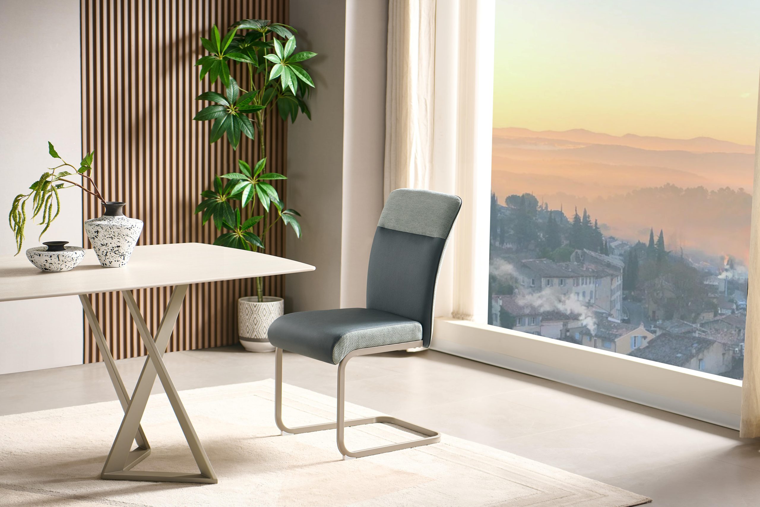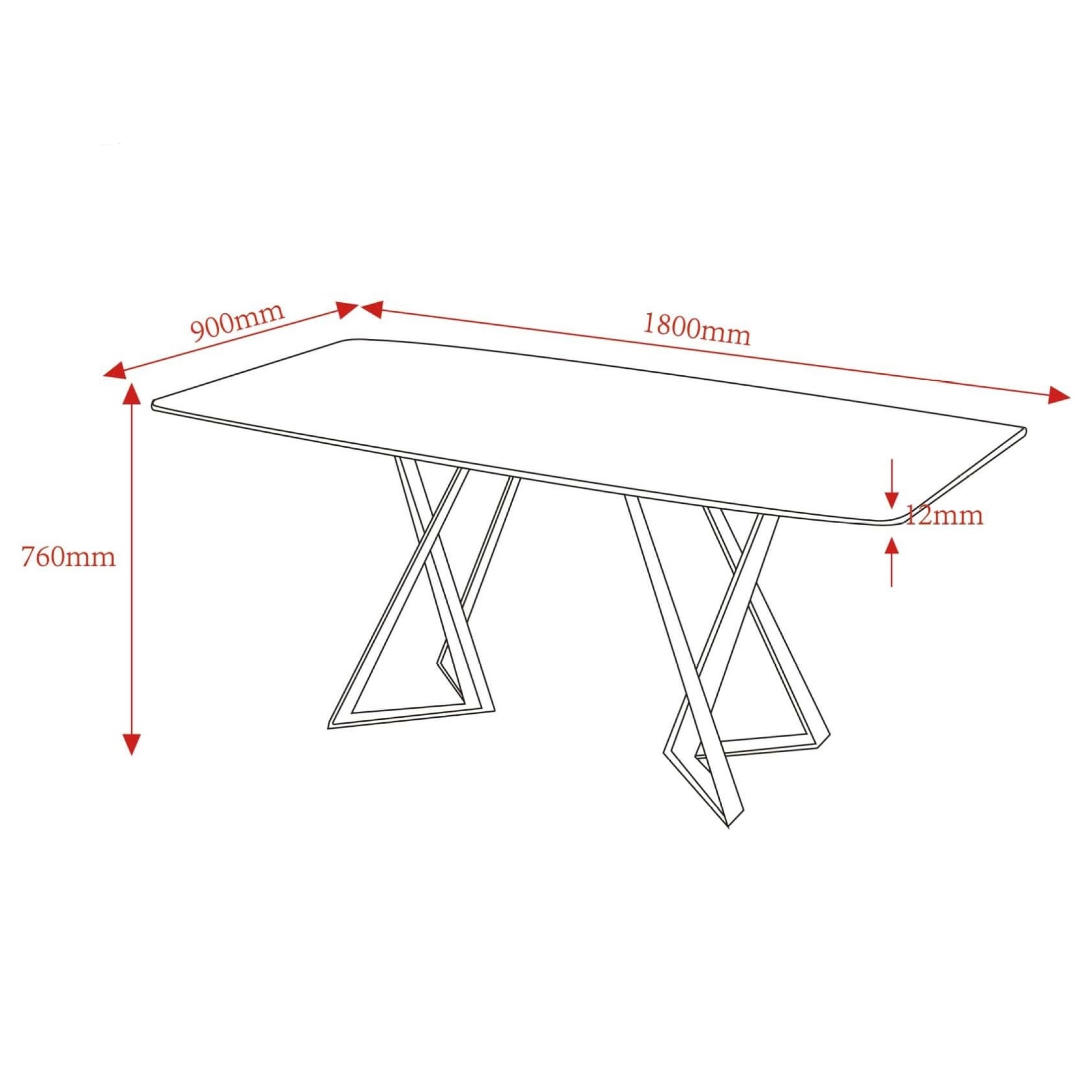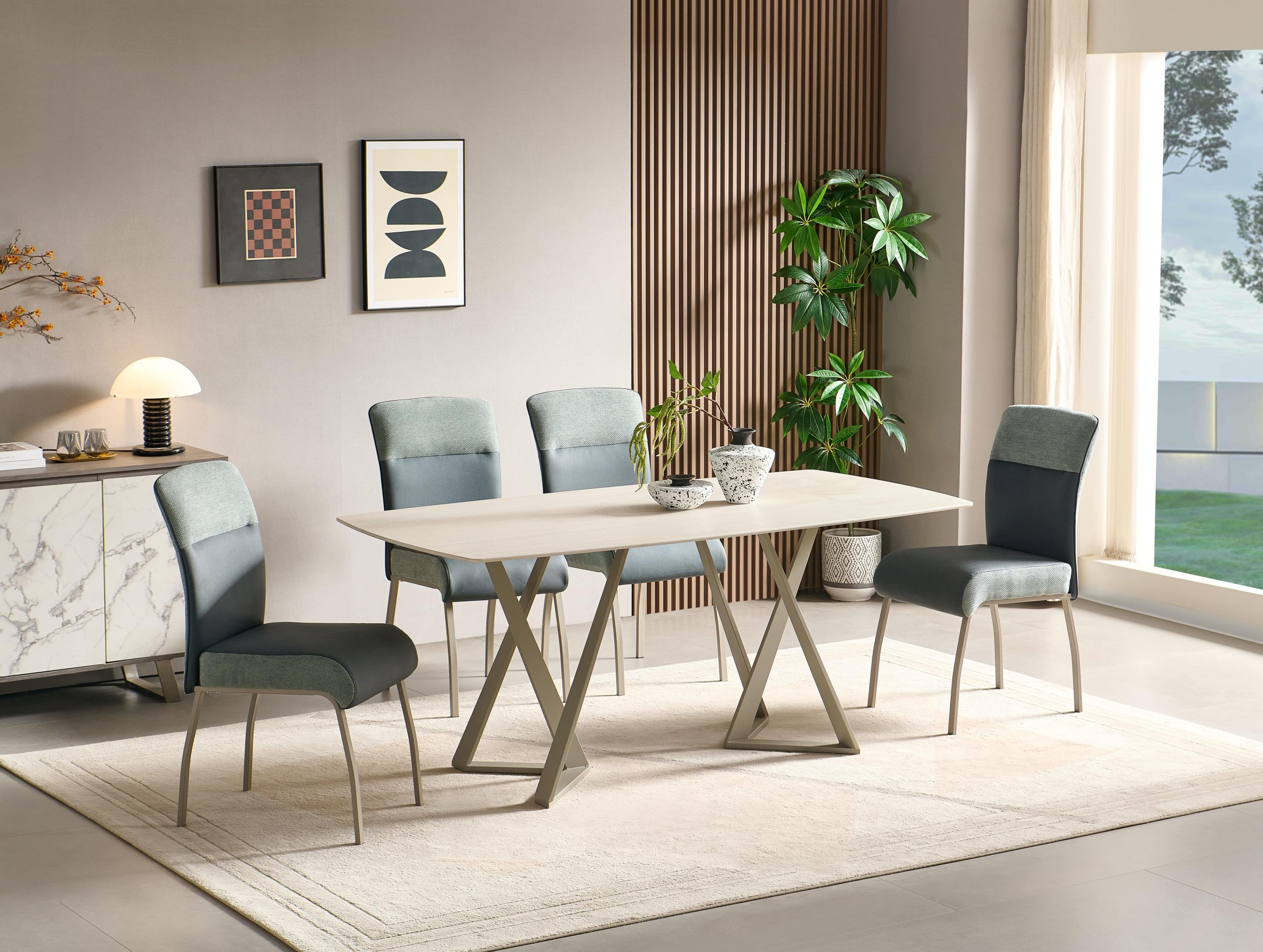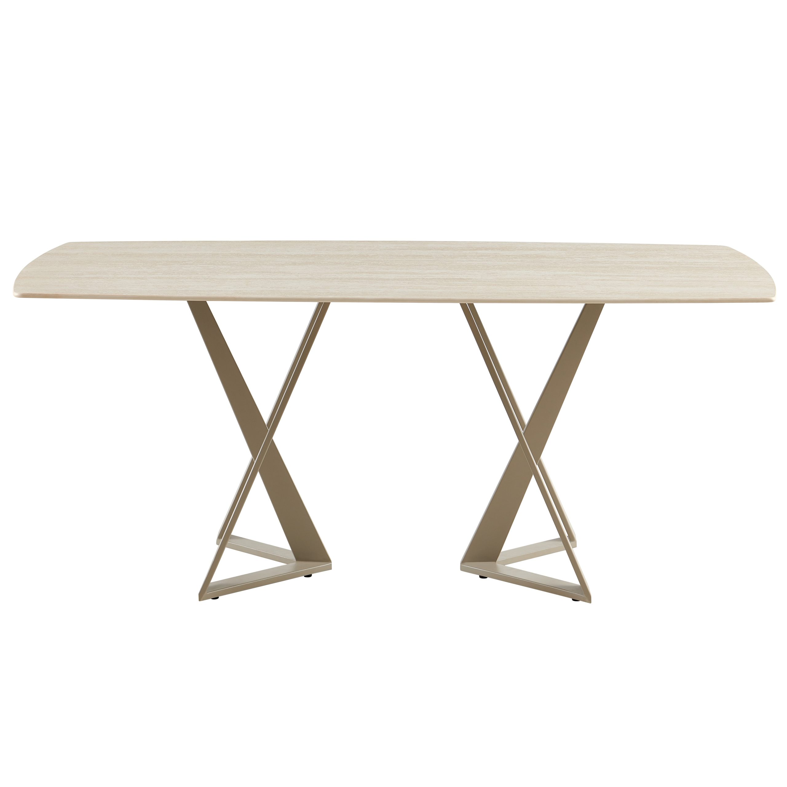 Moderna jedilna miza iz keramike, zasnovana tako, da združuje videz kamna z zanimivo sodobno silhueto. Mizna plošča reproducira barvo in vzorec travertina na keramični površini, dimenzije 180 × 90 cm, da udobno služi tipični jedilni postavitvi. Z debelino 11–12 mm ima plošča tanek profil, ki se se ujema s sodobnim podnožjem mize, hkrati pa zagotavlja togo in stabilno površino za vsakodnevno uporabo pri jedilnici.