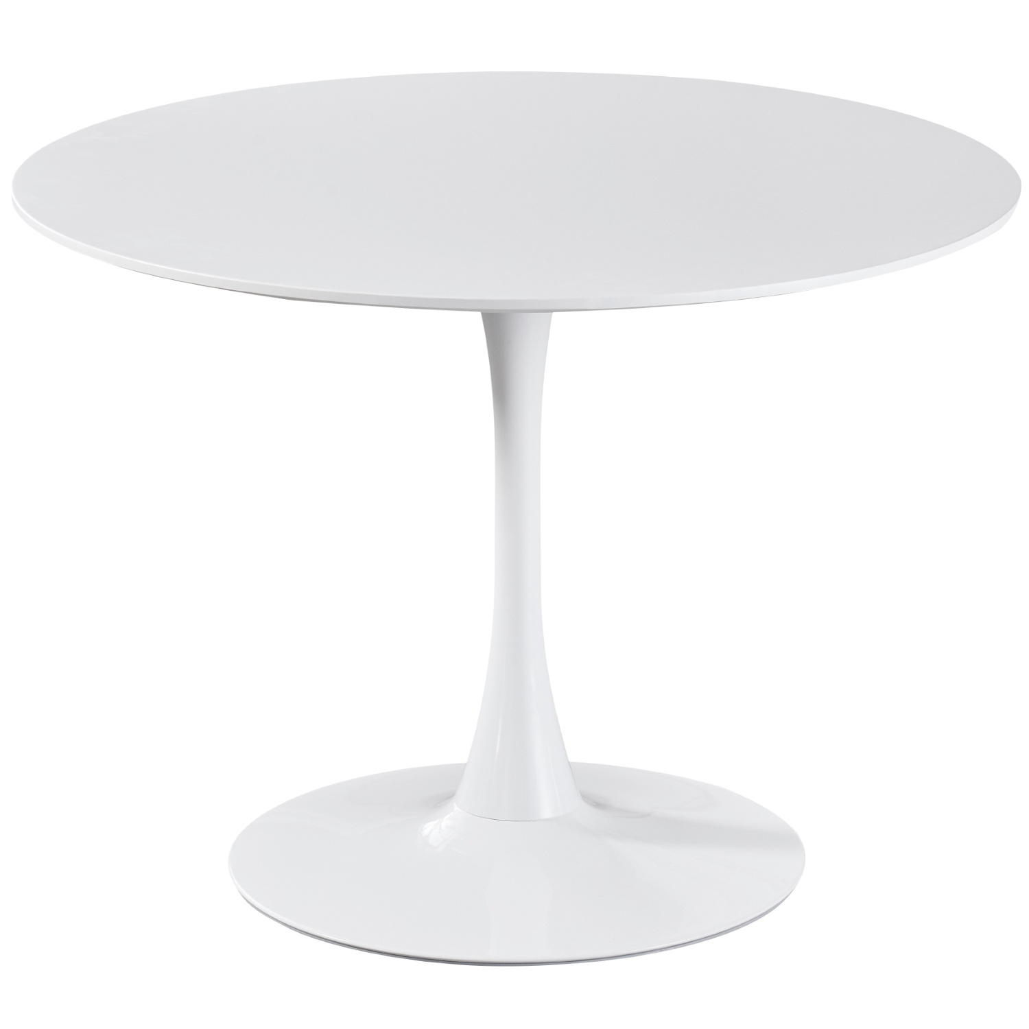 Okrogla jedilna miza z mat belo mizno ploščo iz MDF materijala in sijoče belim kovinskim podnožjem.