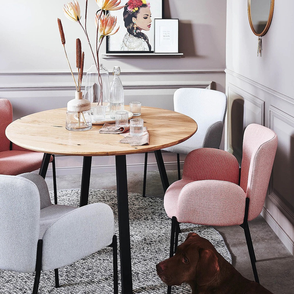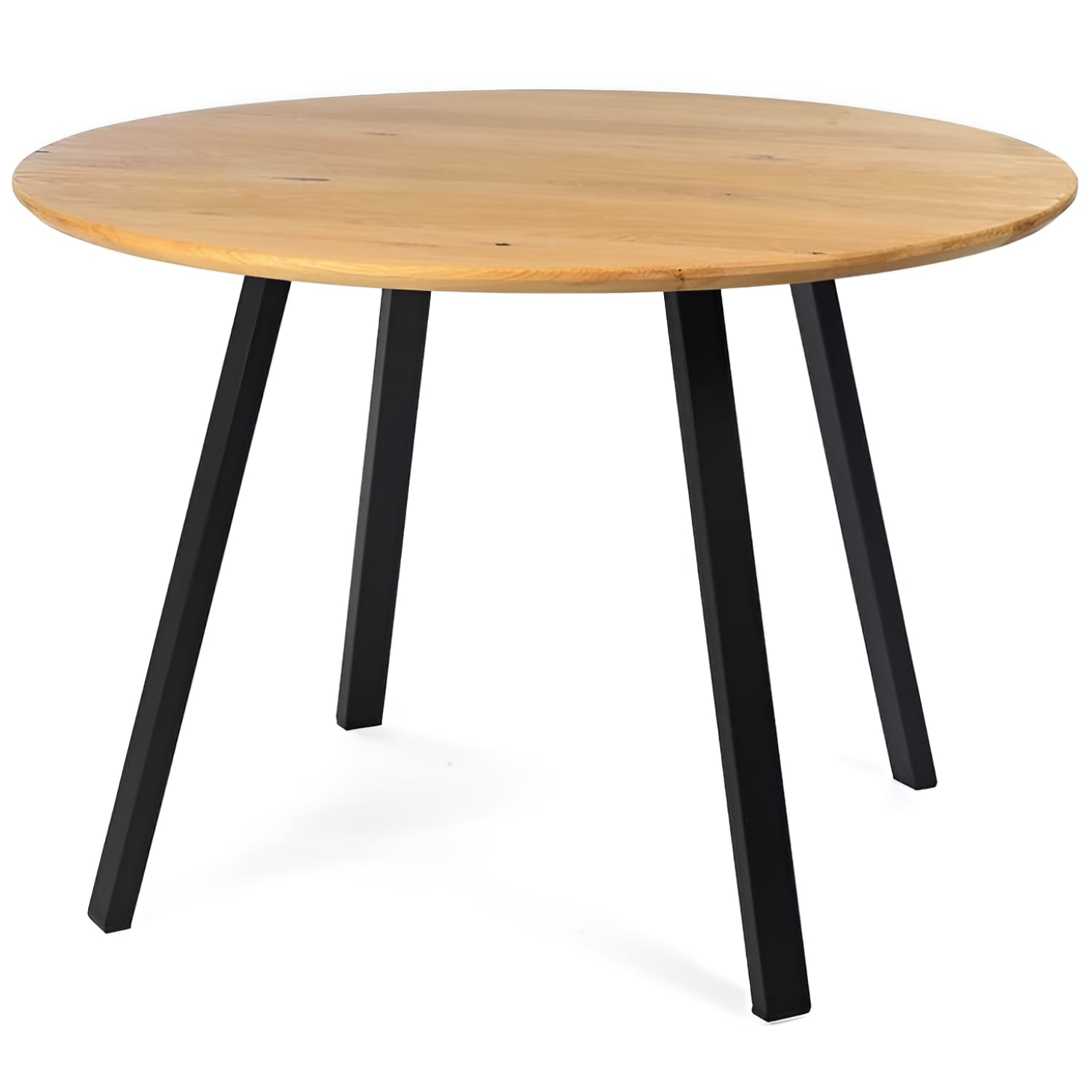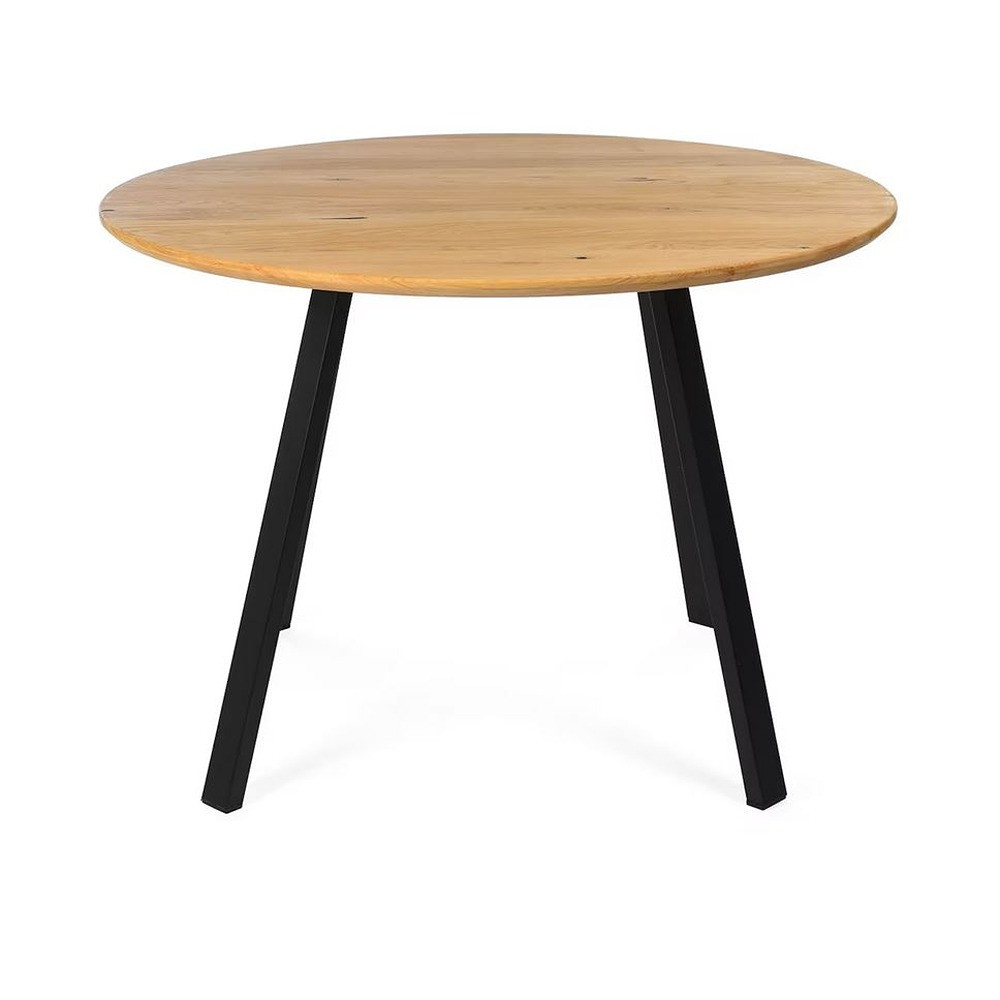 Jedilna miza s hrastovo ploščo premera 110 cm v Swiss Edge slogu, ki stoji na prašno lakiranem kovinskem podnožju.