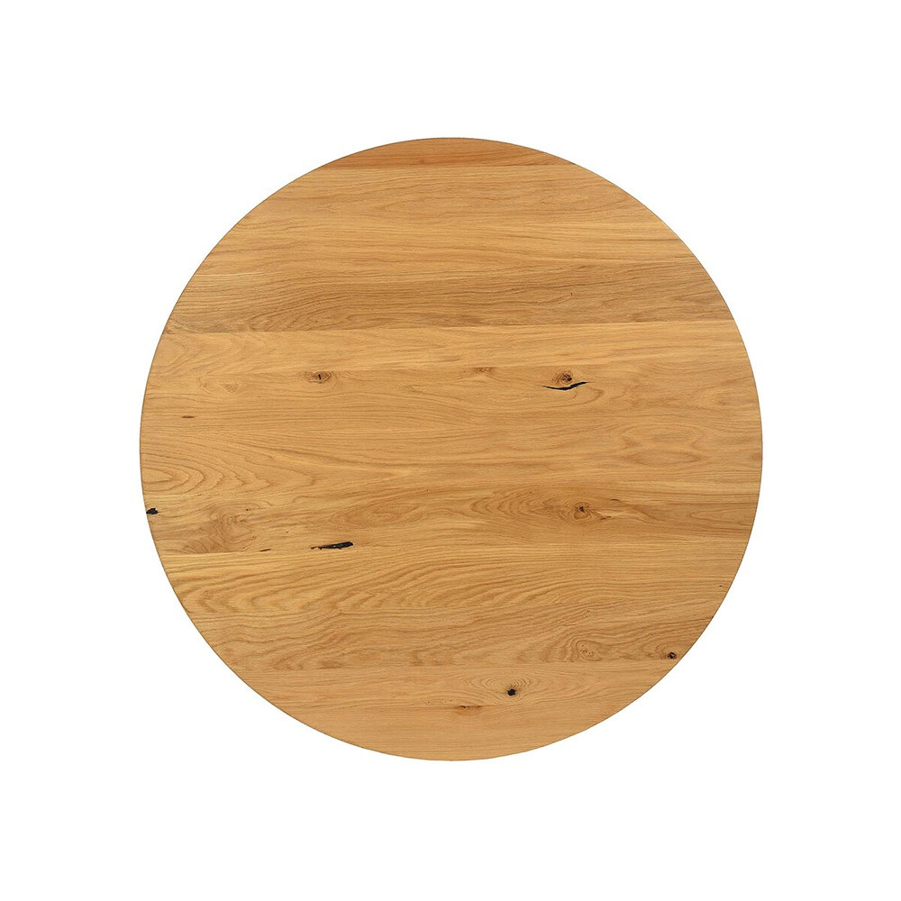 Okrogla jedilna miza, ki bo vaši jedilnici dodala organski pridih z naravnim videzom hrastovega lesa. Mizna plošča ima premer 110 cm in je debela 2,5 cm, z dolžinskim lepljenjem in robom v modernem Swiss edge stilu. Črno podnožje mize je kovinsko, z dimenzijami 5×3 cm, in prašno lakirano za boljšo zaščito.