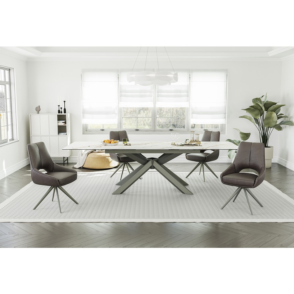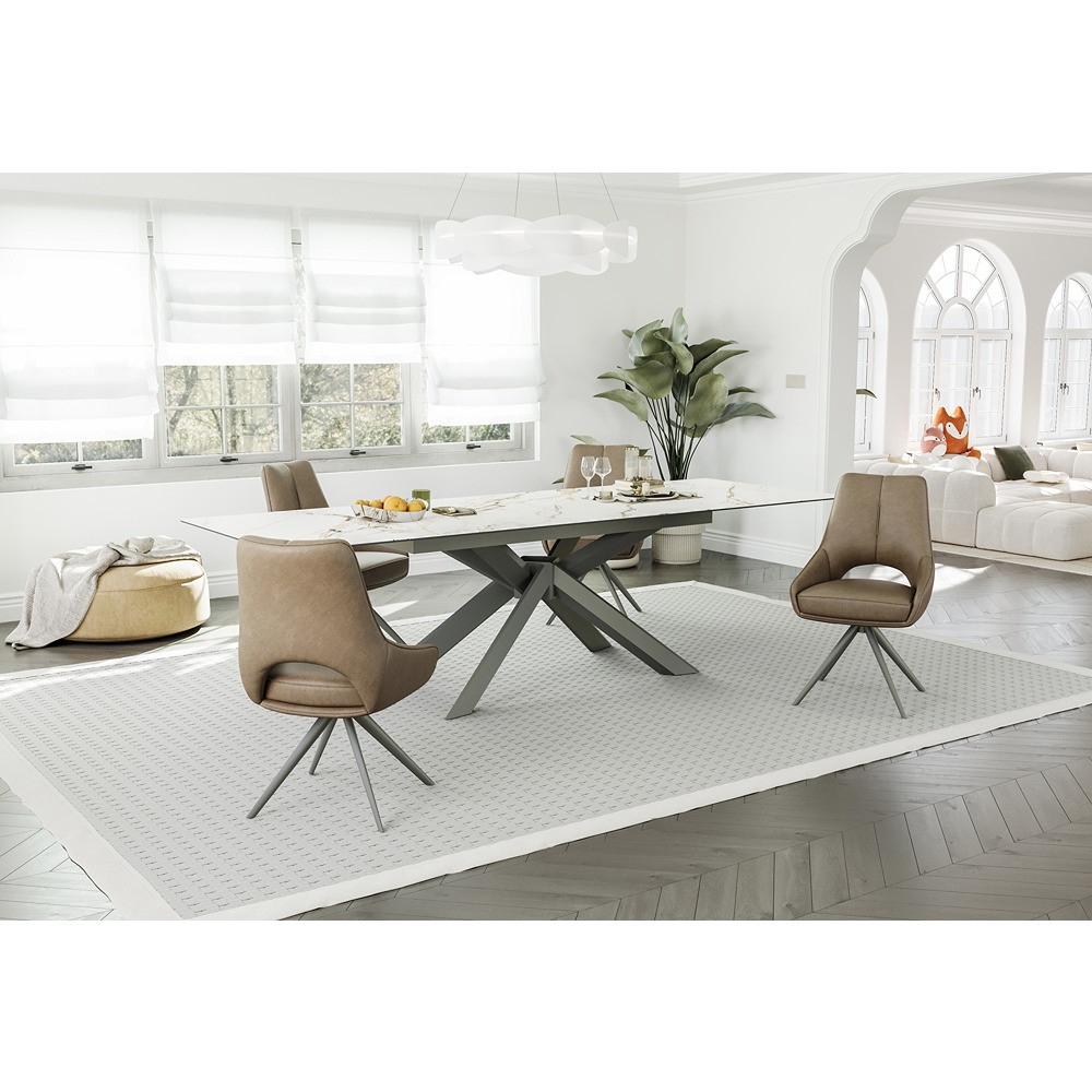 Raztegljiva miza pravokotne oblike, na voljo v beli barvi z vzorcem marmorja. Mizna plošča  je izdelana iz 8 mm plasti kaljenega stekla ter 3 mm plasti keramike. Ta hibridni dizajn  združuje prednosti stekla in keramike, z visoko odpornostjo na toplotno raztezanje, odpornostjo proti praskam ter neporozno površino ki zagotavlja preprosto in hitro čiščenje. Dva 40 cm podaljška, ki se raztegneta iz stranic mize povečata uporabno površino od 180×95 cm na maksimalno velikost 260×95 cm. Črno podnožje mize je narejeno iz kovine, s prašnim lakiranjem za boljšo zaščito kovine pred okoljem. Maksimalna nosilnost mize je impresivnih 150 kg.