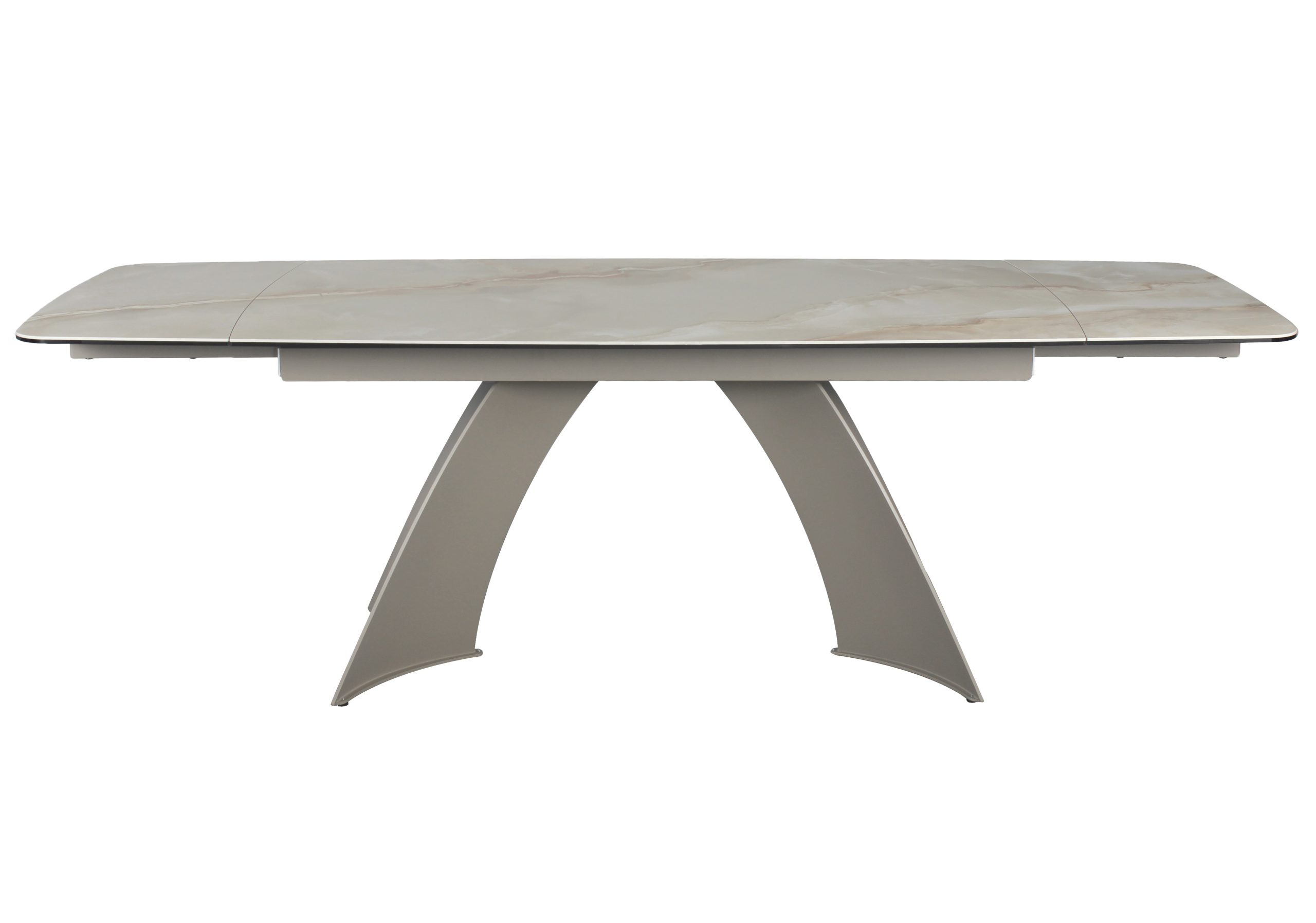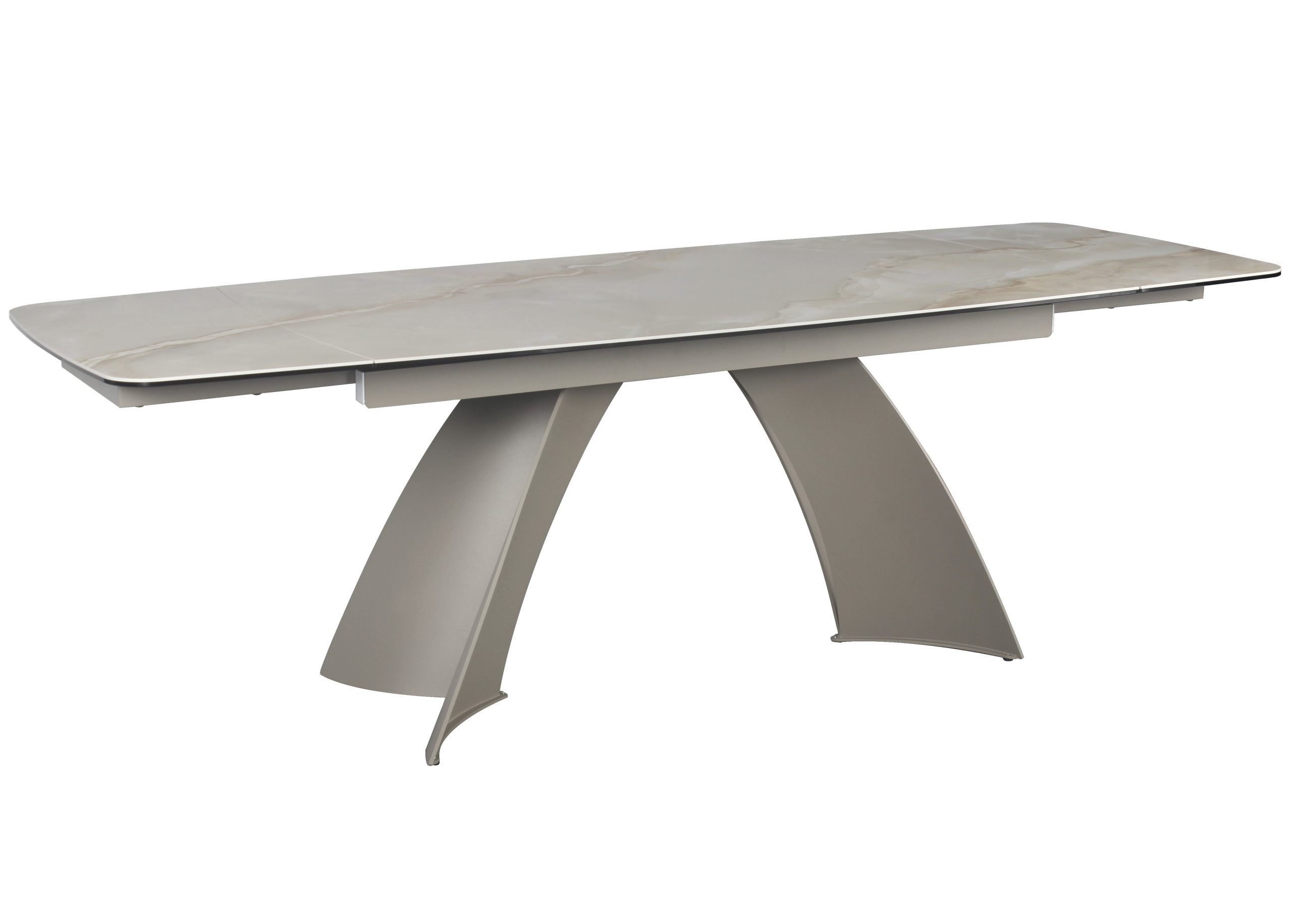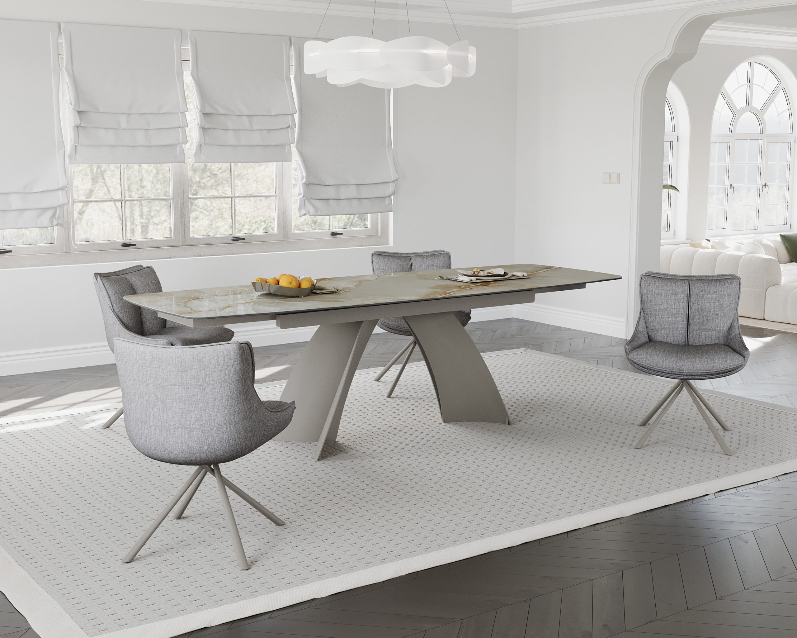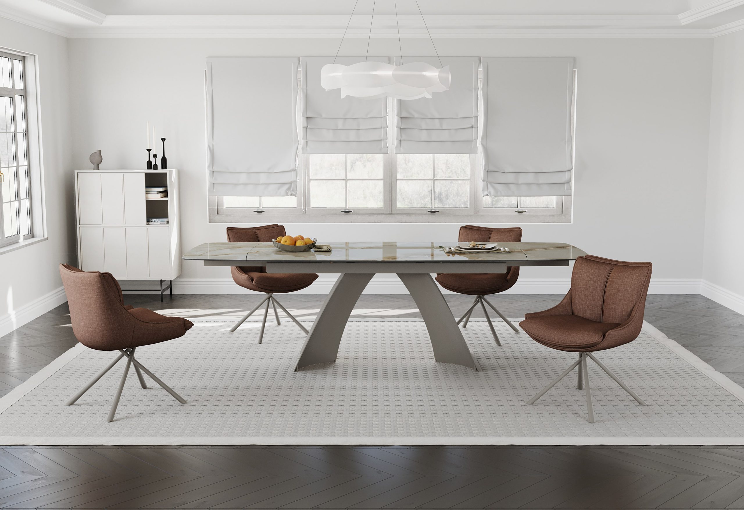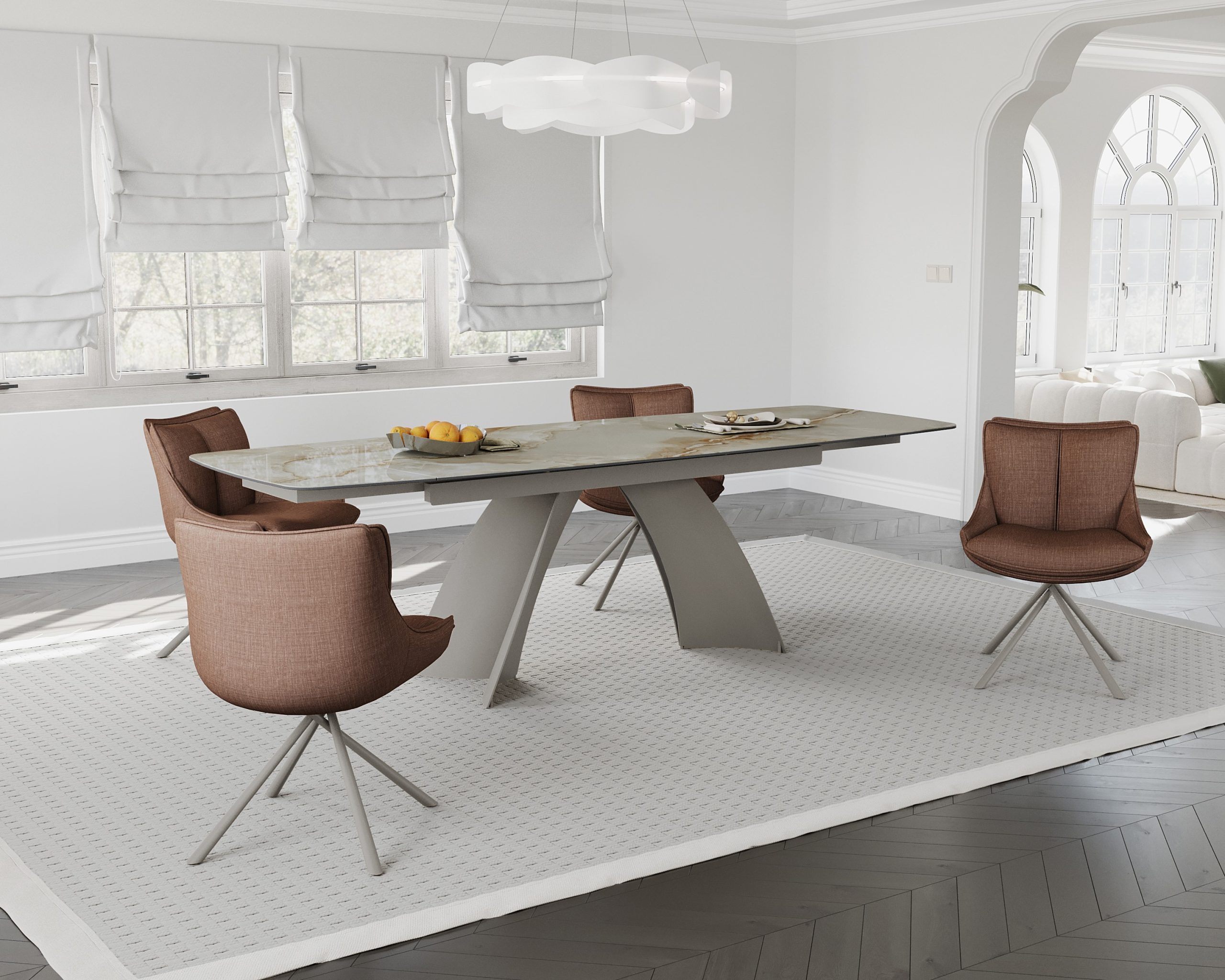 Velika raztegljiva jedilna miza, v imitaciji rjavega marmorja na sivem kovinskem podnožju, ki združuje prilagodljiv dizajn z moderno izbiro materialov za središče sodobnega jedilnega prostora.