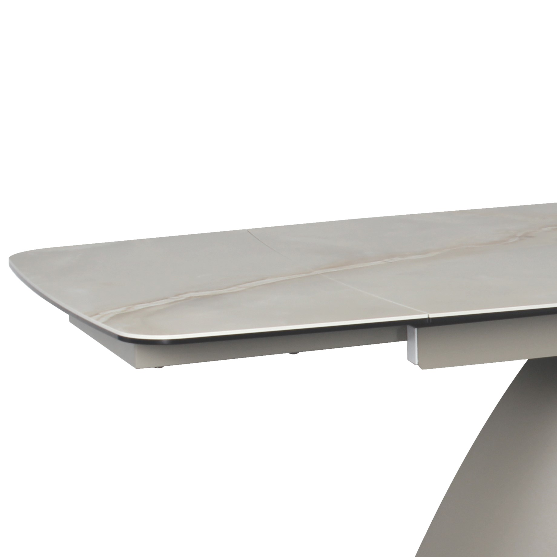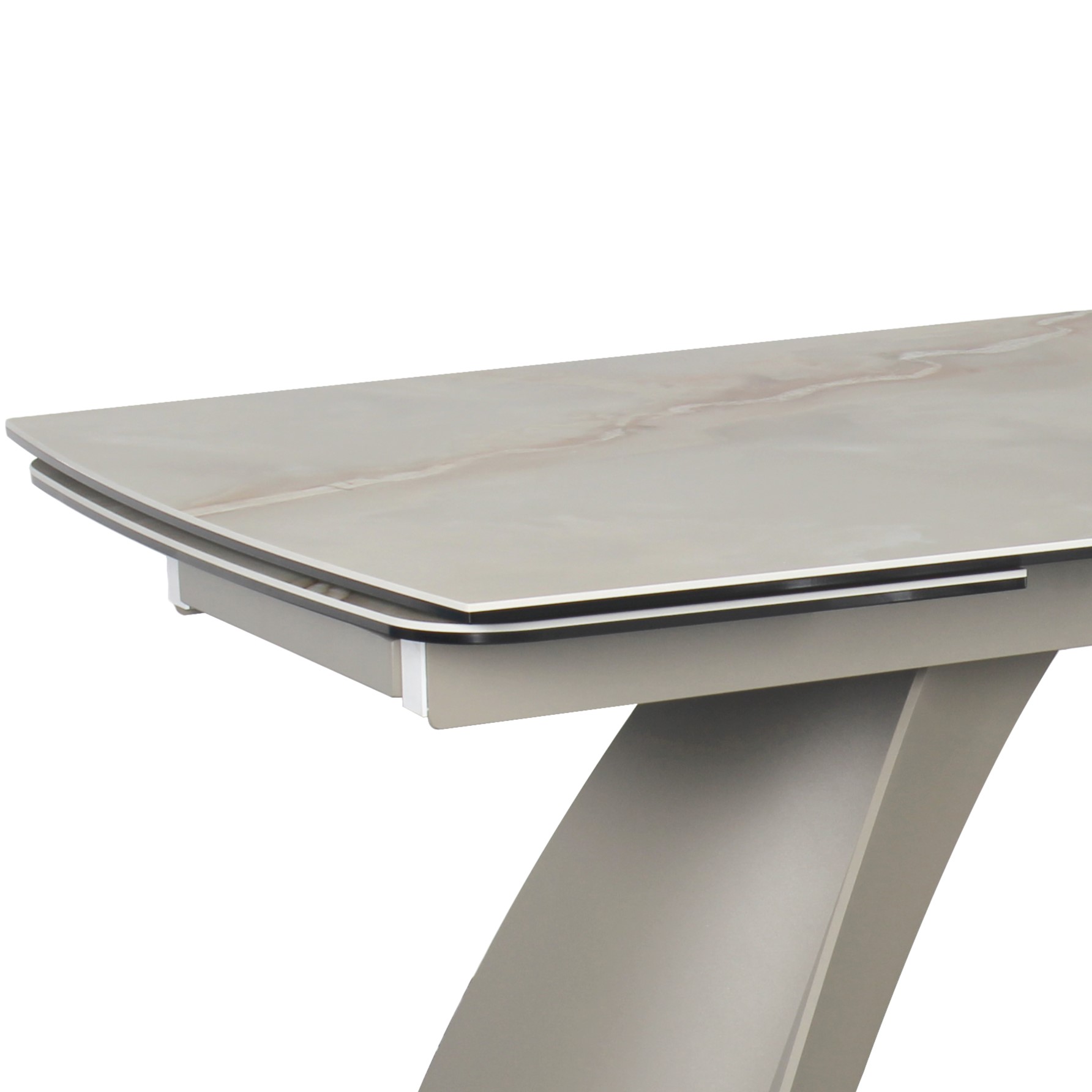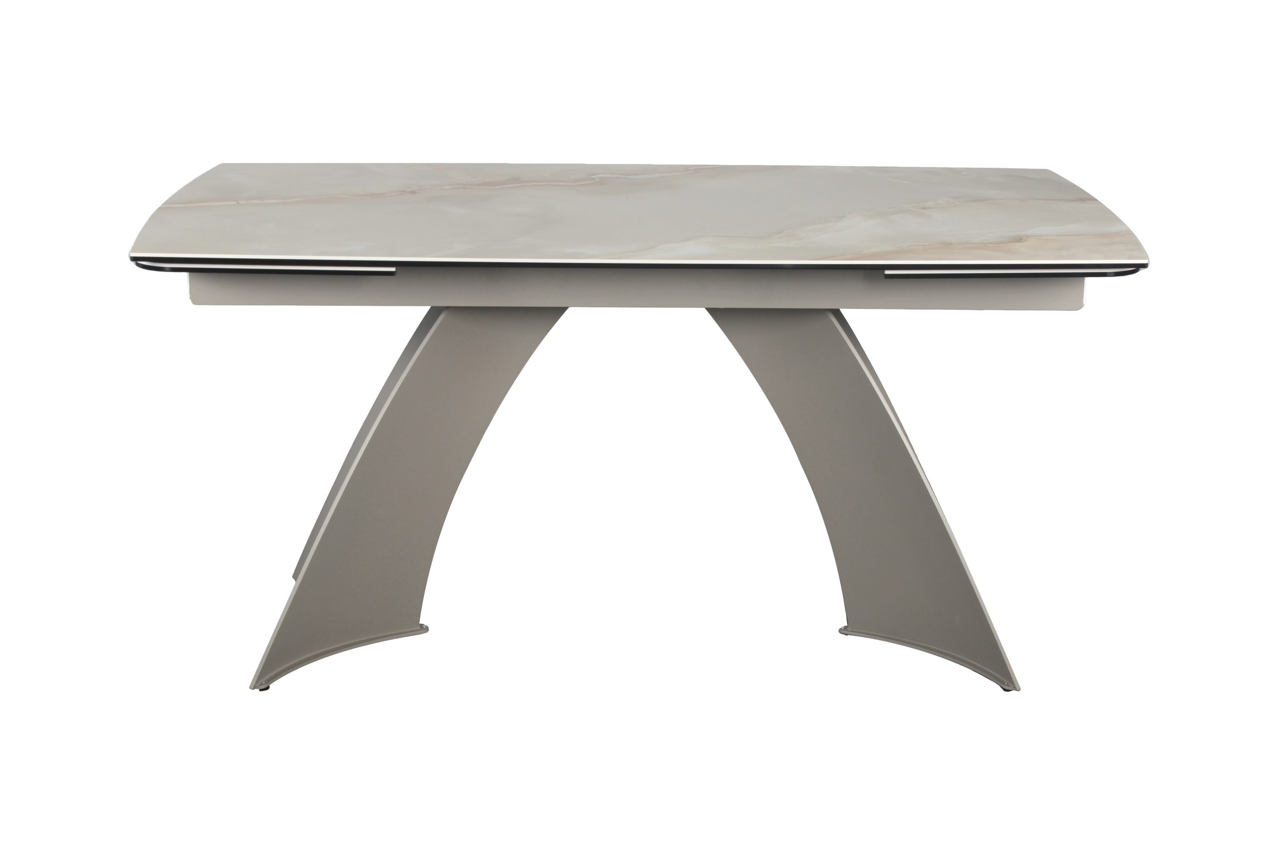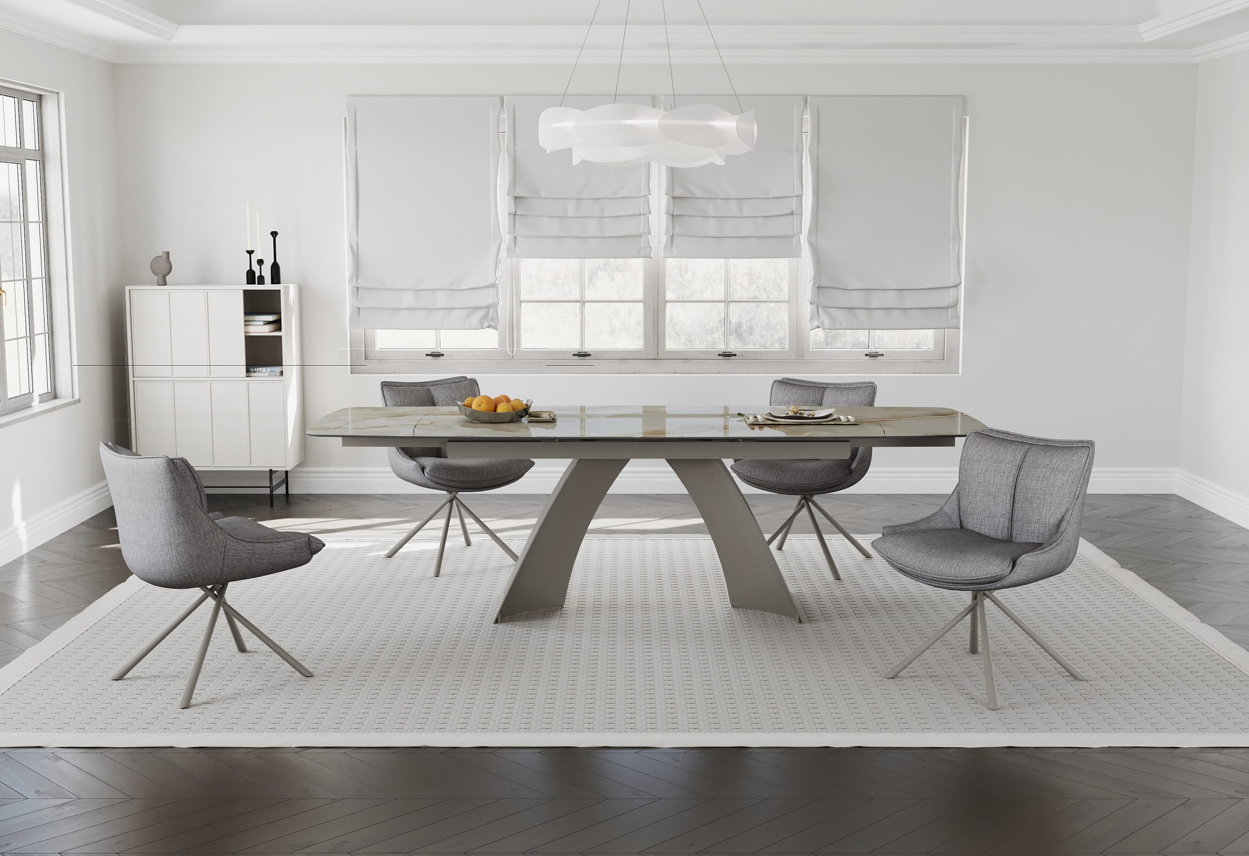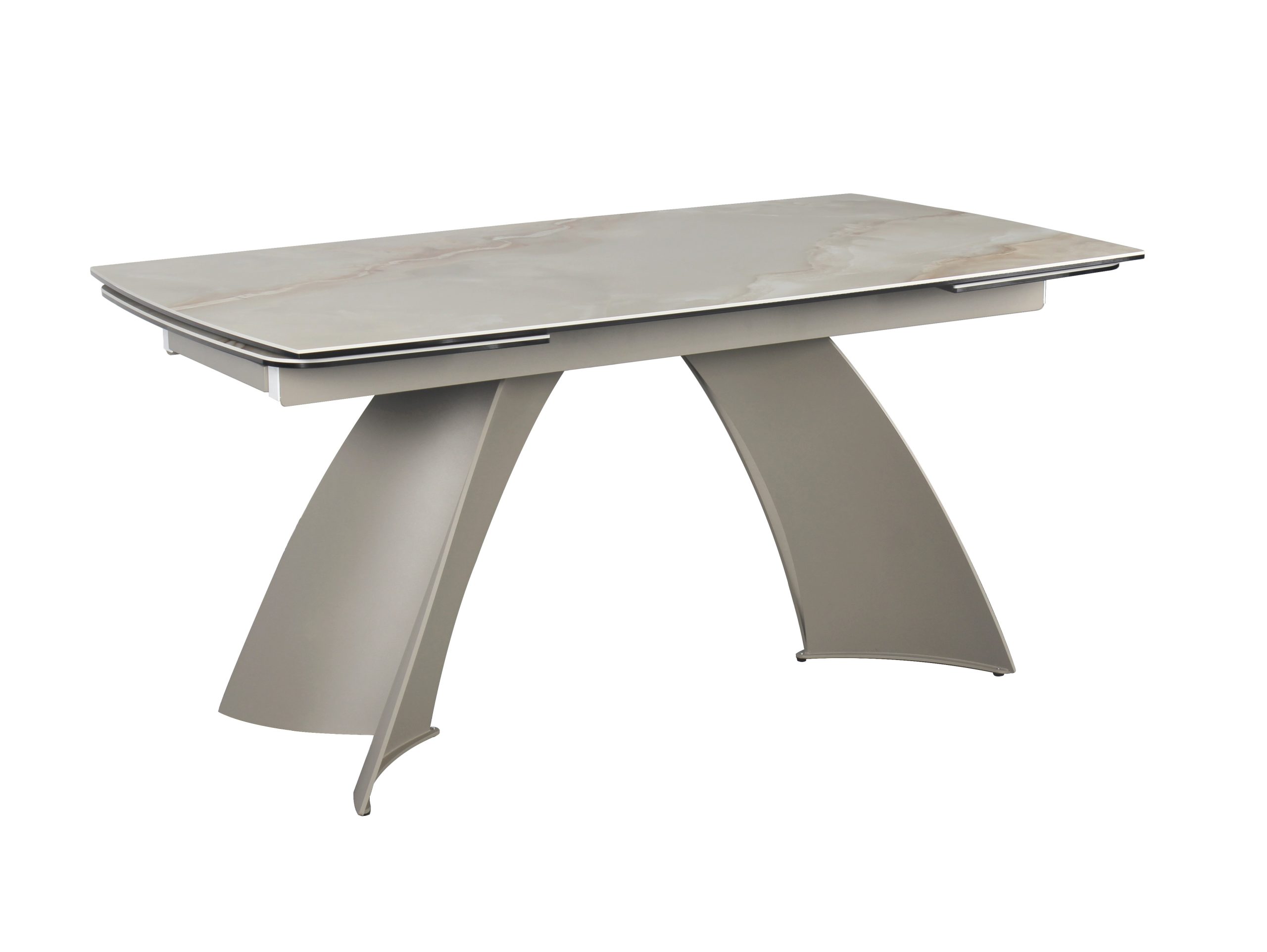 Velika raztegljiva jedilna miza, v imitaciji rjavega marmorja na sivem kovinskem podnožju, ki združuje prilagodljiv dizajn z moderno izbiro materialov za središče sodobnega jedilnega prostora.