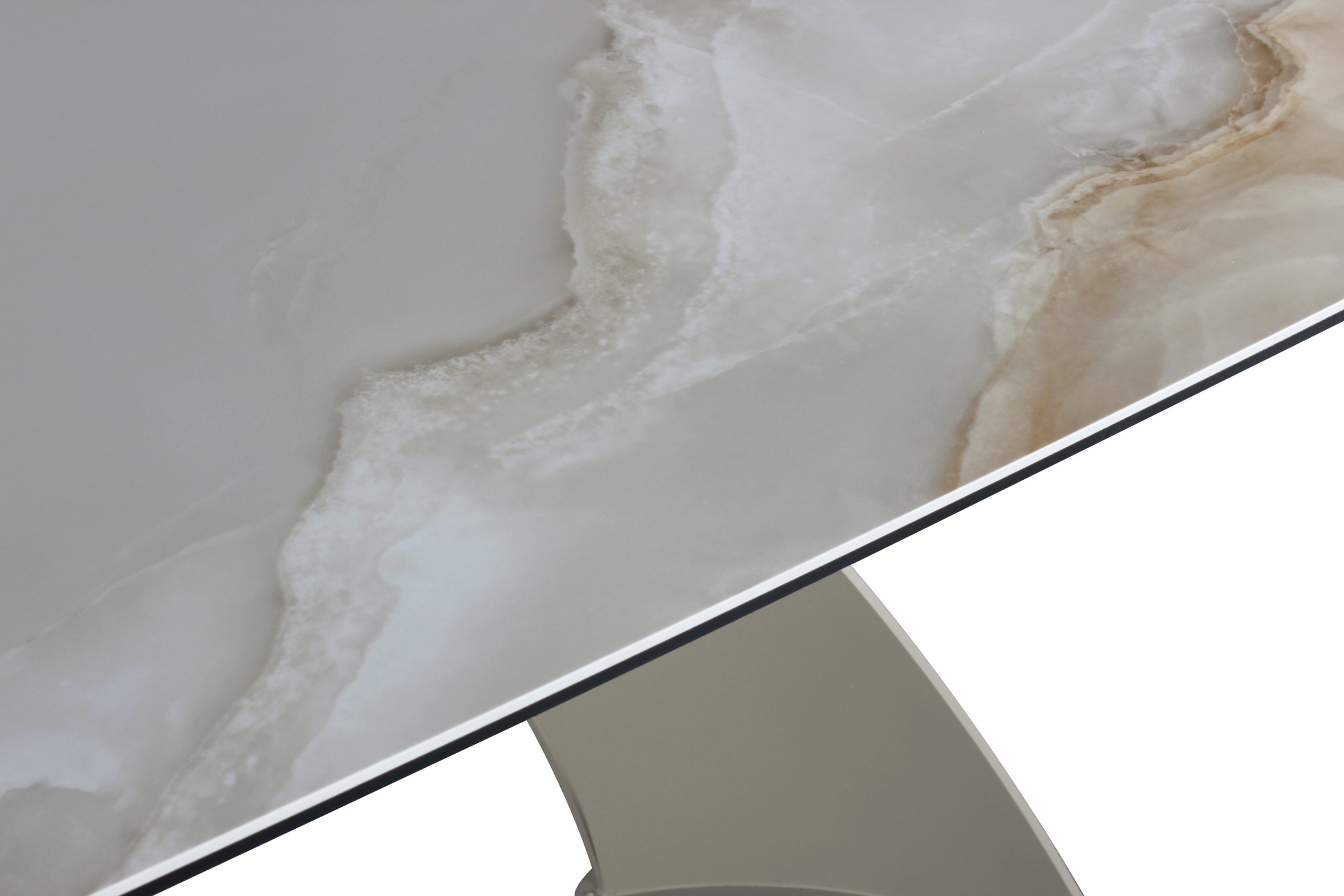Plošča je izdelana iz hibridnega materijala, ki združi 8 mm debelo plast kaljenega stekla ter 4 mm plastjo keramike Onice. Ta kombinacija materijalov zagotavlja enostavno čiščenje, minimalno toplotno raztezanje ter odpornost na praske. Rjavi marmorni vzorec na keramični površini posnema naravni kamen z bogatimi žilami in globino.
