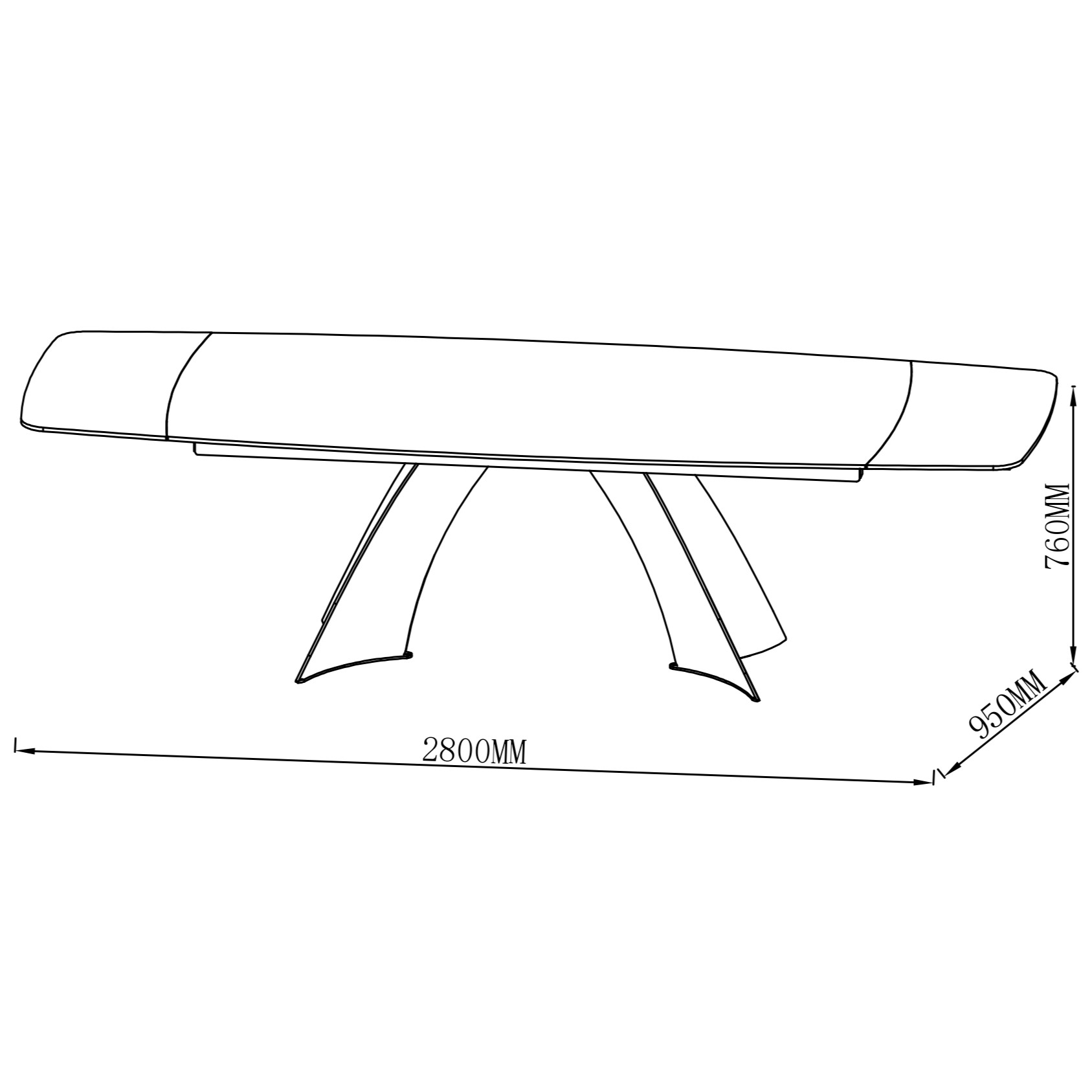 Osrednjo mizno ploščo velikosti 200×95 cm je mogoče raztegniti z dvema integriranima 40 cm stranicama, in jo brez napora zložiti za bolj kompaktno, vsakodnevno uporabo. Z velikostjo do 280×95 cm ob največjem razponu se enostavno prilagodi različnim okoliščinam, kot npr.