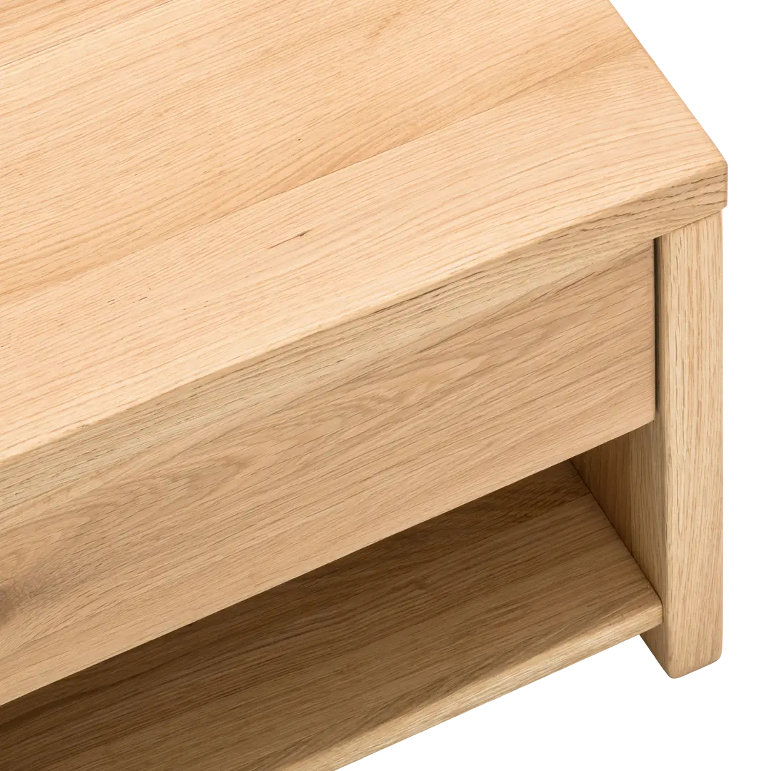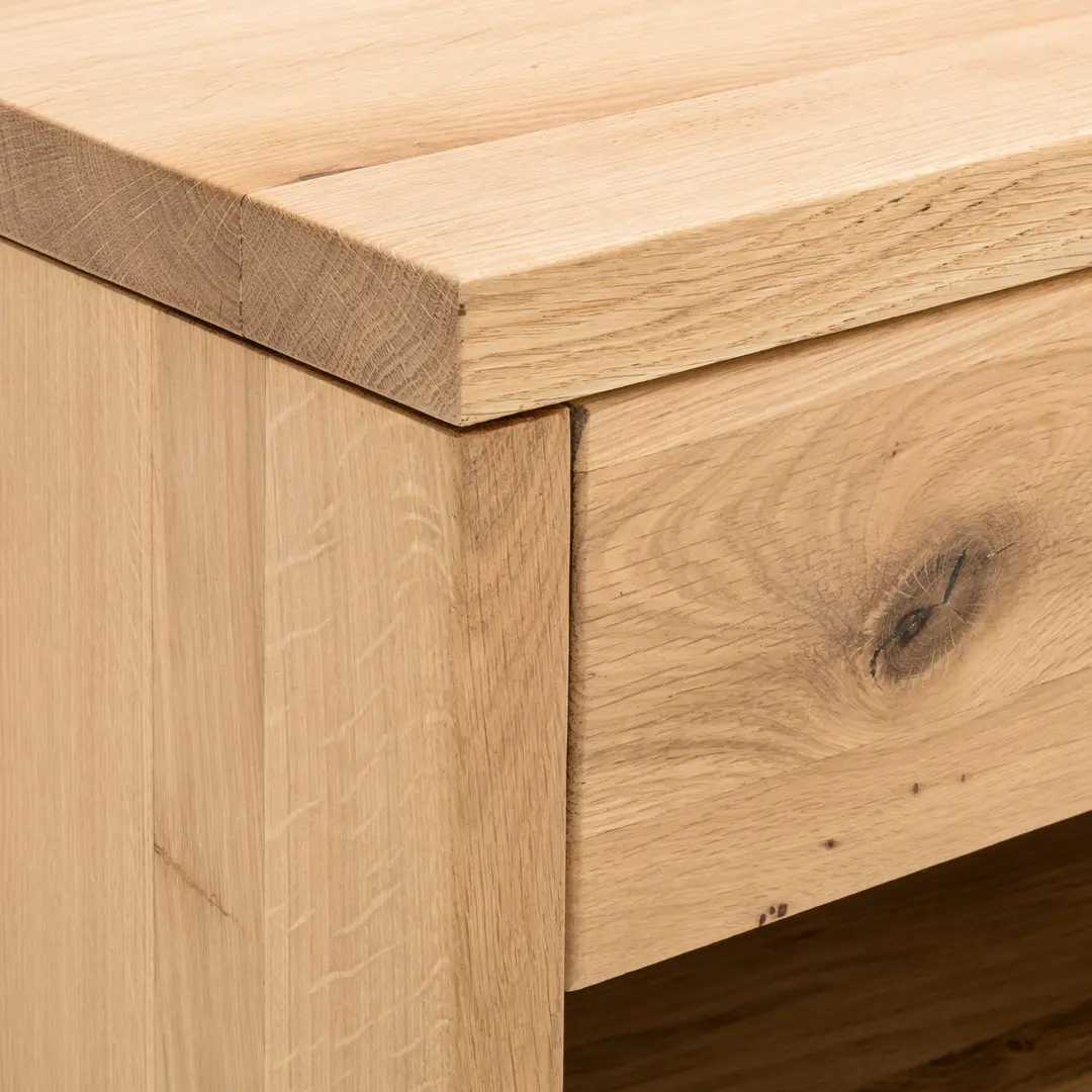 Priročna nočna omarica z enim predalom, v celoti izdelana iz masivnega lesa hrasta.