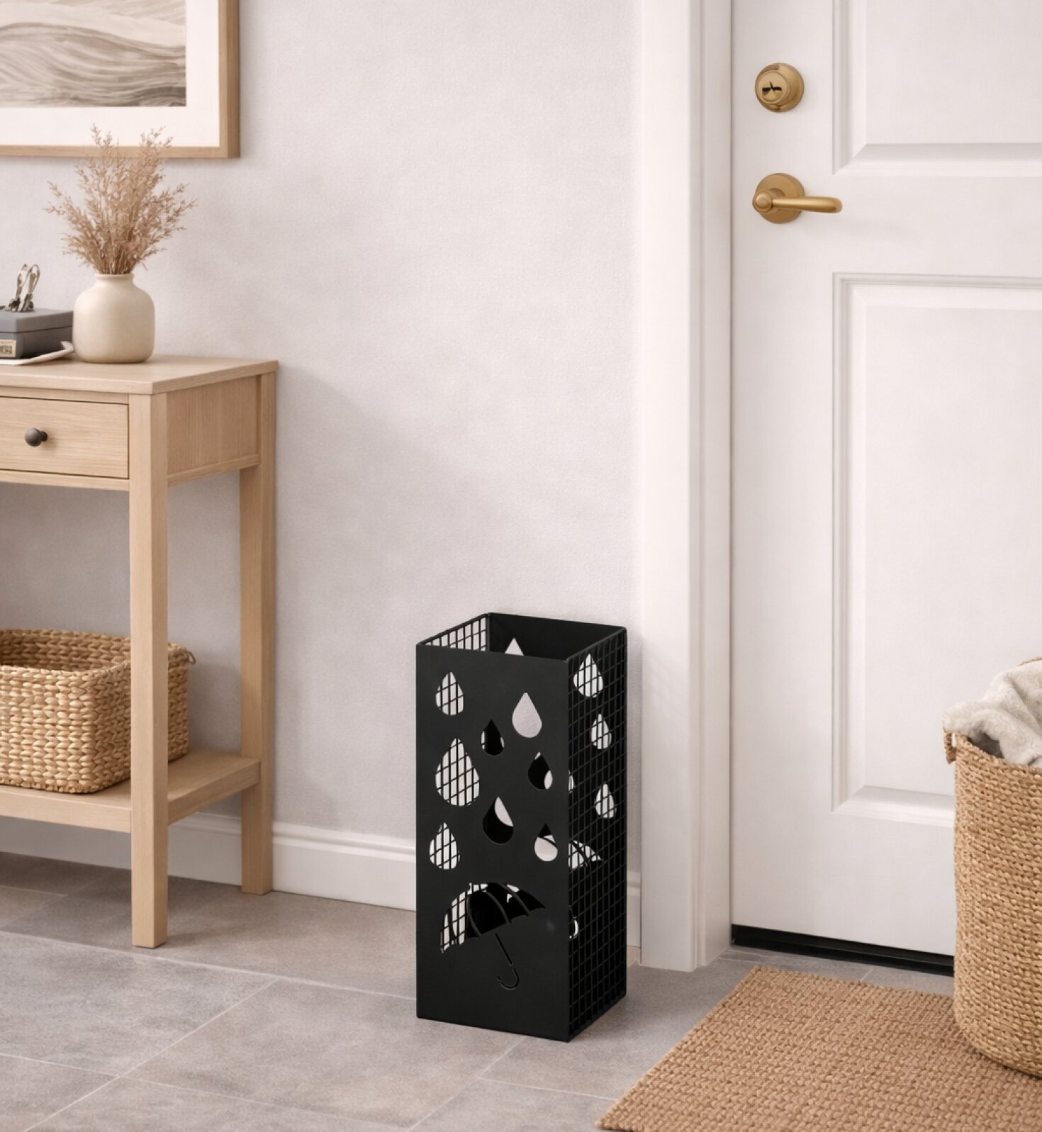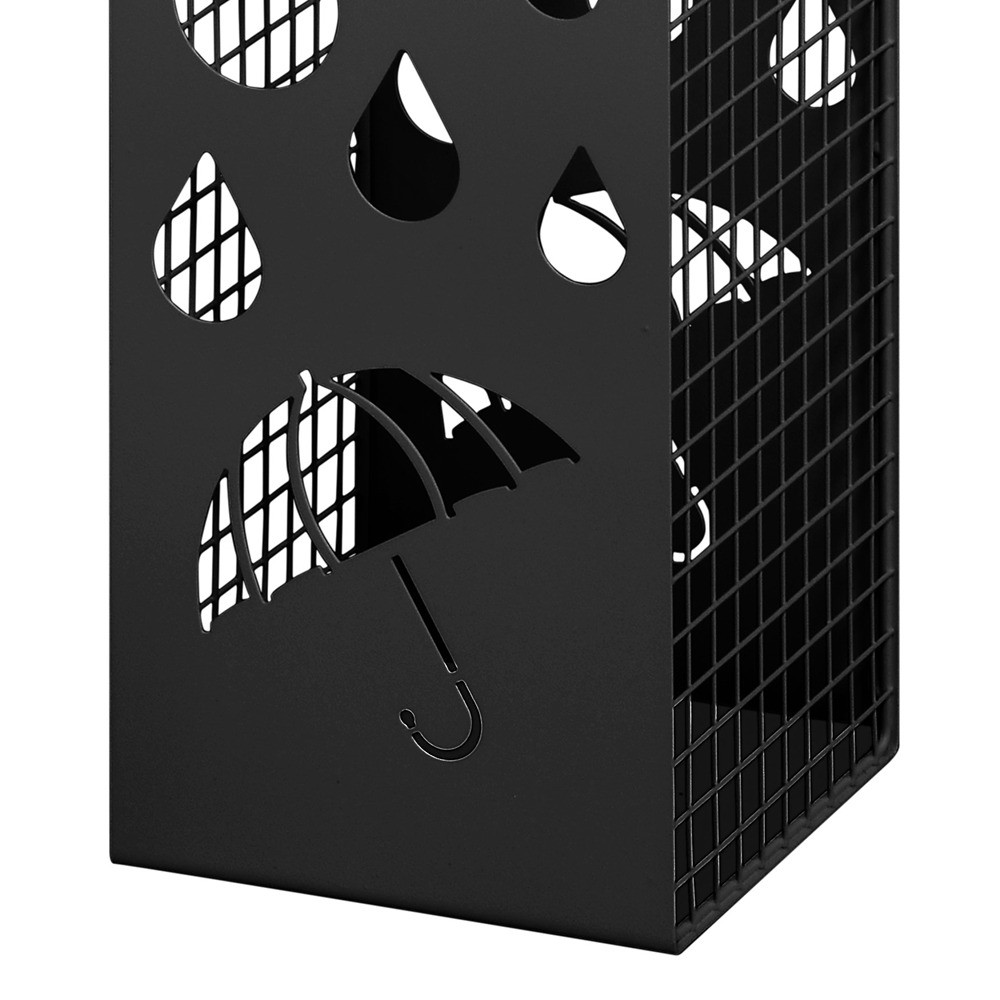 Praktičen koš za dežnike, ki se s svojo kvadratno obliko dobro prilega v vsak kot.