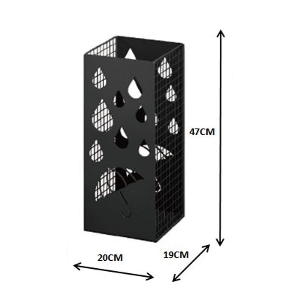 Praktičen koš za dežnike, ki se s svojo kvadratno obliko tesno prilega v vse kote. V celoti je izdelan iz jeklene žice in tankih jeklenih plošč, prašno lakiranih v črno barvo za boljšo zaščito. To prosto stoječe stojalo lahko uporabite pri vhodu ali na hodniku vašega doma, stanovanja ali pisarne. Uporablja se lahko za odlaganje in organizacijo vaših dežnikov, sprehajalnih palic in drugih pripomočkov. Z okrašenimi stranicami bo videti odlično tudi kot preprost dekorativni element in hkrati tudi trdno držalo vaše dežnike.