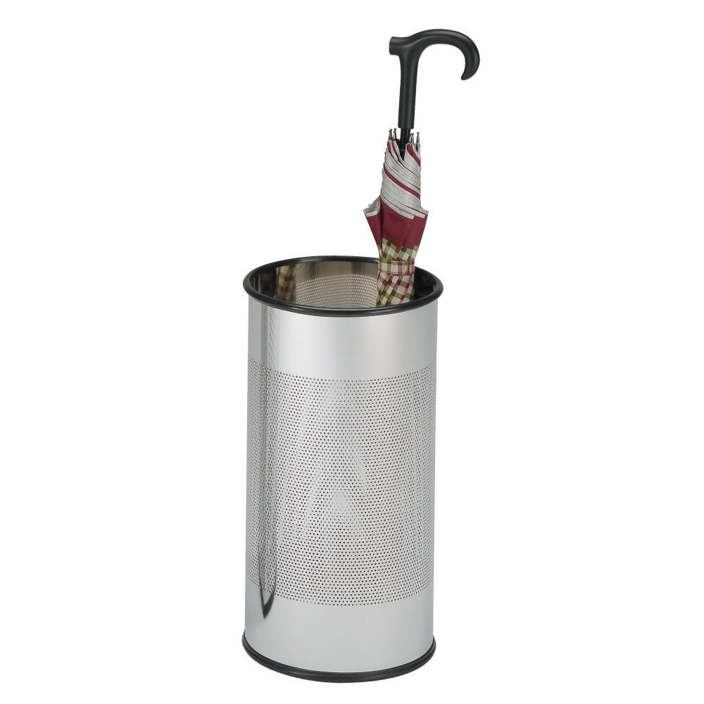 Kovinski koš v krom barvi, ki se lahko uporablja tako za odlaganje smeti ali dežnikov.