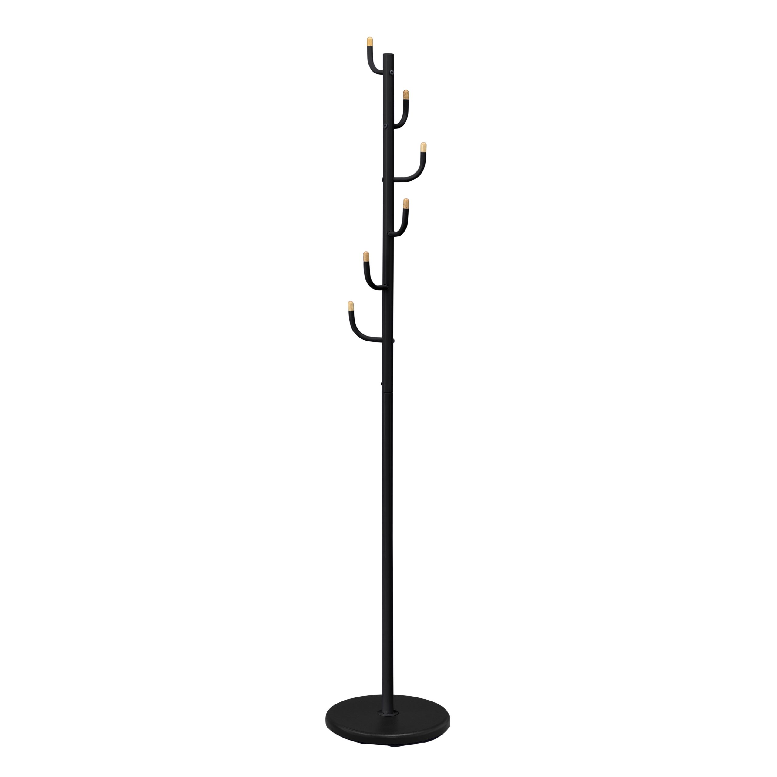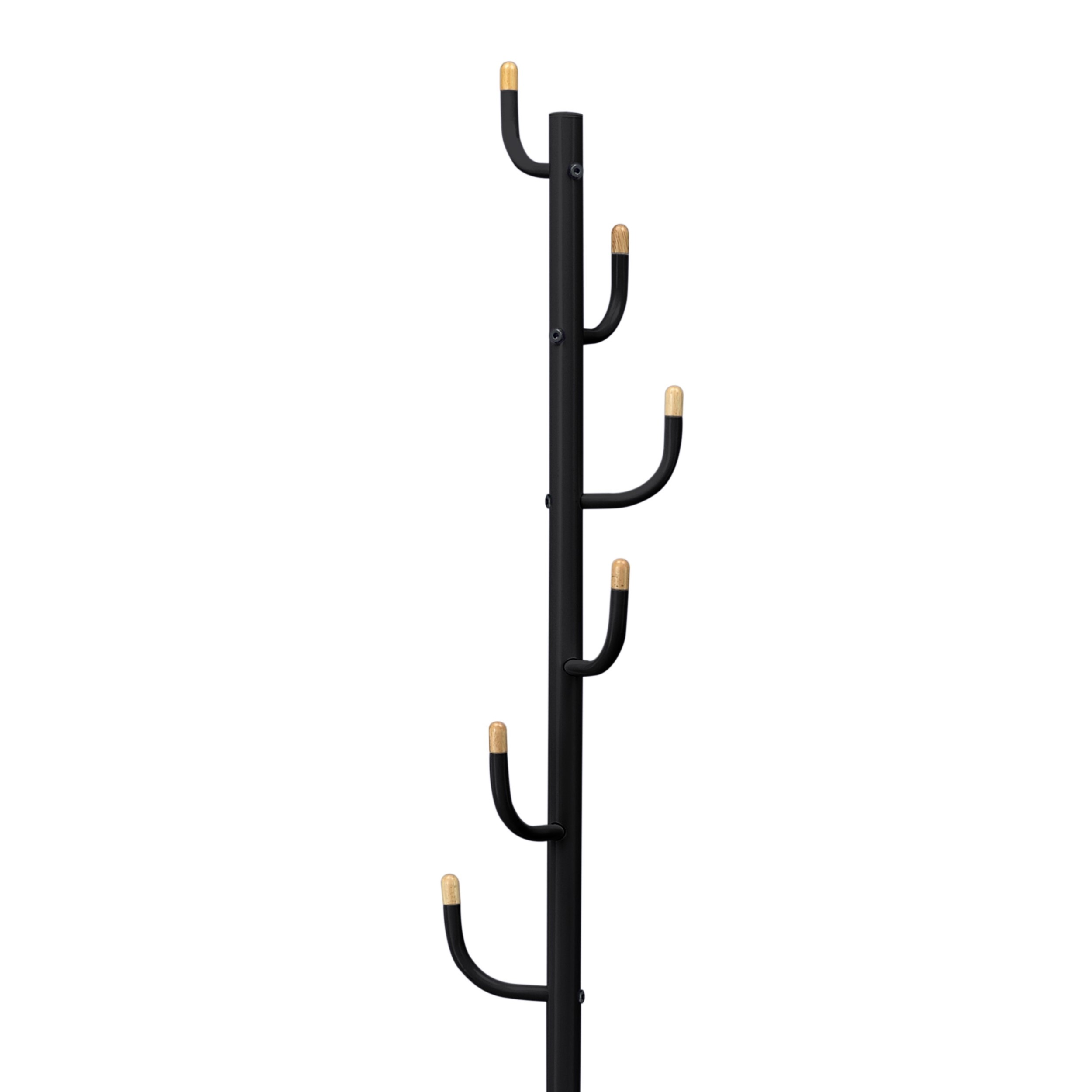 Opremljeno je s šestimi kljukami, ki so razporejene na različnih višinah za optimalno izrabo prostora. Vsaka kljuka ima konco iz lesa, v svoji naravni barvi, kar hkrati ščiti oblačila pred poškodbami in obenem doda topel, naraven poudarek kovinski konstrukciji.