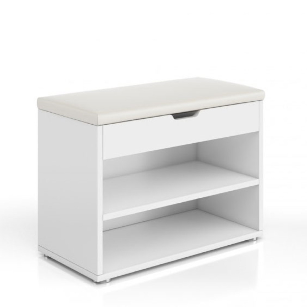 Praktična omara za čevlje, ki jo ob enem lahko uporabljate tudi kot klop. Omara je v beli barvi, narejena iz MDF materiala, zgonji del pa je oblazinjen z belim umetnim PU usnjem. Omarica ima zgoraj zaboj, pod njem pa sta dve polici, kjer lahko odložite čevlje ali druge predmete.
