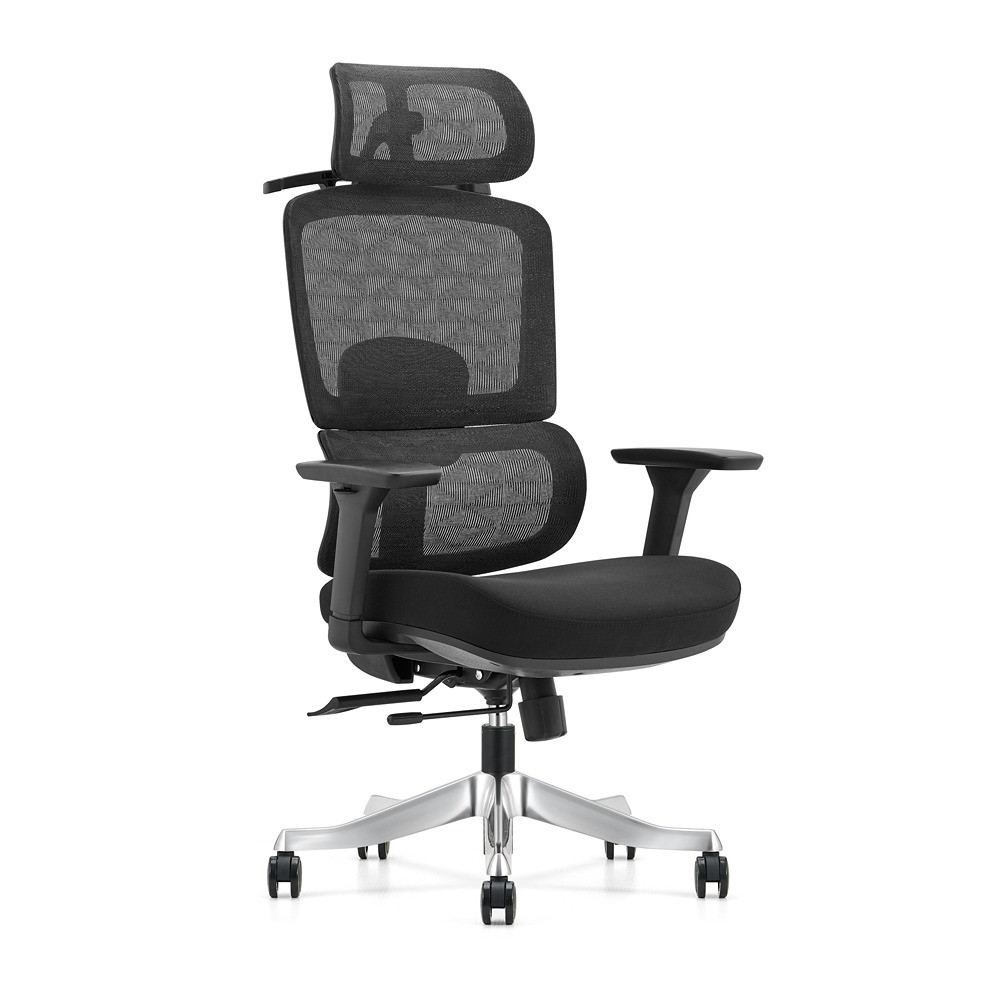 Ergonomičen pisarniški stol v črni barvi, primeren za pisarno prihodnosti! Stol je vrtljiv in nastavljiv po višini, s plinskim mehanizmom v glavnem stebričku, poleg tega pa ponuja tudi več drugih možnosti za prilagajanje. Hrbtišče stola je izdelano iz najlona in oblazinjeno z mrežasto tkanino ki prepušča zrak. Opremljeno je z mehanizmom ki omogoča da se lahko samo hrbtišče nastavlja po višini neodvisno od glavnega plinskega mehanizma. Hrbtišče ima poleg tega tudi nastavljivo ledveno podporo, 2D nastavljiv vzglavnik in vgrajen obešalnik kjer lahko obesite jakno ali druga oblačila. Črni rokonasloni so narejeni iz poliuretana in so nastavljivi v treh dimenzijah. Večpozicijski mehanizem z drsnikom omogoča da si lahko po želji nastavite tudi primerno globino stola. Sedež je za večje udobje napolnjen z brizgano peno. Podnožje stola je izdelano iz aluminija in ima 60 mm PU kolesca, s tihim gibanjem. Maksimalna nosilnost teže je 120 kg.