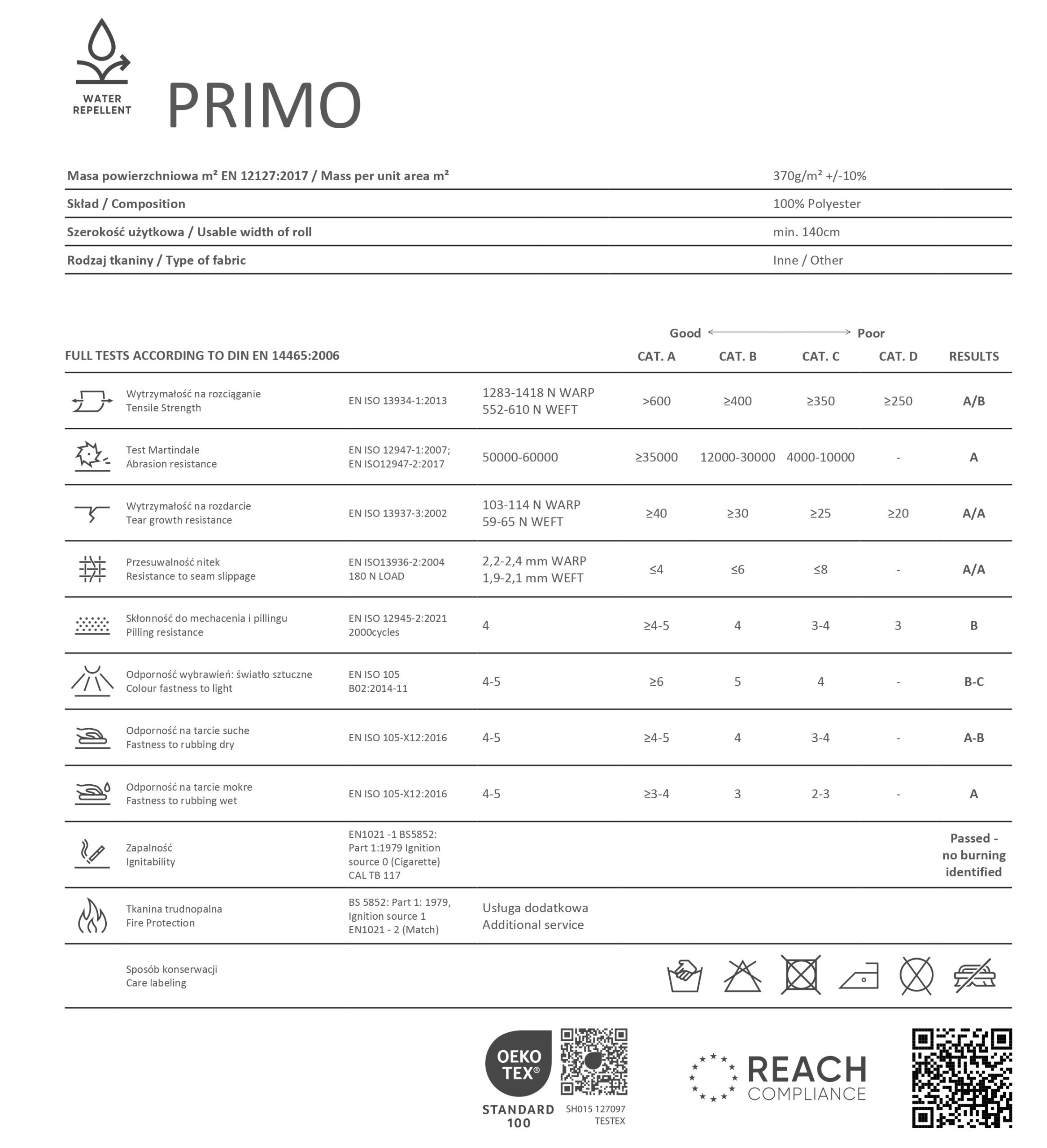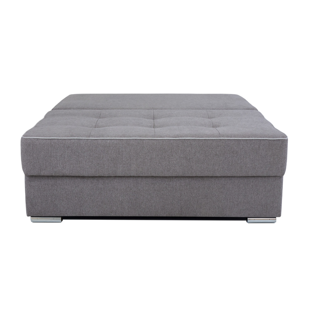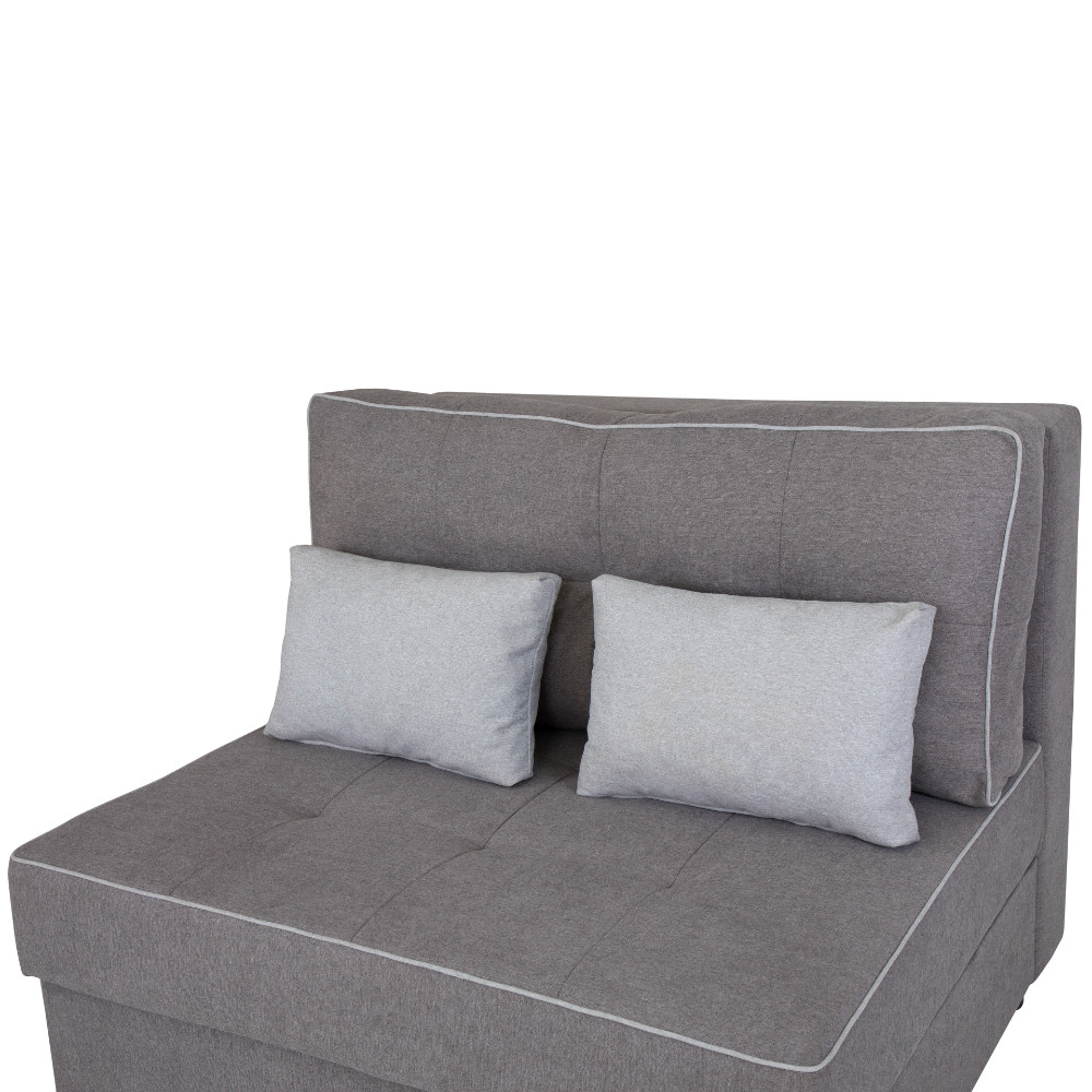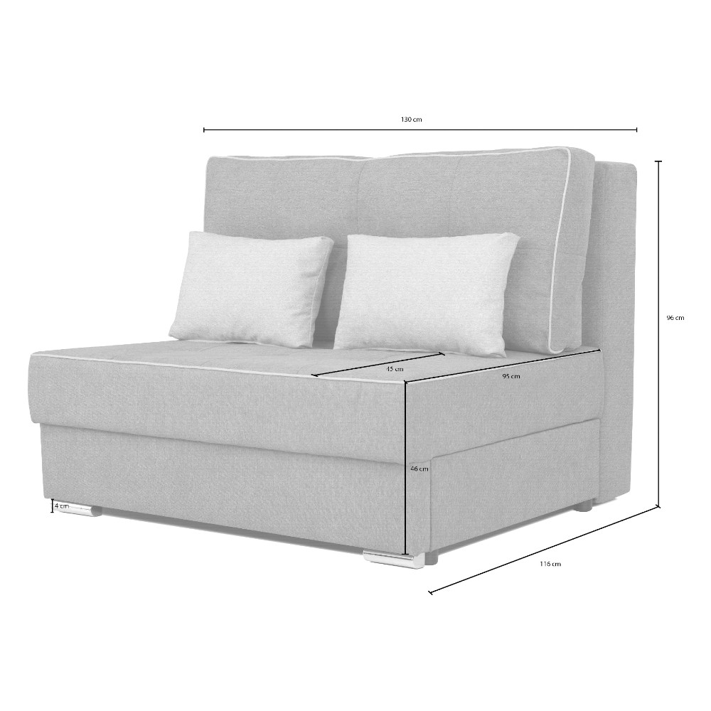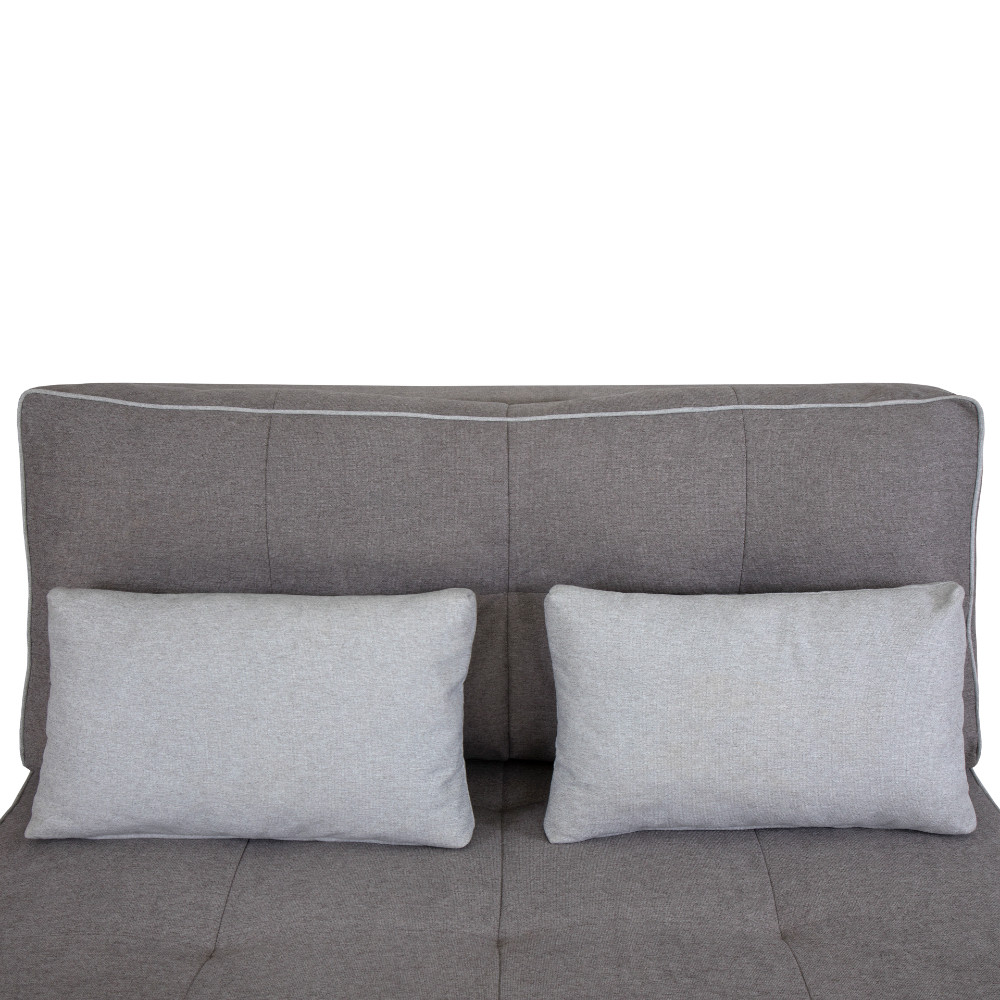 Udoben dvosed ki se lahko raztegne v kompaktno posteljo, na voljo v sivi barvi. Sedišče je opremljeno z bonell vzmetenjem in pokrito z mehko tkanino. Tkanina je popolnoma vodoodporna, skladna z evropsko direktivo REACH glede kemikalij in izdelana iz 100% poliestra, s povprečno gostoto 370g/m².