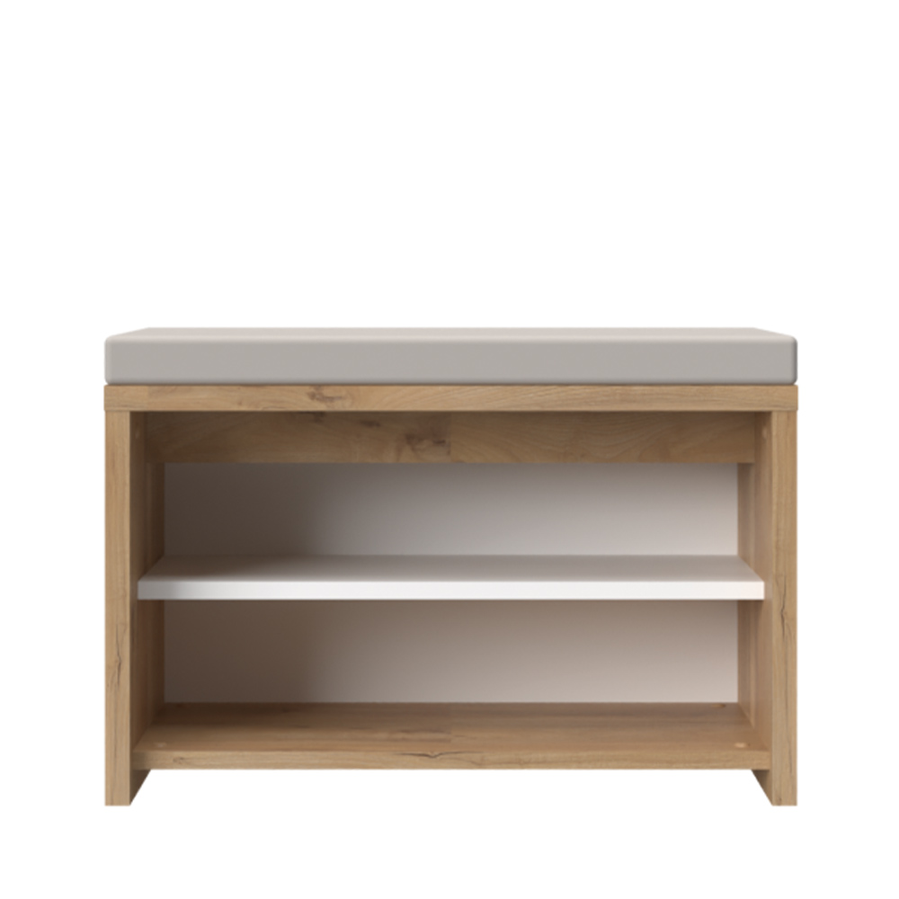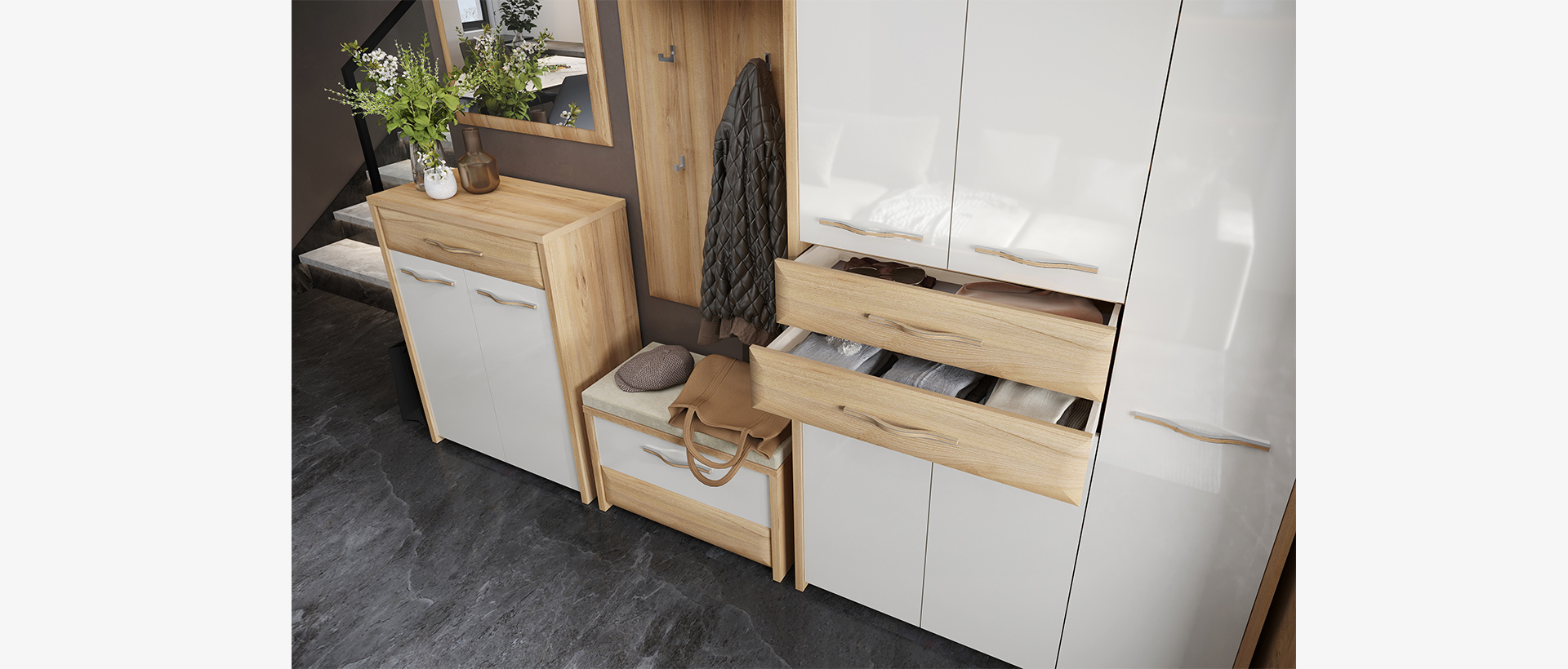 Posebno vrednost daje tudi večnamenskost posameznih elementov – klop omogoča udobno obuvanje ter dodatno shranjevanje, obešalni del pa poskrbi za hitro dostopnost najpogosteje uporabljenih kosov. Ogledalo optično poveča prostor in prispeva k svetlejšemu ambientu, kar je še posebej pomembno pri vhodnih prostorih.