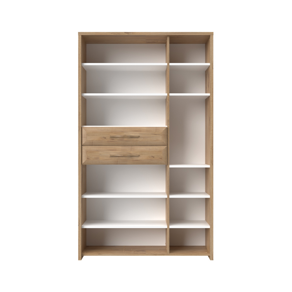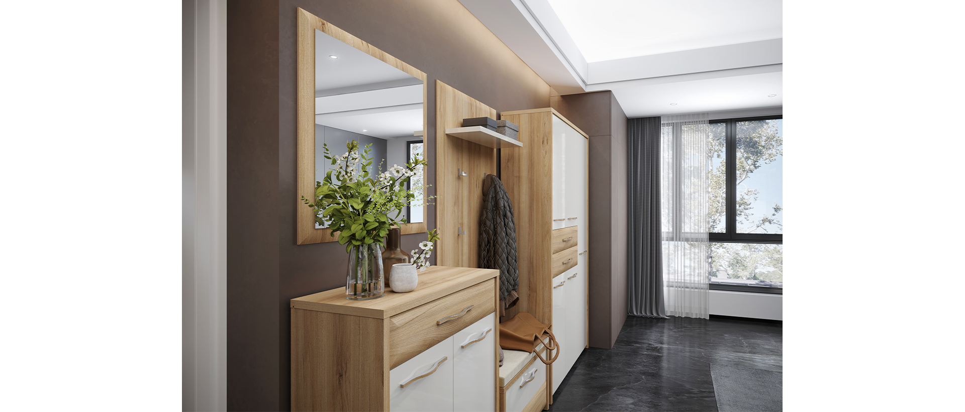Ta sodoben sestav predsobe predstavlja popolno ravnovesje med funkcionalnostjo, toplino in estetsko dovršenostjo. S premišljeno razporejenimi elementi omogoča učinkovito organizacijo prostora, hkrati pa ustvarja prijeten in urejen prvi vtis doma. Kombinacija garderobne omare, komode, stenskega obešalnega panela, klopi za obuvanje ter ogledala zagotavlja, da imate vse na dosegu roke – od shranjevanja oblačil in obutve do priročnega odlaganja vsakodnevnih predmetov.