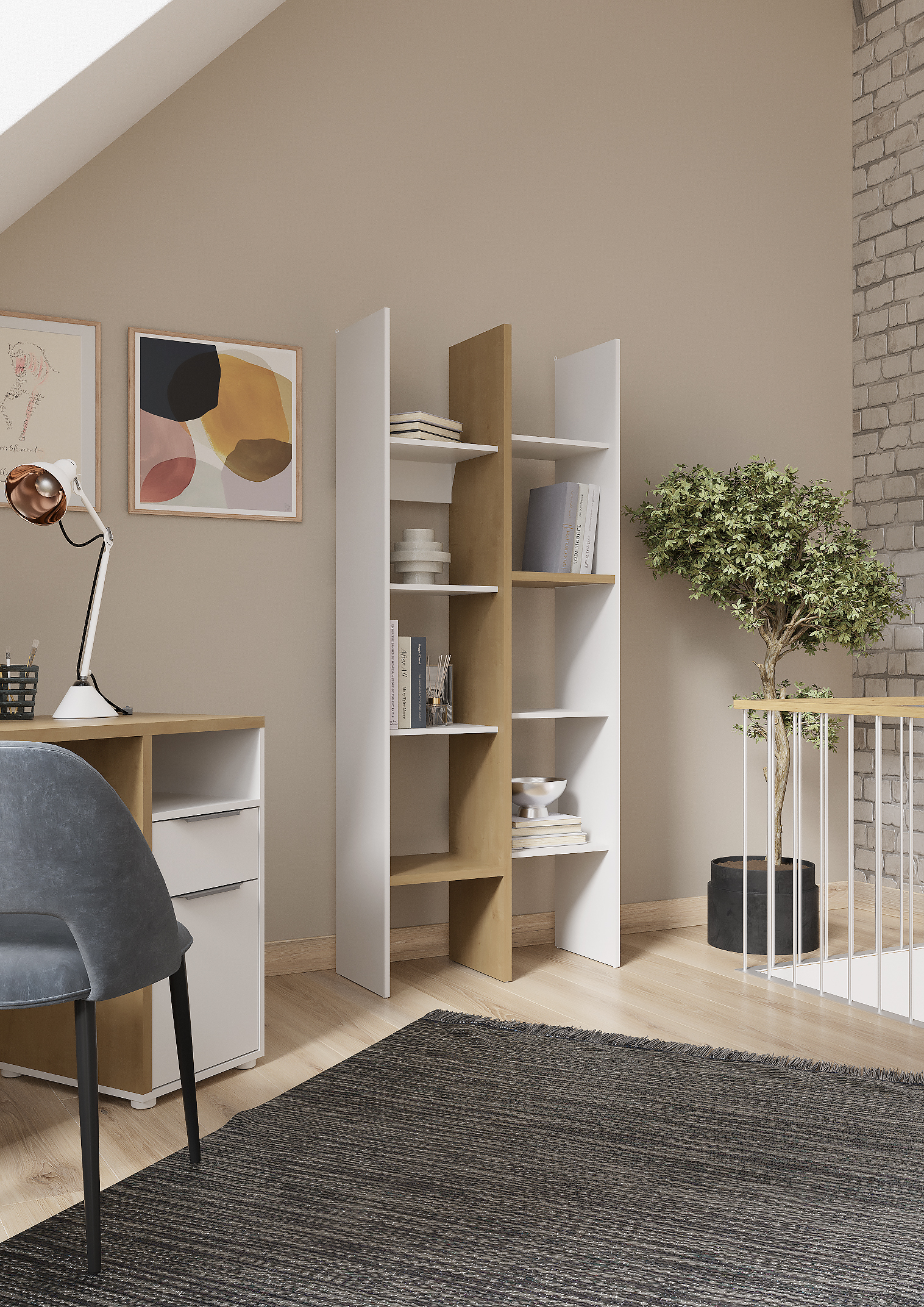 Dekorativni poličnik, primeren tako za dnevne sobe kot pisarne ali lastne sobe. Njegove kompaktne dimenzije omogočajo enostavno integracijo v različne prostore. Na voljo je v kombinaciji bele in rjave barve ter izdelan iz kakovostnega iverala, oblečenega v melamin, iz plošč debeline 1,5 cm in 2,5 cm. Poličnik ima 8 odprtih polic, vsaka ima maksimalno nosilnost do 4 kg. Celoten poličnik je izdelan v Franciji.