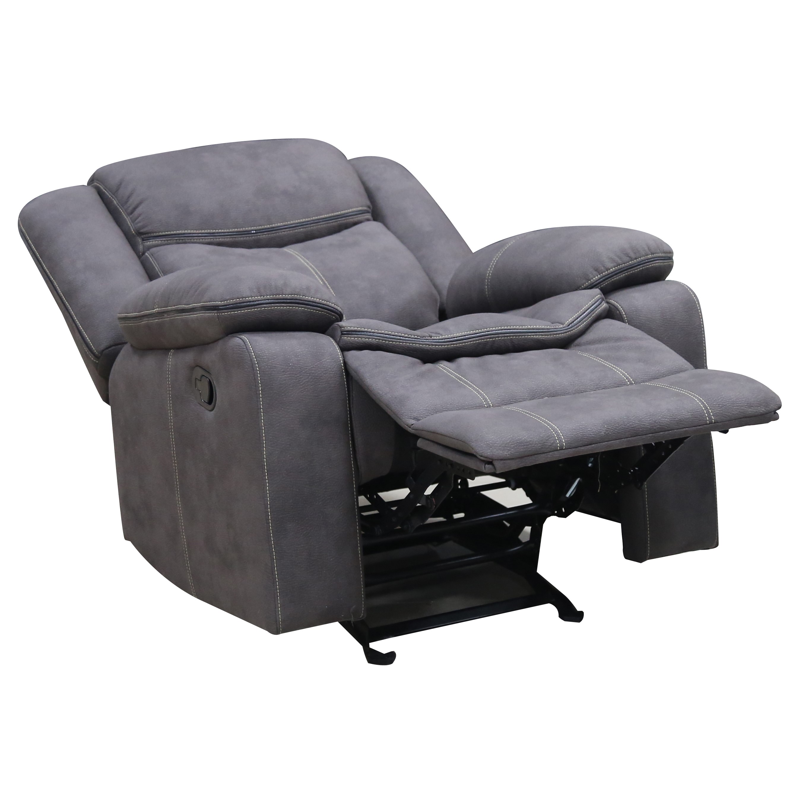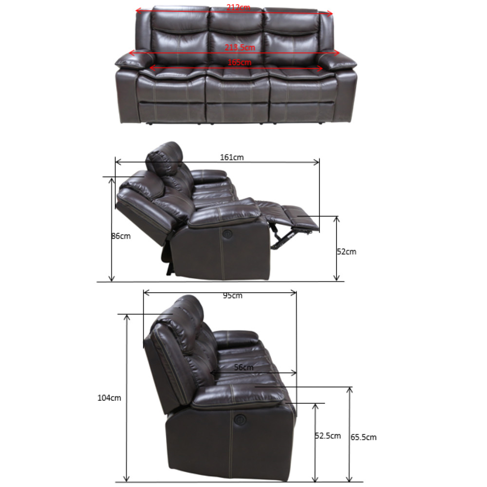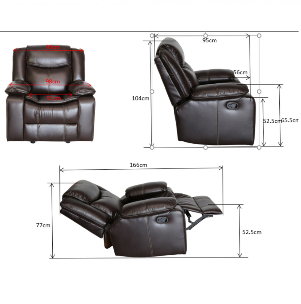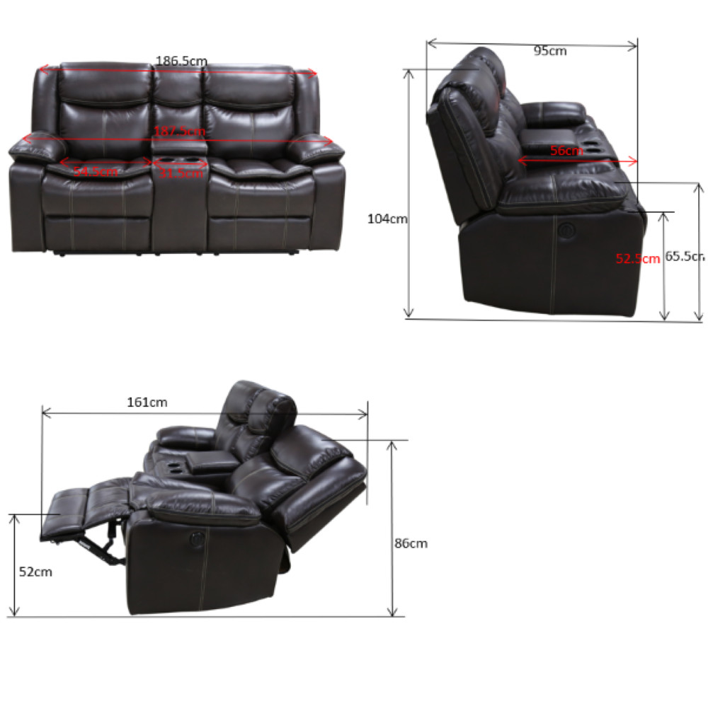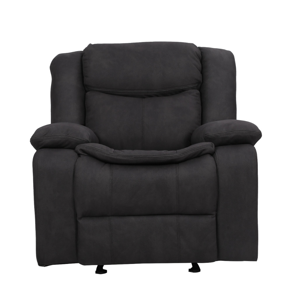Čudovita sedežna garnitura je na voljo kot fotelj, dvosed in trosed. Bogato oblazinjenje in udobna sedišča nadgrajuje relax funkcija, ki omogoča, da se sedišče s pomočjo ročke ob strani sedeža preoblikuje: hrbtni del se spusti, naslonjalo za noge dvigne. Relax funkcijo imajo fotelj, oba sedišča dvoseda in stranska sedišča troseda. Fotelj ima tudi funkcijo guganja. Dvosed se ponaša dodatno še s sredinsko konzolo, ki ima dva nosilca za kozarce in priročen shrambni predal. Sedežna garnitura je oblazinjena v sivo ali rjavo tkanino s poudarjenimi dekorativnimi šivi. Maksimalna nosilnost: 136 kg. Sedežna ganitura je opremljena z valovitimi vzmetmi, žepkastim vzmetenjem in elastičnimi trakovi.