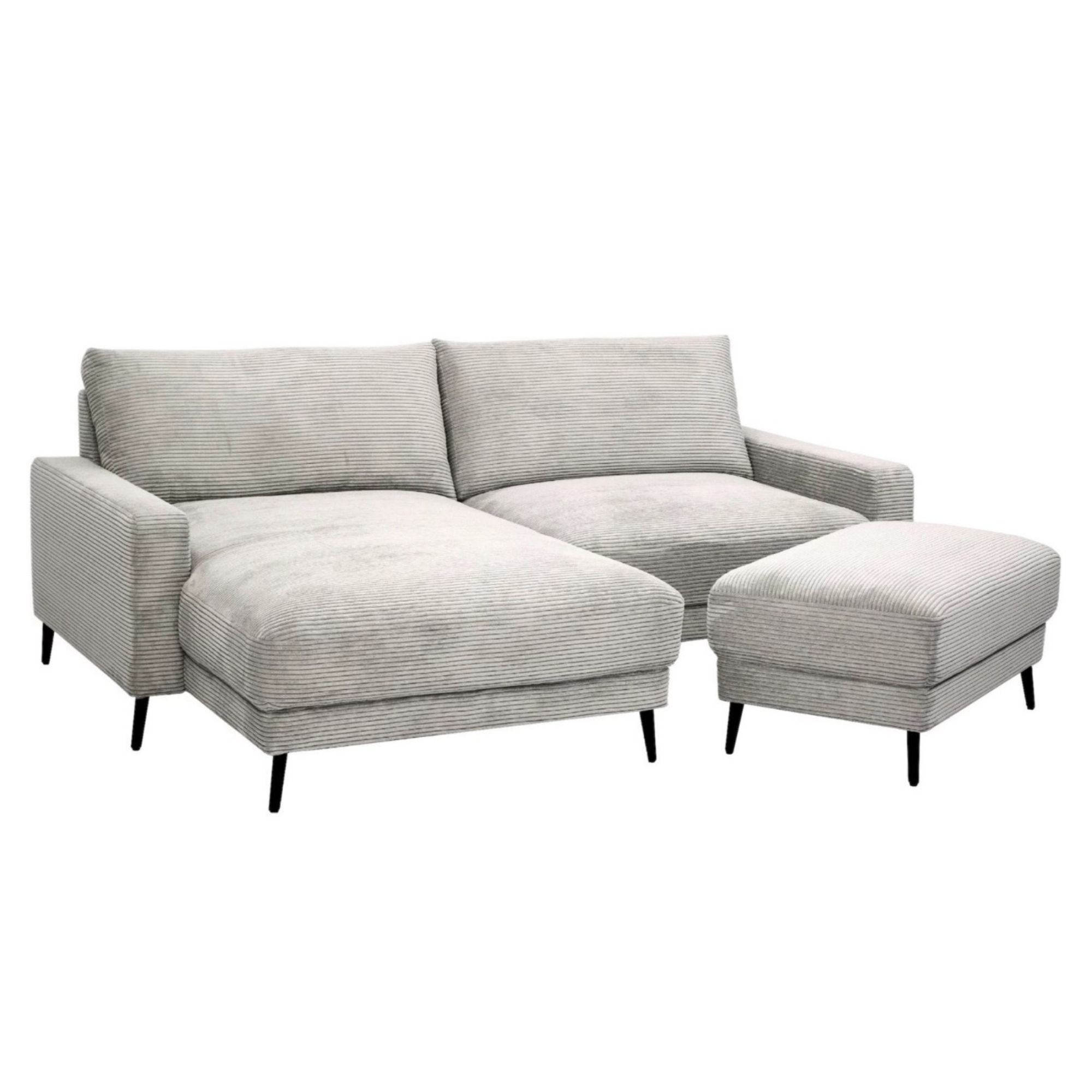 Sedežna garnitura v celoti oblazinjena s kakovostno tkanino v nevtralni sivi barvi, ki omogoča dobro ujemanje s skandinavski ali minimalističnimi notranjostmi.