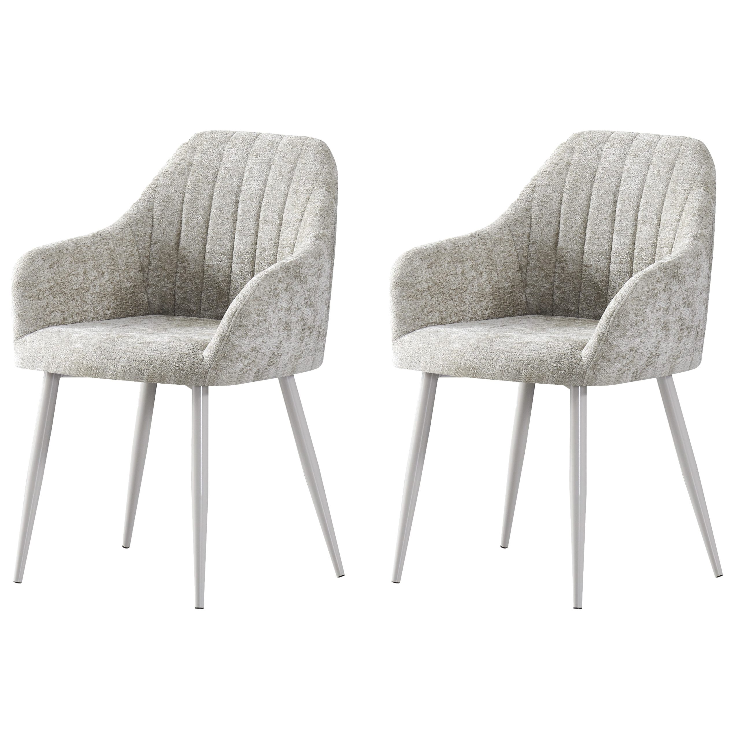 Oblazinjen jedilniški stol z nasloni za roke, ki združuje prevleko iz tkanine s kovinskim okvirjem v ujemajoči barvi.
