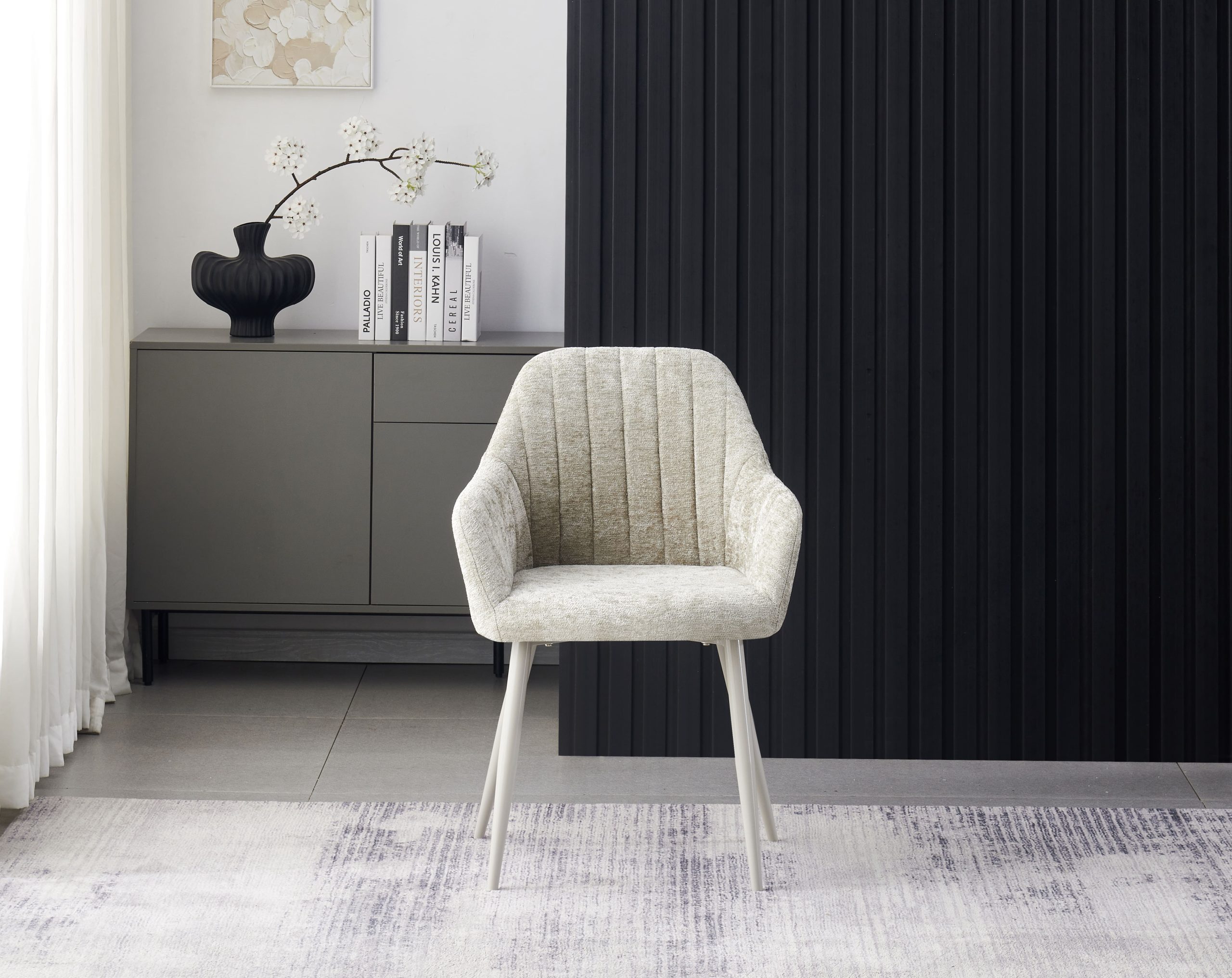 Stol je oblazinjen v tkanino v kapučino barvi, toplem nevtralnem tonu ki se dobro ujema s široko paleto notranjih dekorjev. Navpični dekorativni šivi na naslonjalu dodajo vidno strukturo in pritegnejo za dovršen videz.