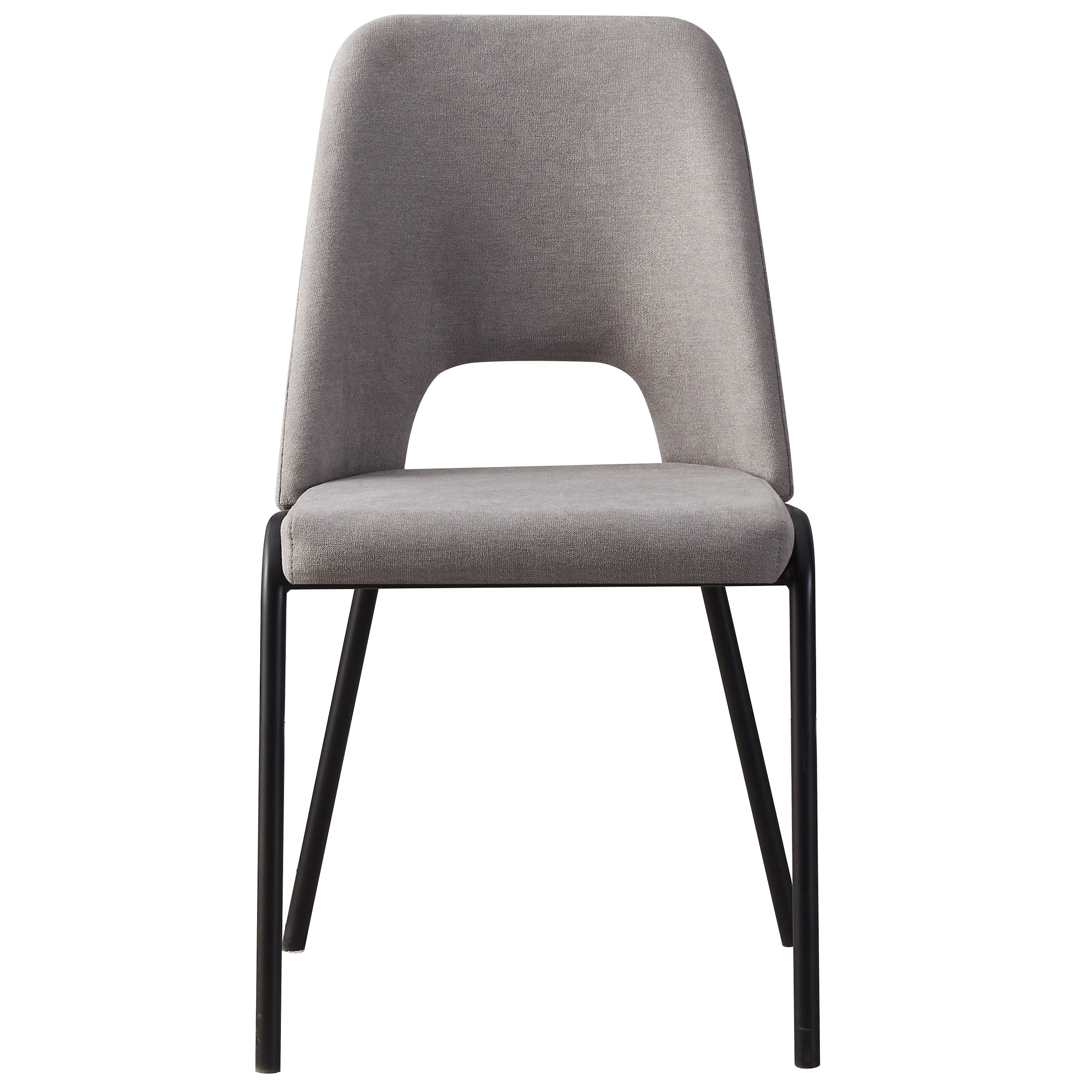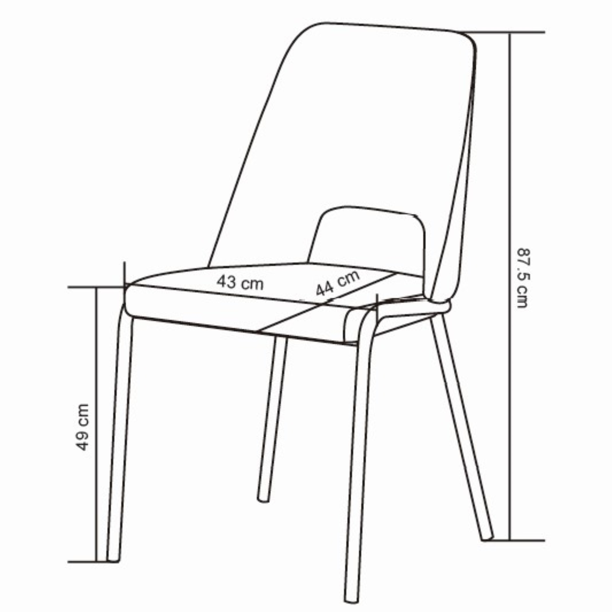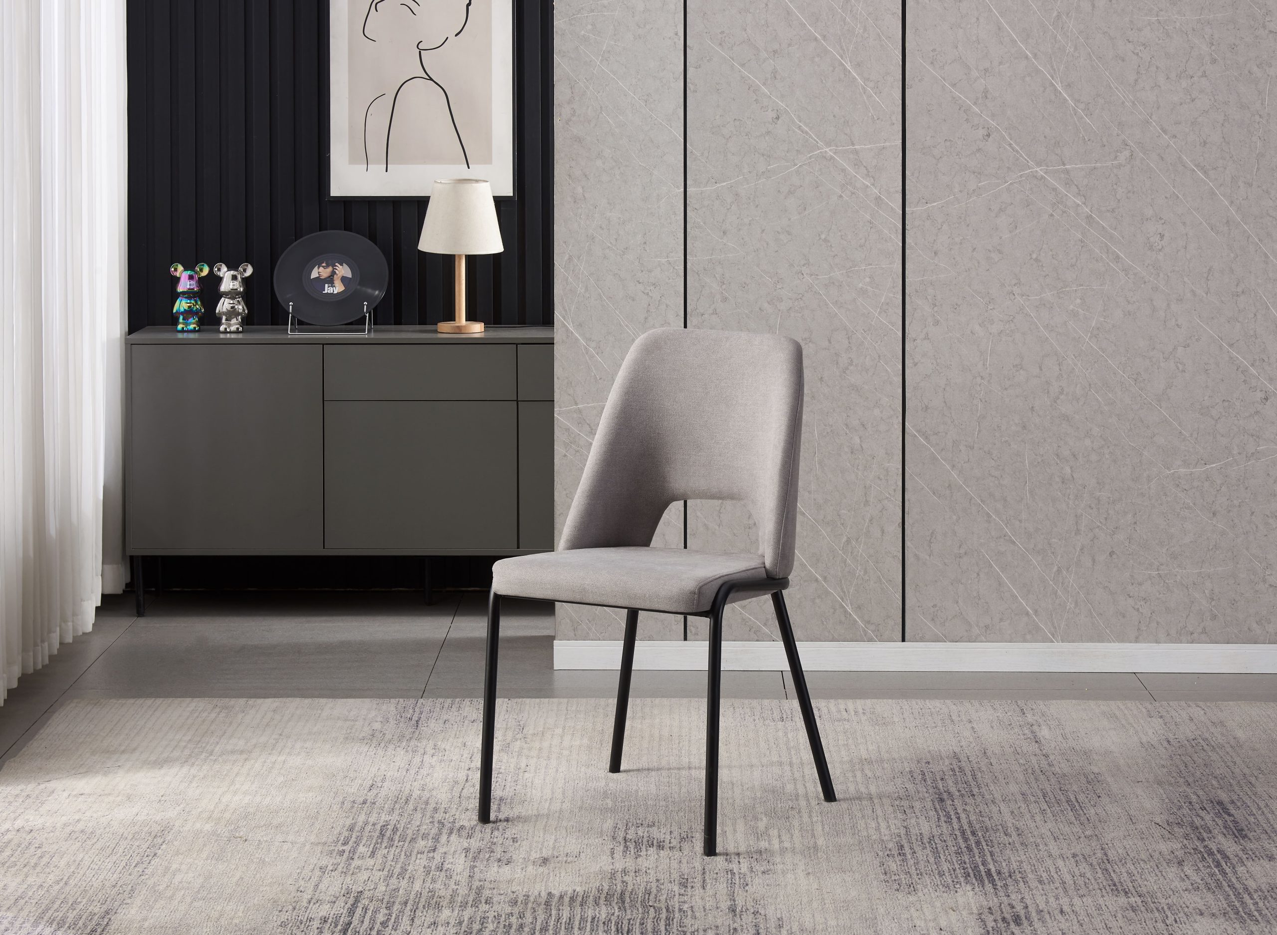 Sodoben jedilniški stol, na voljo z oblazinjenjem v bež ali sivi barvi. Odprto naslonjalo omogoča pretok zraka in ohranja svežino med sedenjem. Sedišče stola je globoko 44 cm in široko 43 cm ter je nameščeno na višini 49 cm.