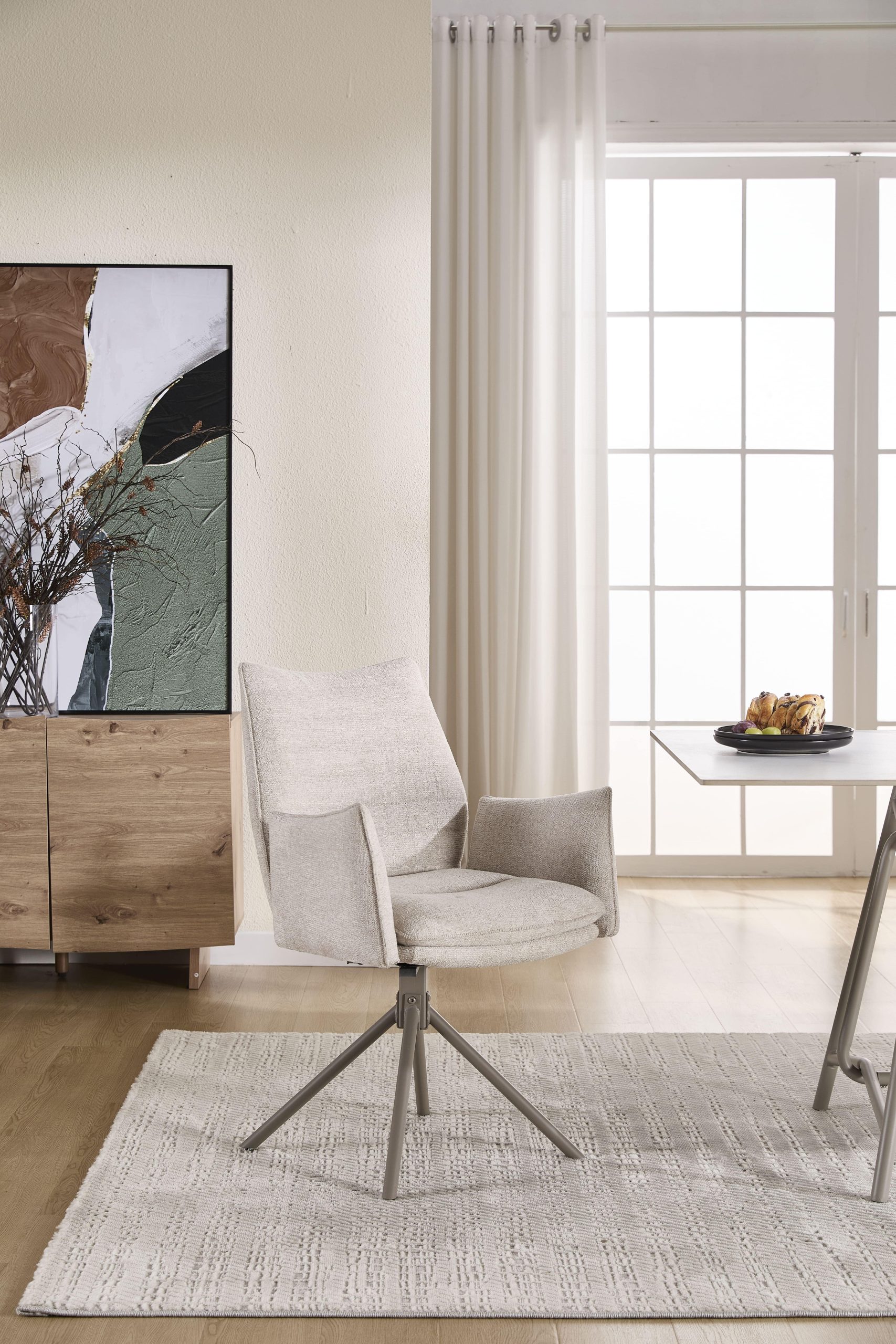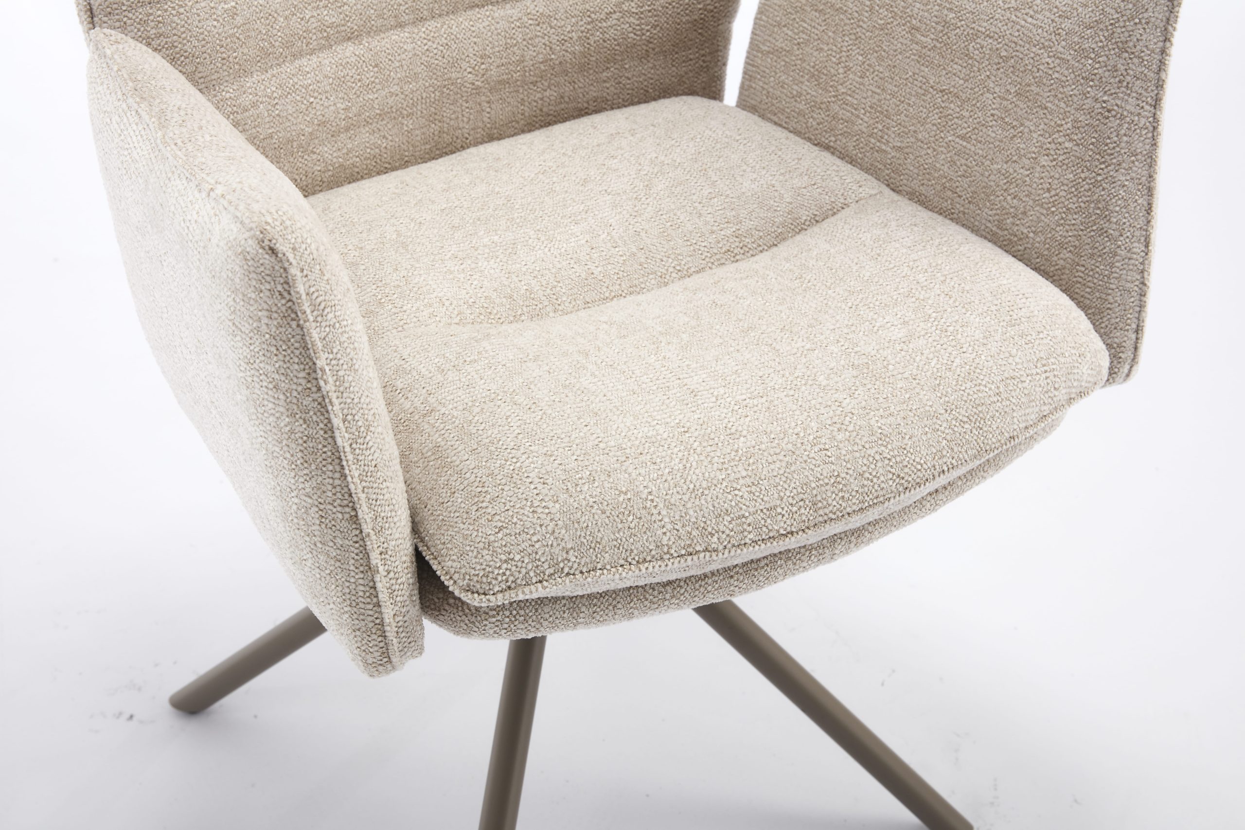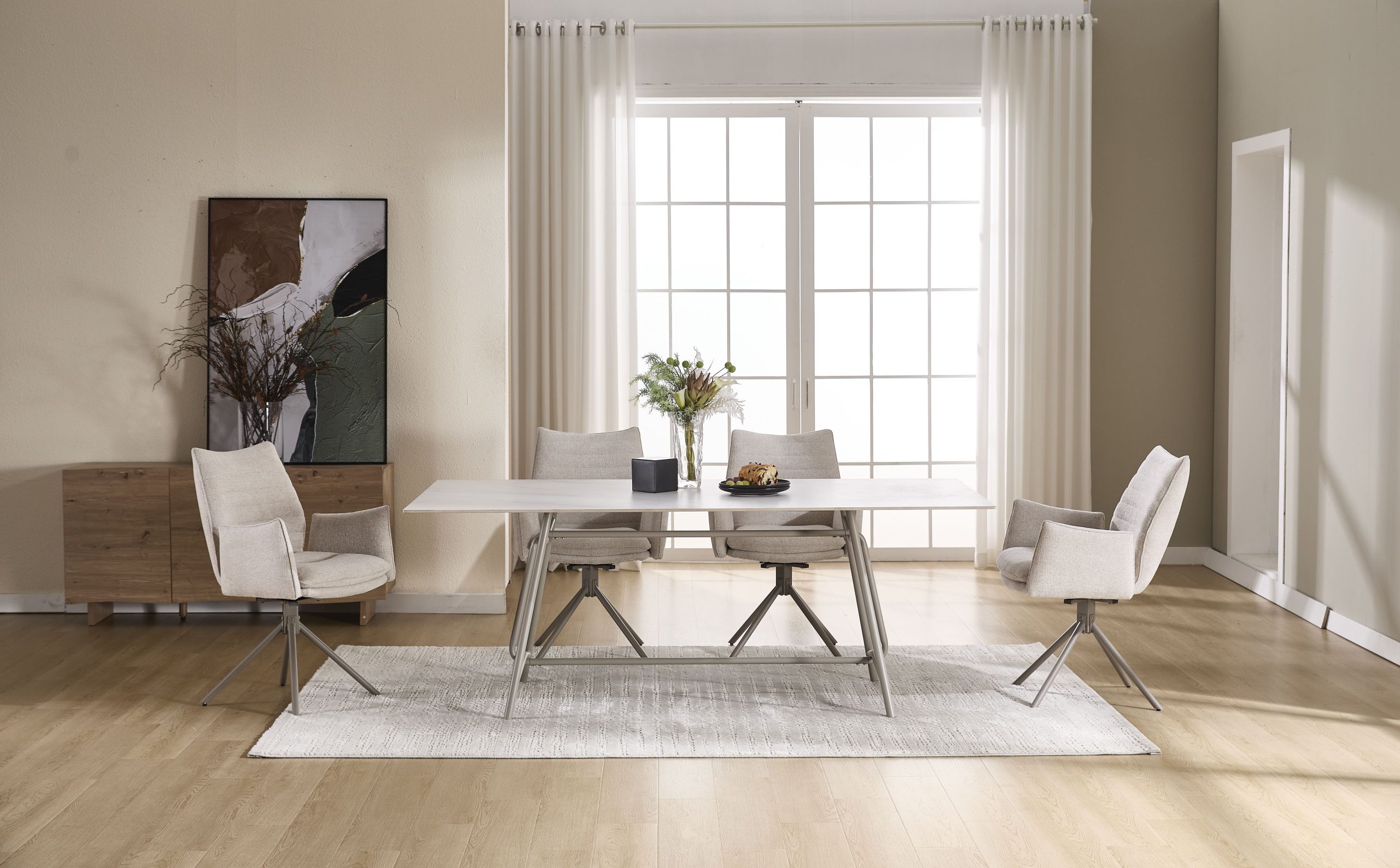 Glavna funkcija stola je 180-stopinjska vrtljiva plošča ki omogoča vrtenje brez napora, za nemoteno premikanje v položaj za sedenje ter vrtenje. Funkcija samodejnega vračanja zagotavlja, da se stol neopazno vrne v prvotno orientacijo, ko ni v uporabi, ter ohranja urejen in organiziran jedilni prostor. Stol je opremljen tudi z ergonomskimi nasloni za roke, ki zagotavljajo dodatno oporo in povečujejo udobje med dolgimi večerjami ali družabnimi srečanji.