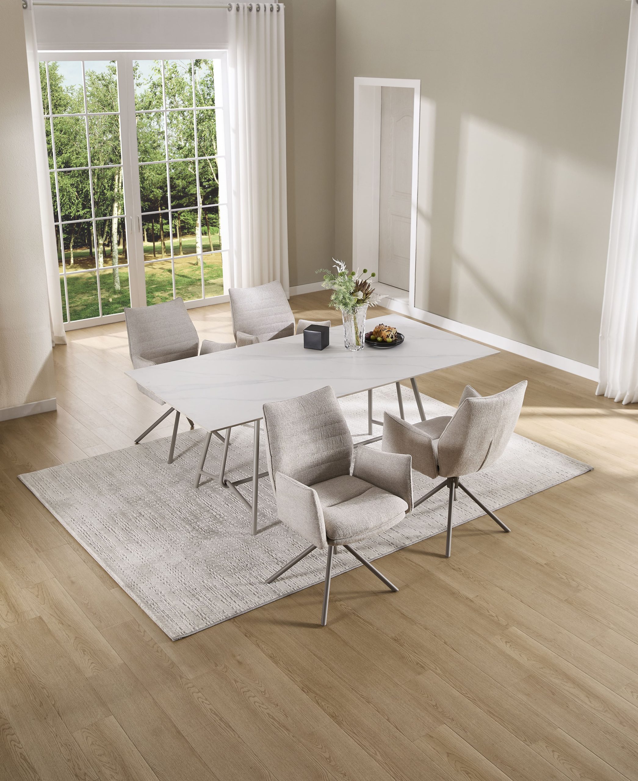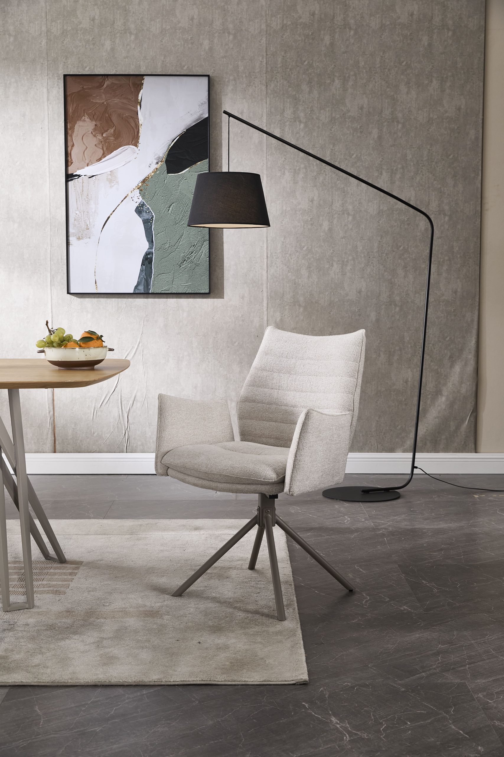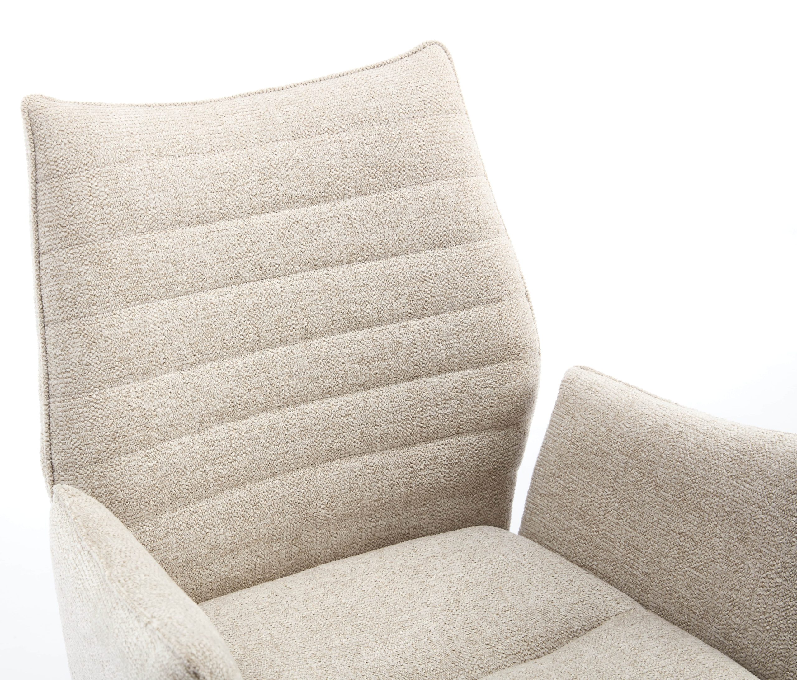 Oblazinjen jedilniški stol, oblečen v visokokakovostno bež tkanino ki zagotavlja mehko in udobno sedenje, z vodoravnimi okrasnimi šivi po naslonu za hrbet, za privlačen pridih moderne estetike. Nevtralna barva oblazinjenja dopolnjuje različne nastavitve jedilnice, zaradi česar je vsestranska izbira za sodobno in klasično notranjost.