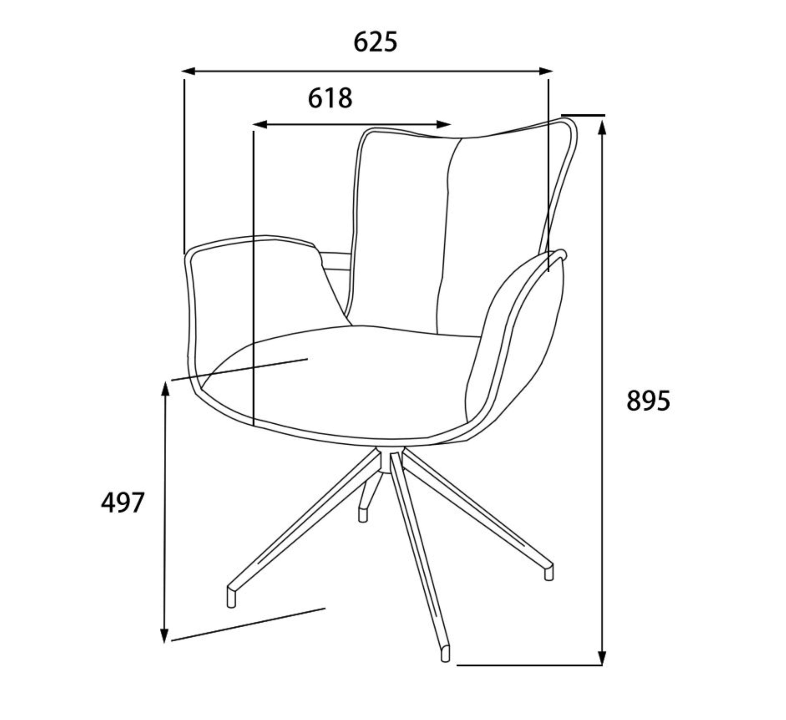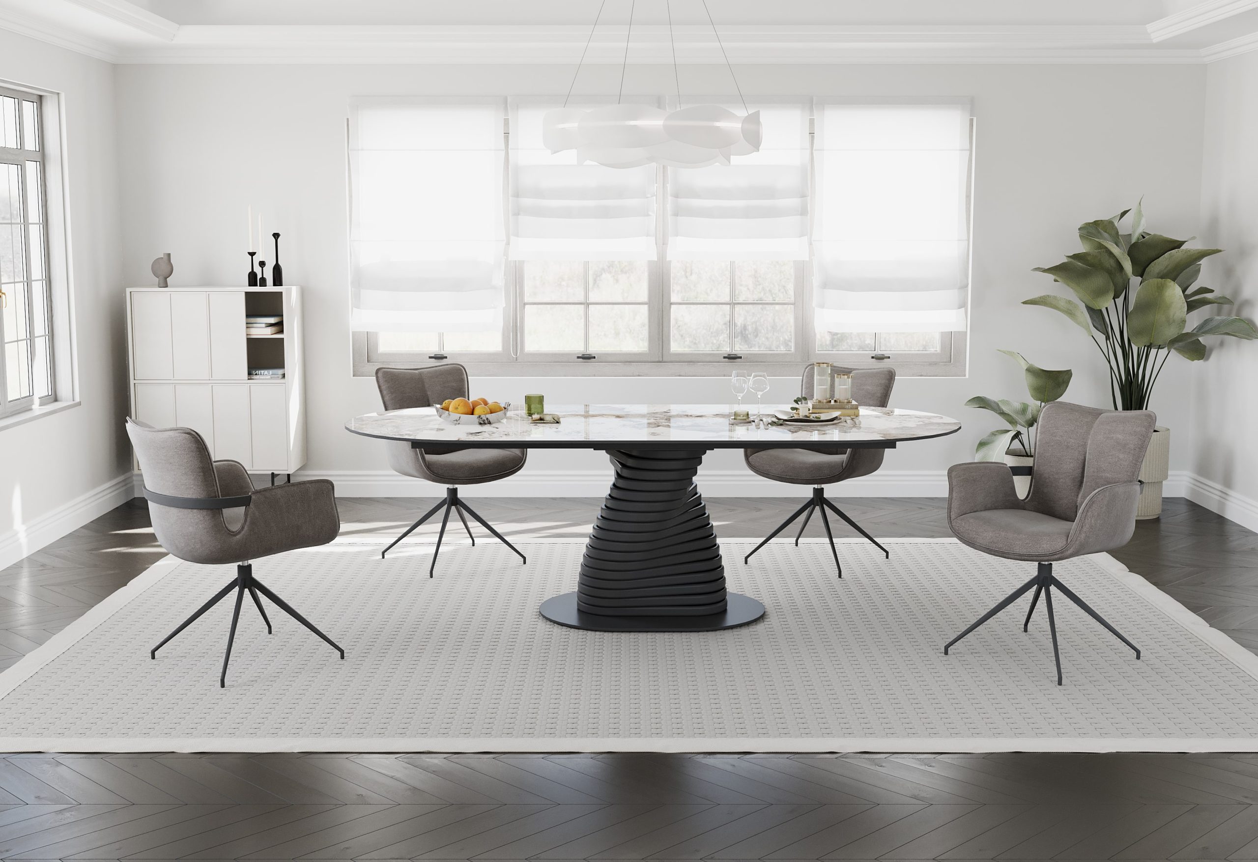 Jedilniški stol z moderno silhueto, kombinirano z vrtilno funkcijo z avtomatskim vračanjem ter mehkim oblazinjenjem, za dodatek k različnim notranjim prostorom.