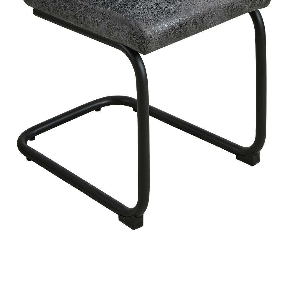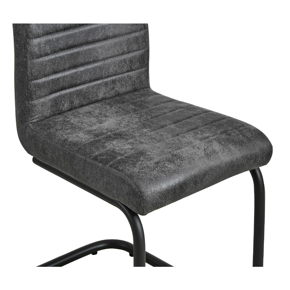 Preprost jedilniški stol, na voljo v antracit barvi. Po sedežu in hrbtišču je oblazinjen s kvalitetno tkanino iz mikrovlaken. Sedišče je debelo 7 cm, globoko 41 cm in je na višini 49 cm od tal. Oblazinjeno hrbtišče stola je opremljeno z ročajem za preprosto premikanje in prešito z okrasnimi vzporednimi šivi. Podnožje stola je narejeno iz okroglih kovinskih cevi, premera 2,5 cm in s svojim dizajnom omogoča razporeditev teže na večjo površino, da preprečuje  poškodbe talnih površin. Za boljšo zaščito je podnožje prašno lakirano v črno barvo. Maksimalna nosilnost stola je 120 kg.